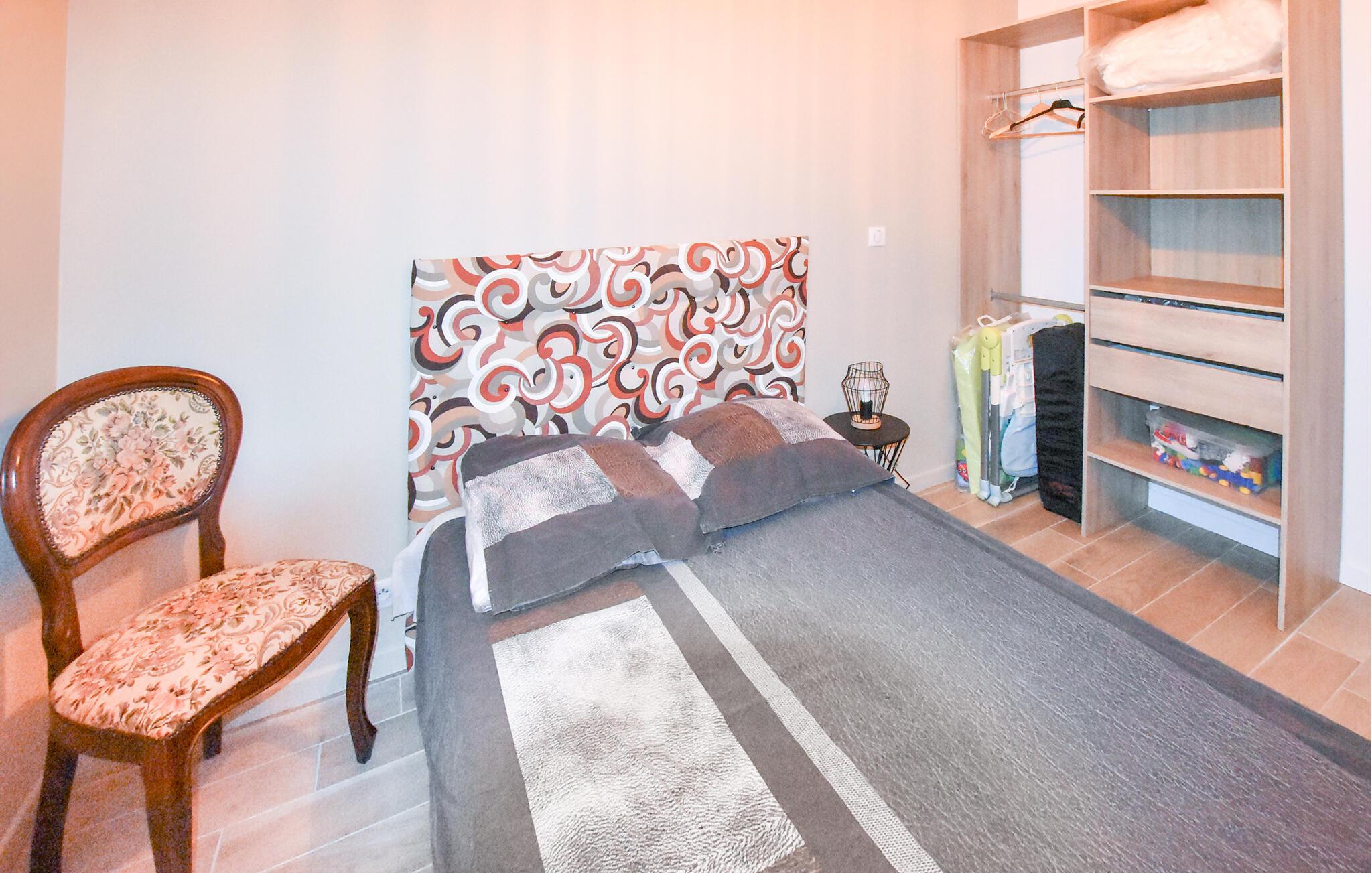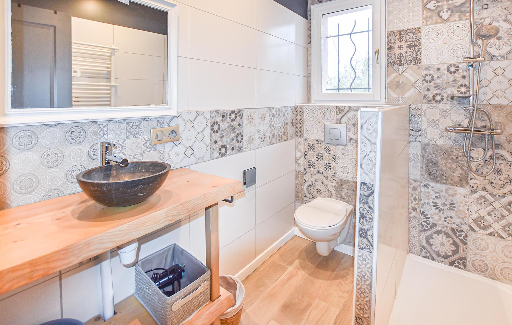 Genießen Sie den Innenbereich, der hell, gepflegt und funktional eingerichtet ist. Nehmen Sie Platz im gemütlichen Wohnraum mit bequemen Sesseln und Sofa und kommen Sie bei einem Buch oder einem Gespräch zur Ruhe. Nutzen Sie den kleinen Couchtisch für einen Aperitif am Abend. Bereiten Sie Ihre Mahlzeiten in der praktisch gestalteten Küche zu. Kochen Sie regionale Produkte aus der Provence und frühstücken Sie am angrenzenden Tresen mit Barhockern.
