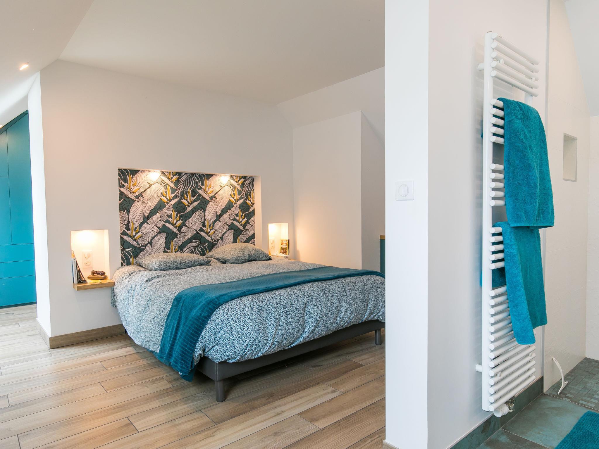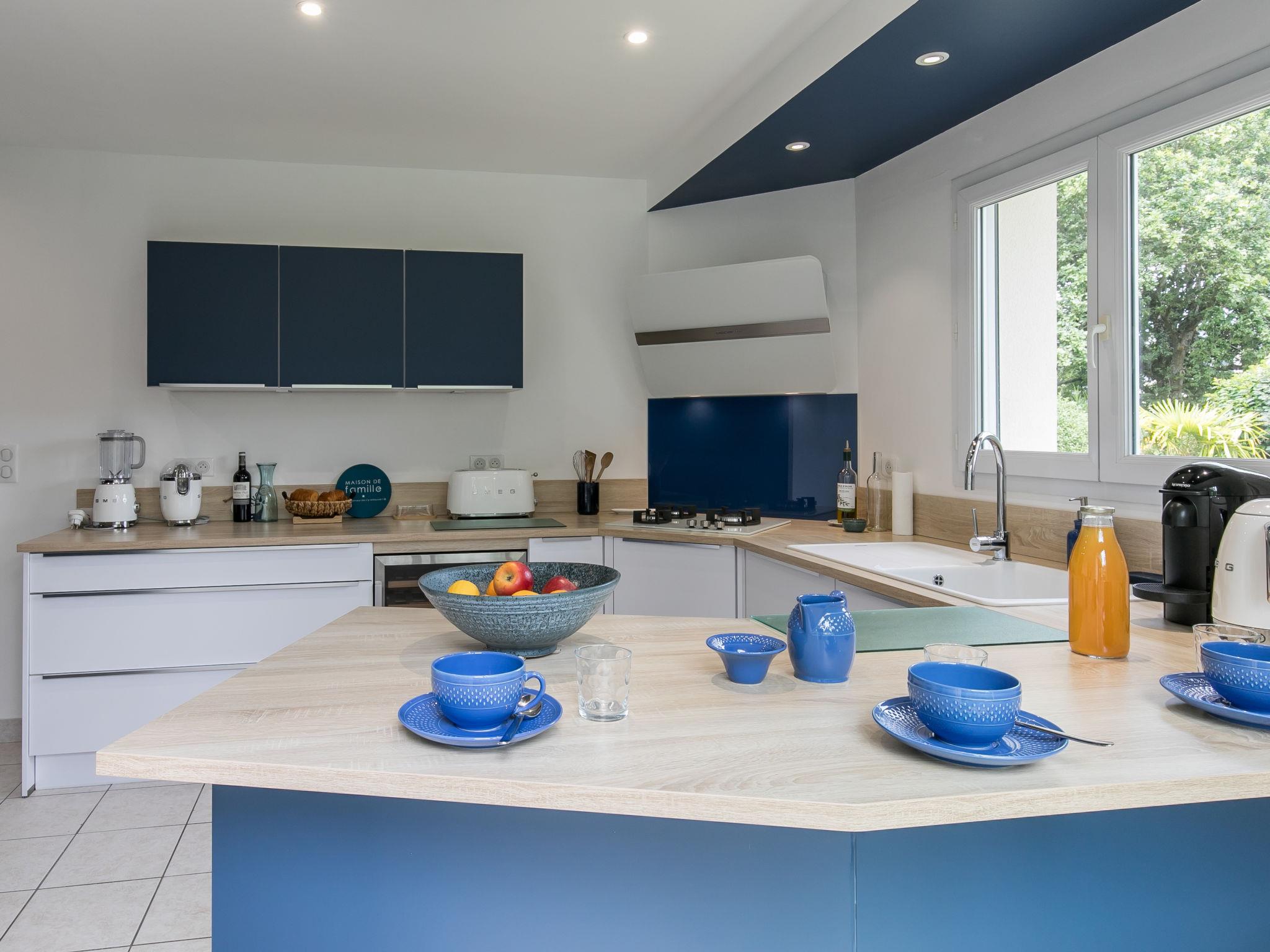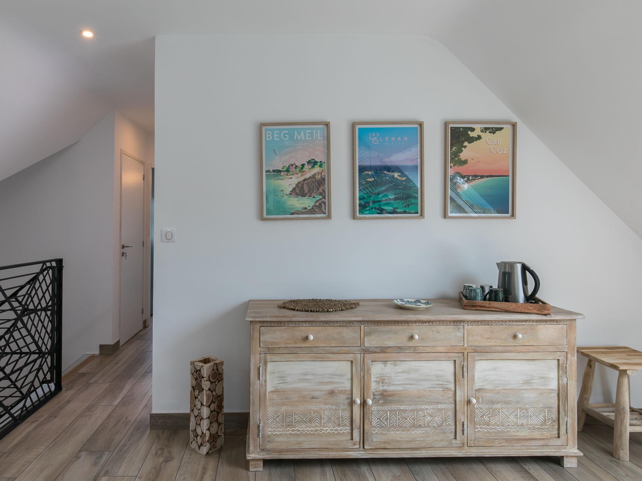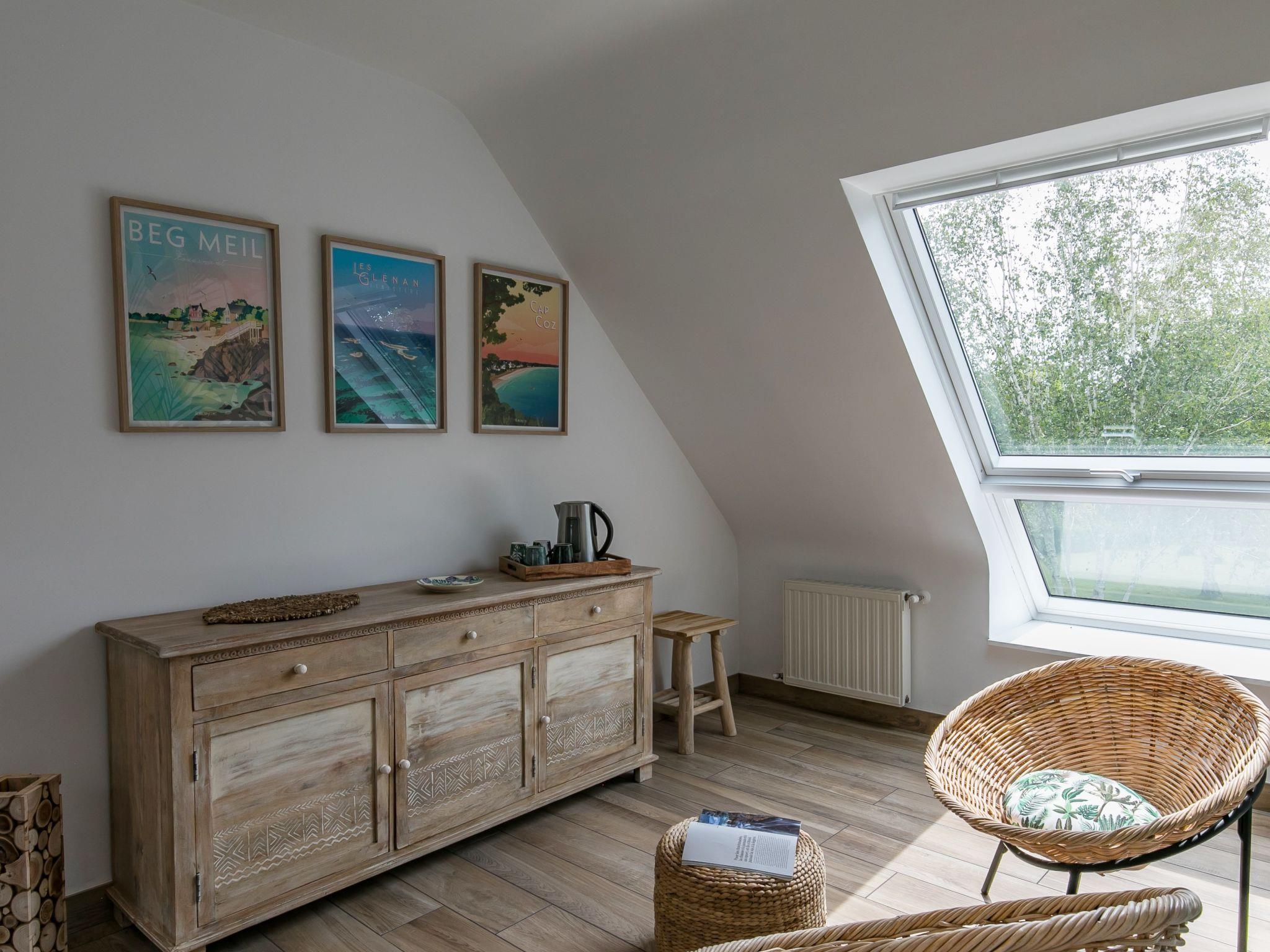 Very beautiful, luxurious house "L'échappée". In the district of Mousterlin 4.3 km from the centre of Fouesnant, 16 km from the centre of Quimper, 2.4 km from the sea, 2.4 km from the beach. Private: property 1'500 m2, well-kept garden, parking (for 2 cars) on the premises. Shop 4 km, grocery 4 km, shopping centre 5.5 km, restaurant 1.8 km, bakery 1.4 km, bus stop 1.3 km, sandy beach "Plage et Dunes de Kerler" 2.4 km, thermal baths "Thalasso benodet" 5.5 km. Marina 10 km, golf course (18 hole) 4.3 km, surf school 5 km, sailing school 7 km. Nearby attractions: Benodet,départ Odet,Archipel des Glénans 6 km, Le Cap Coz 7.5 km, Concarneau et Ville Close 15 km, Pont Aven 29 km, Pointe de la Torche 28 km, Locronan 34 km. Hiking paths: GR34, sentier des douaniers 2 km.