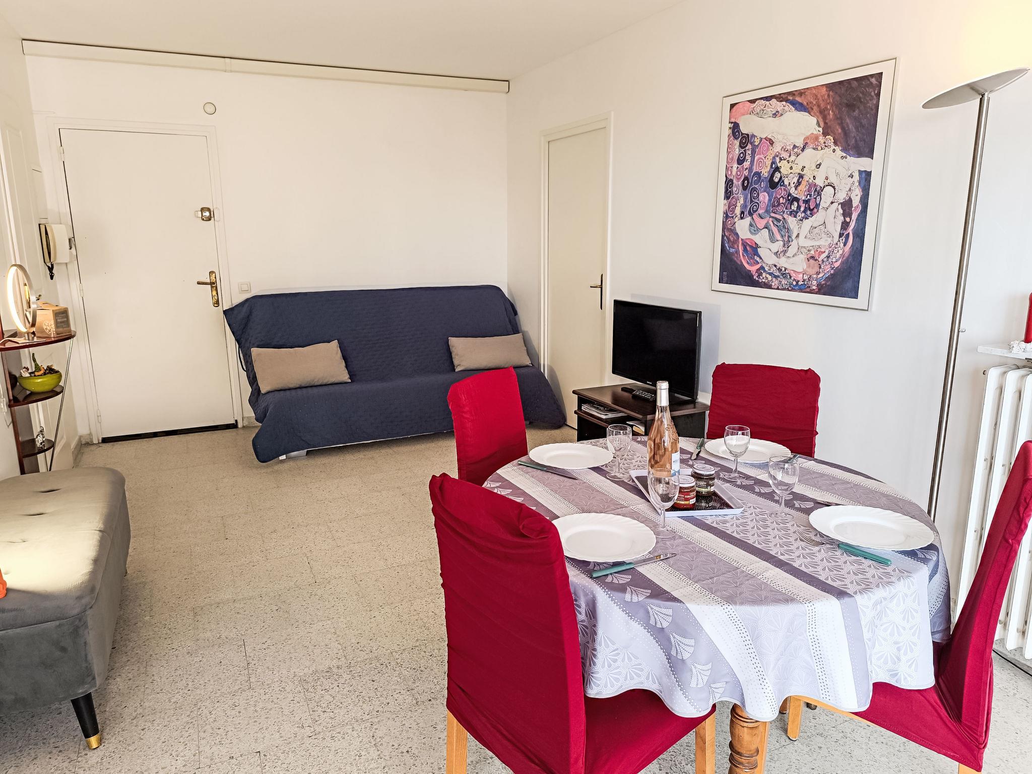 2-room apartment 43 m2 on 3rd floor. Living/dining room with 1 double sofabed (1 x 140 cm, length 190 cm), TV and air conditioning. Exit to the terrace. 1 room with 1 french bed (1 x 160 cm, length 200 cm), electric heating and air conditioning. Exit to the terrace. Open kitchen (4 hot plates, dishwasher, toaster, kettle, microwave, freezer, electric coffee machine, Capsules for coffee machine (Nespresso) extra). Shower/WC. Terrace 5 m2. Terrace furniture. Beautiful view of the sea. Facilities: washing machine, hair dryer. Internet (WiFi, extra). Garage space n 97 at 300 m, height 185 cm, width 218 cm. Please note: non-smokers only. Smoke alarm, no lift.