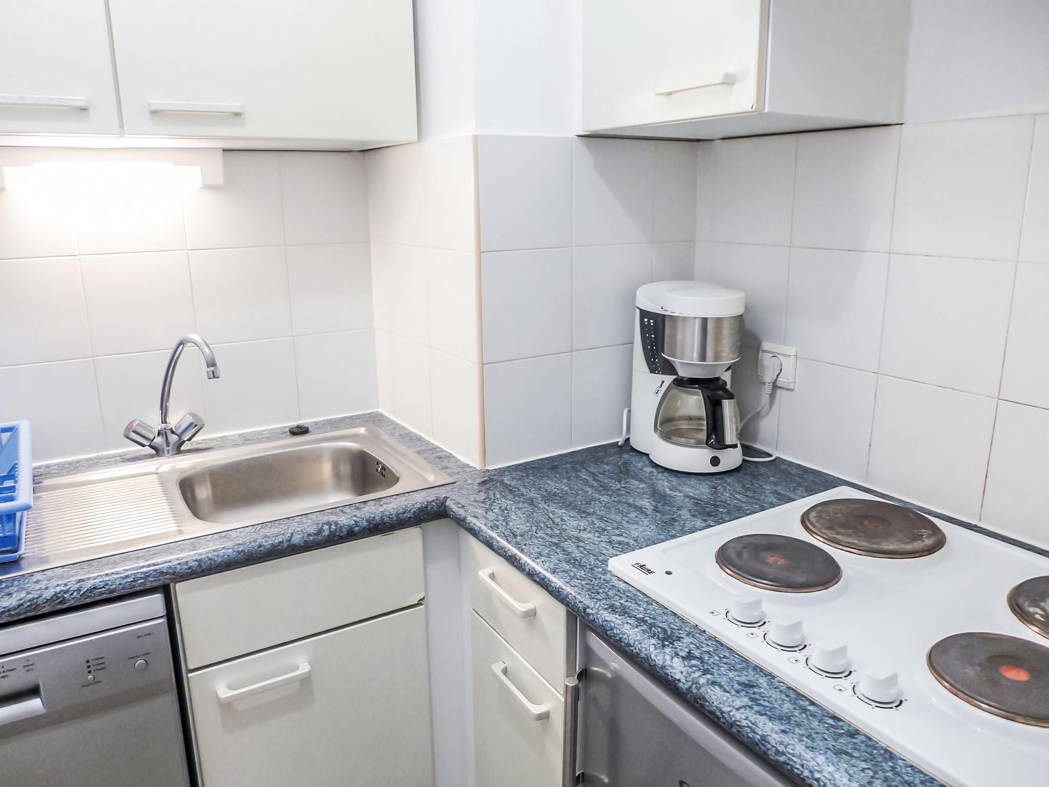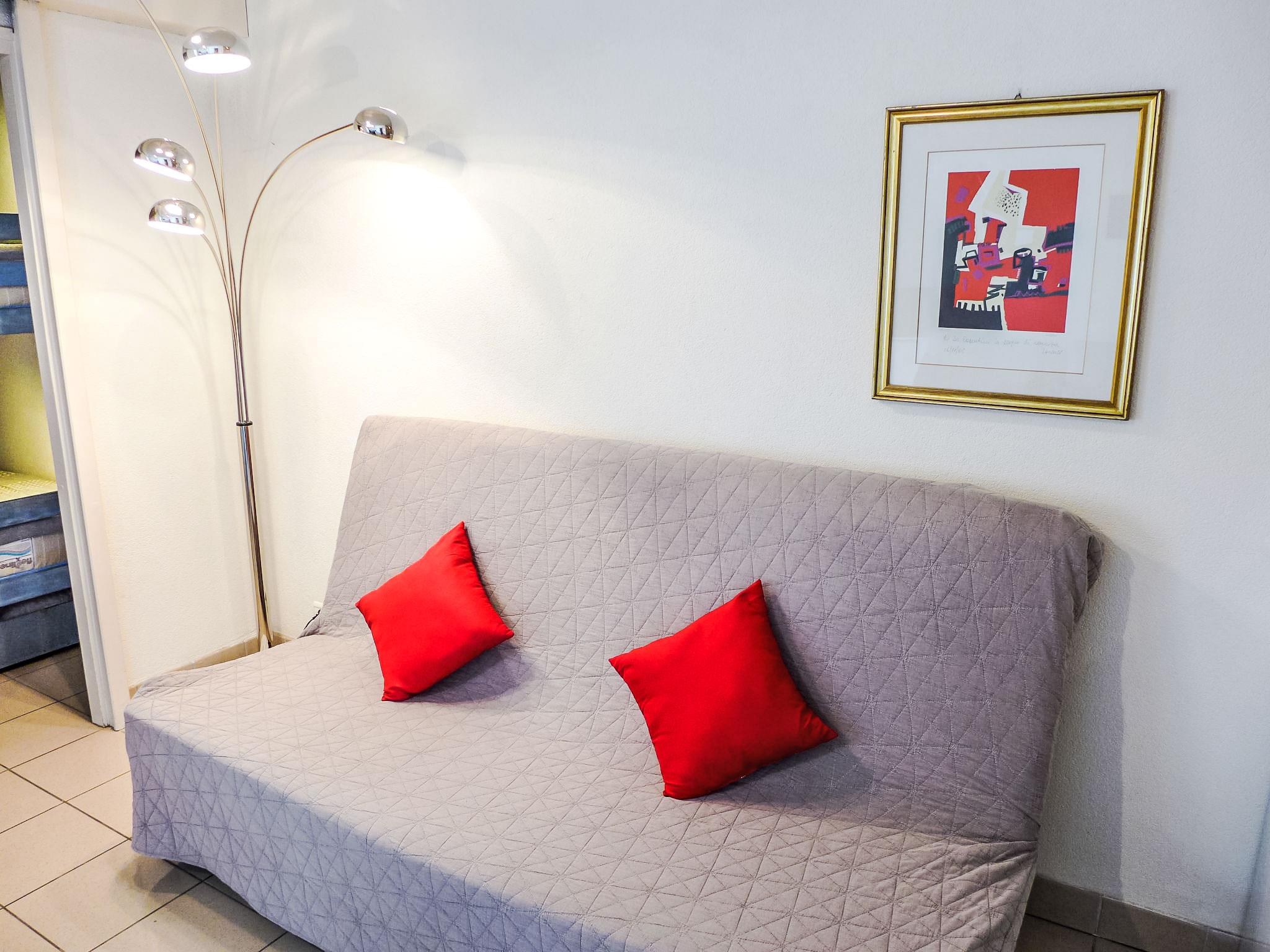 1-room studio 33 m2 on 4th floor. Object suitable for 2 adults + 2 children. Living/dining room with 1 double sofabed (1 x 140 cm, length 190 cm), dining table and TV. Exit to the terrace. Alcove with 1 x 2 bunk beds (80 cm, length 190 cm). Kitchenette (4 hot plates, oven, dishwasher, electric coffee machine). Shower/bidet/WC. Terrace. Terrace furniture. Beautiful view of the sea and the port. Facilities: washing machine, iron. Internet (WiFi, extra). Garage space n 89/90 (1 car), height 180 cm, width 215 cm. Please note: non-smokers only, parking space for small car only. Smoke alarm. Offer by a private individual according to Art. 155, IV of CGI.
