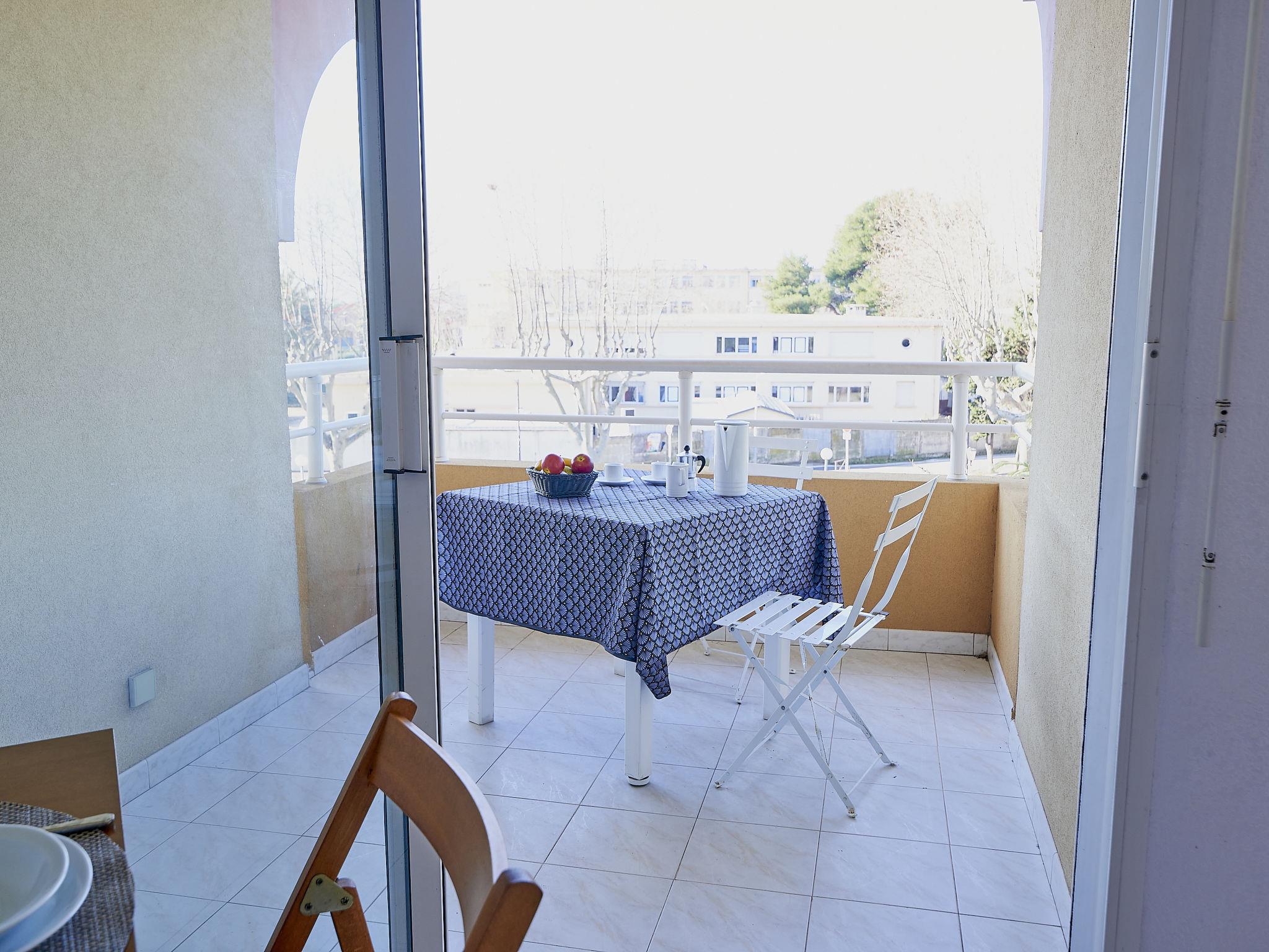 1-room studio 30 m2 on 2nd floor. Object suitable for 2 adults + 2 children. Living/dining room with 1 double sofabed (1 x 140 cm, length 190 cm), TV (flat screen). Exit to the terrace. Alcove with 1 x 2 bunk beds (90 cm, length 190 cm), electric heater. Kitchenette (2 ceramic glass hob hotplates, toaster, kettle, microwave, electric coffee machine). Shower/WC. Terrace 4 m2, south-east facing position. Terrace furniture. Partial view of the sea. Facilities: Internet (WiFi, extra). Garage space n G16. Please note: non-smokers only. Smoke alarm. Offer by a private individual according to Art. 155, IV of CGI.