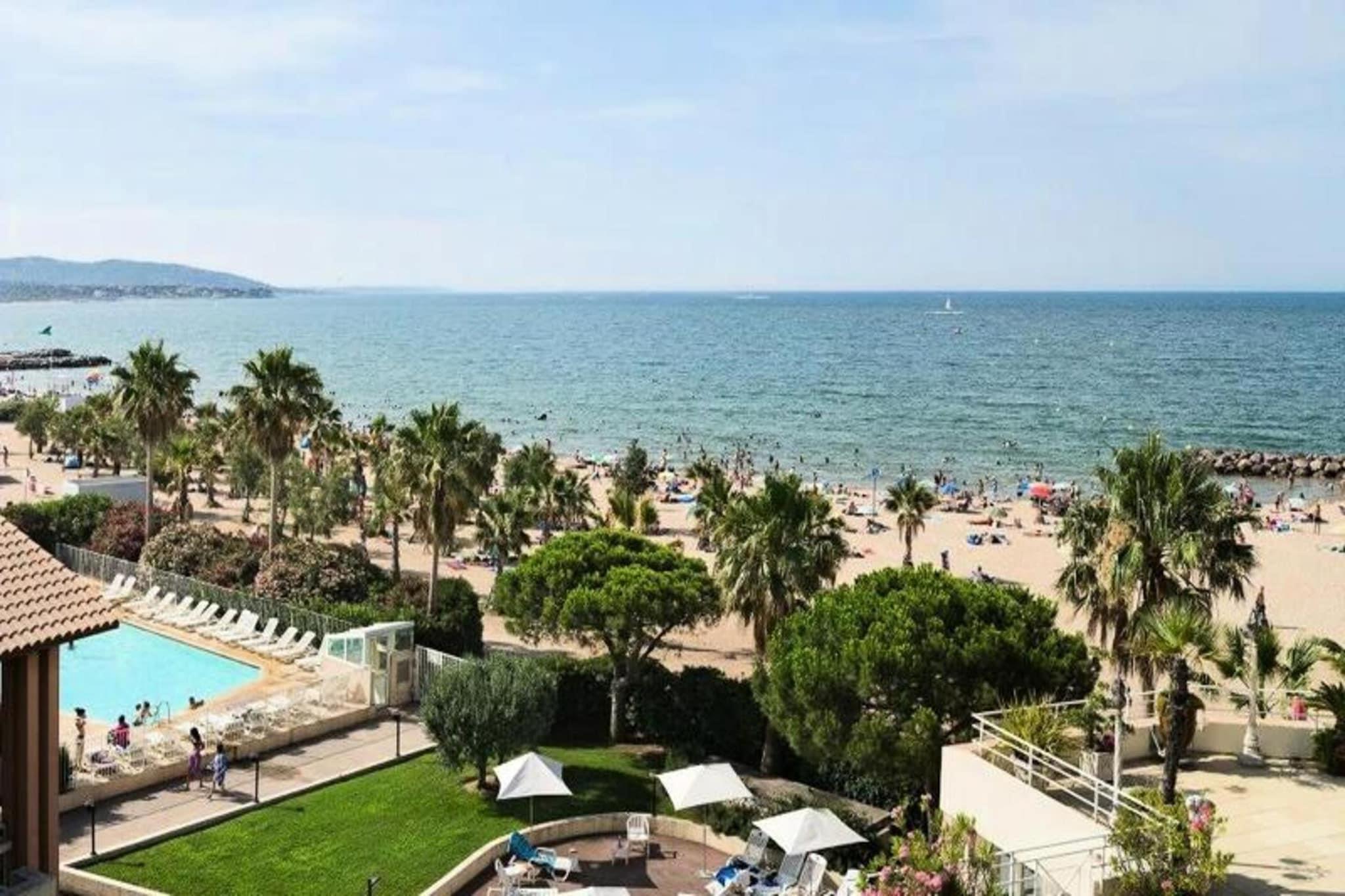 This vacation rental offers a comfortable two-room apartment perfect for up to 4 people. It includes a living room with a cozy sofa, a bedroom, a kitchen area, a bathroom, and a separate toilet. The apartment is pet-friendly with a small additional fee, making it ideal for travelers who wish to bring their pets along. For convenience, parking is available, and essential services such as bed linen and a maintenance kit are provided, though additional charges may apply for some services like bathroom linens and end-of-stay cleaning. Located just 50 meters from the beach and a few steps from the Fran?ois L?otard nature base, this residence offers an unbeatable location in the heart of the pedestrian district of Fr?jus. Nearby attractions include the marina, cafes, markets, and various shops, making it a great base for exploring the city. The vibrant atmosphere of the area provides plenty of options for dining and entertainment, while the marina is ideal for enjoying the view and strolling by the water. The apartment is well-equipped for a comfortable stay, including a fully functional kitchen area with essential appliances. The outdoor swimming pool, open from June to September, adds to the relaxation, offering a place to cool off and unwind. Additional amenities include a covered parking space (subject to availability) and the option for extra services like WiFi or bed linen rental. A mandatory end-of-stay cleaning service ensures a hassle-free departure.
