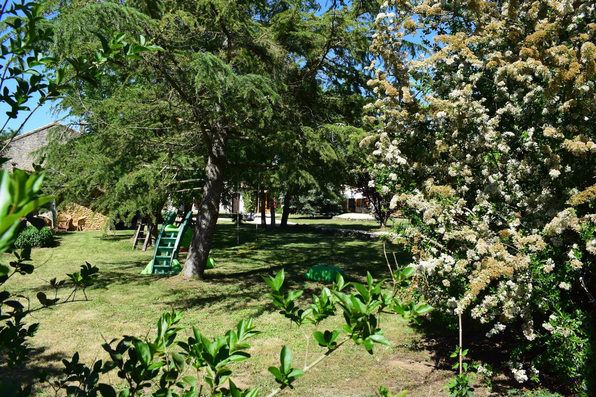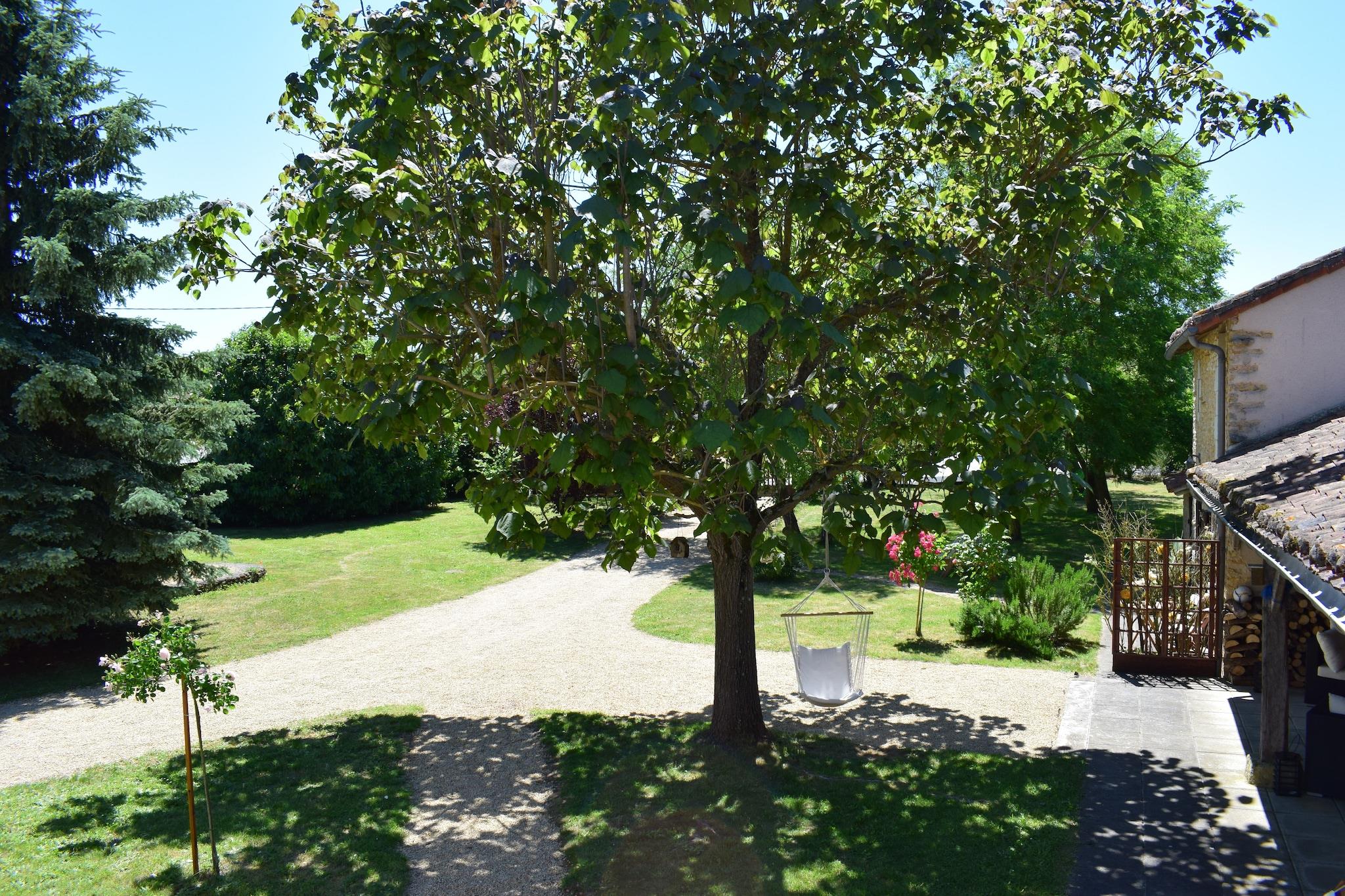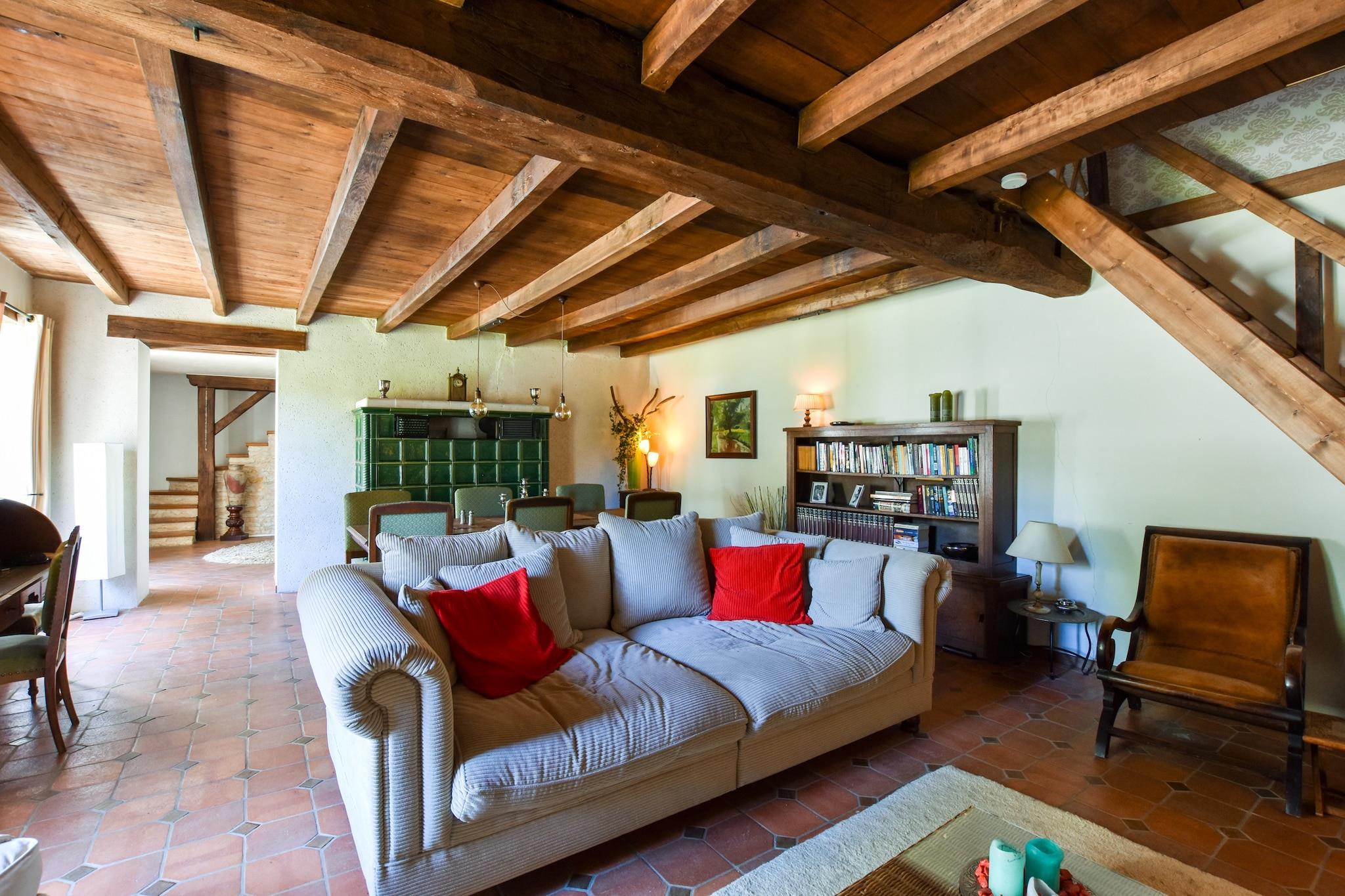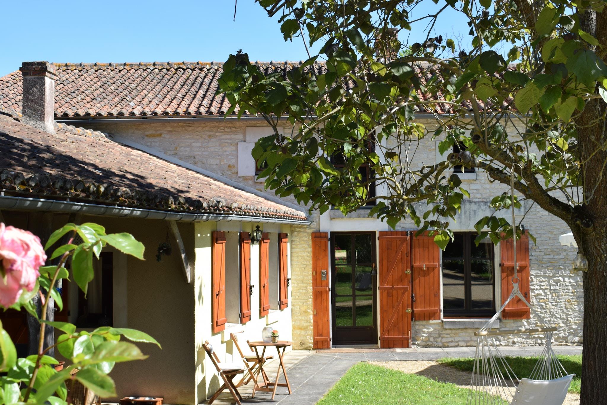 Set in the tranquil surroundings of rural France, this charming holiday home offers a relaxed countryside escape where space, comfort, and nature come together effortlessly. It’s a place where mornings begin quietly and days unfold at your own pace, surrounded by greenery and open skies. Designed for up to eight guests, the home features a spacious and welcoming layout across two levels. The ground floor includes a bright living room with generous seating, a fireplace, TV, and dining table, along with a large, fully equipped kitchen fitted with a hob, oven, microwave, dishwasher, fridge, and coffee machine. Upstairs, four thoughtfully arranged bedrooms include two double bedrooms and two walk-through rooms with a mix of single and small double beds, offering flexibility for families or groups. Two bathrooms - one with a bathtub and another with a shower and toilet - along with additional toilets, ensure convenience for all guests. Outdoors, a private covered terrace of 50 m² creates the perfect setting for long meals and relaxed evenings, while the expansive shared garden of over 1000 m² offers plenty of space to unwind. Guests also have access to a heated seasonal swimming pool, barbecue facilities, garden furniture, and children’s play equipment, making it especially suited for family stays. Additional amenities such as Wi-Fi, a washing machine, parking, and a children’s bed add to the comfort. The surrounding area invites cycling, nature walks, and visits to nearby villages, offering a peaceful yet engaging countryside experience.
