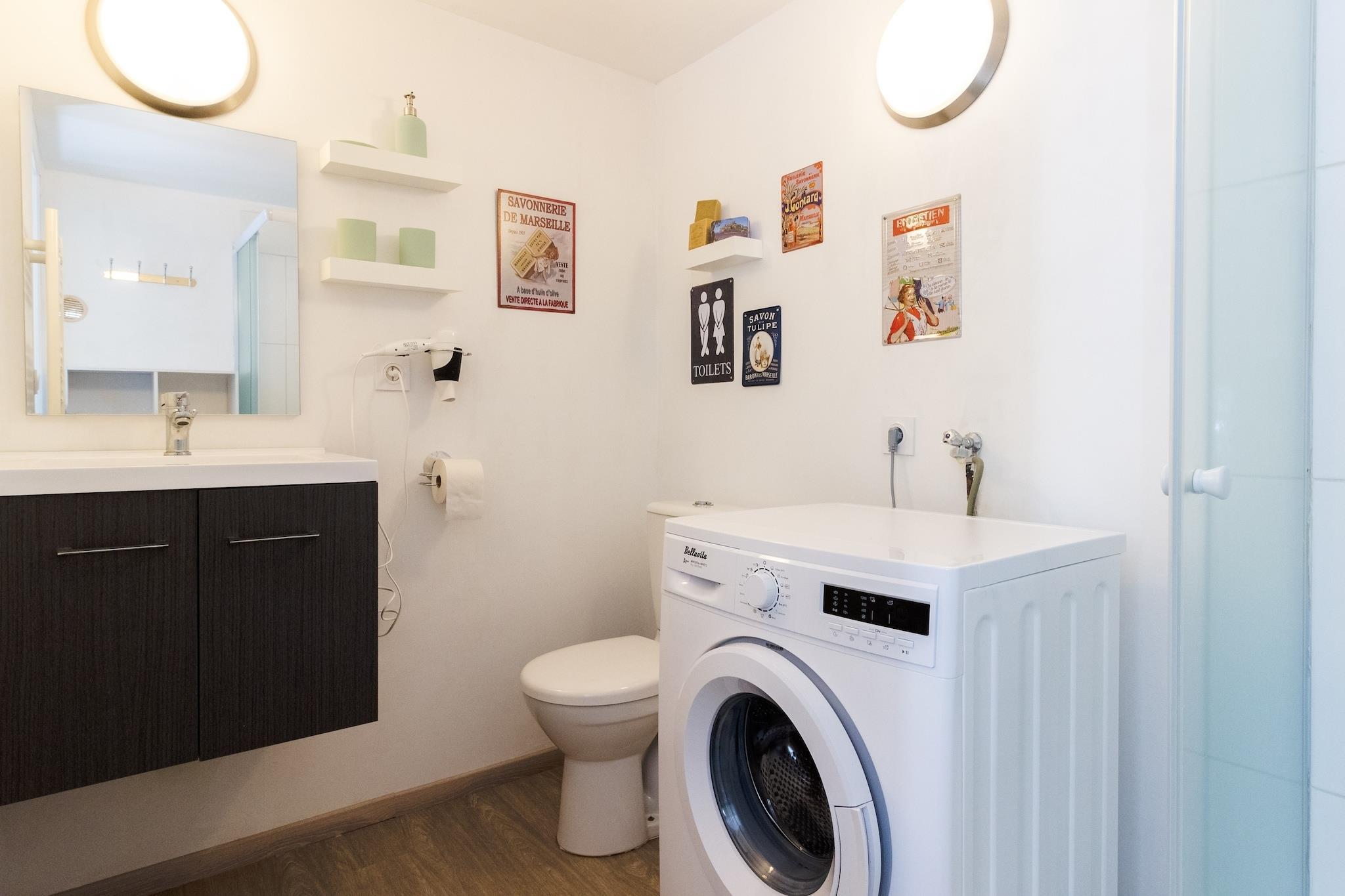 Ground floor: (Living room(seating area), dining room(dining table(4 persons)), Kitchen(boiling water tap, toaster, coffee machine, espresso machine, oven, grill, microwave, fridge), bedroom(double bed(180 x 200 cm), cot), bedroom(double bed(160 x 200 cm)), bathroom(shower, toilet, washing machine)) balcony or terrace, garden(private, 50 m2), garden(shared with other guests, 100 m2), bicycle storage, garden furniture, sun loungers, BBQ, parasol, swimming pool(shared with the the owner and other guests, opened from May upto and including Sep), boules court