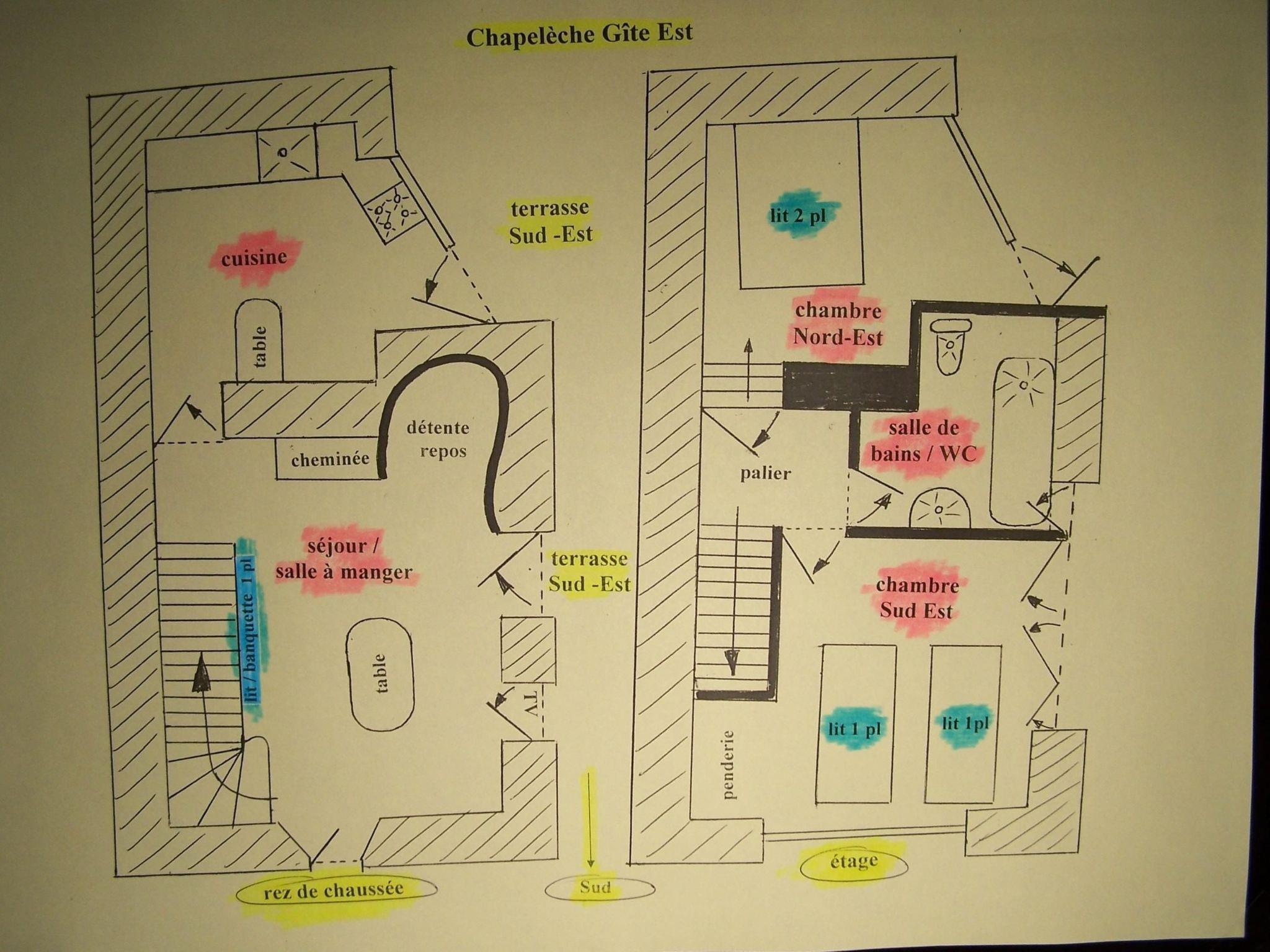 This chalet is in a wonderful location on the south-facing slope of a hill at an altitude of 710 metres in the heart of the Monts d'Ardèche Regional Nature Park. It offers a beautiful view of the wild and romantic Glueyre valley, whose picturesque granite rock formations have been sculpted by nature. The house is reached via a cobbled road (beware: dead end). Far from the noise of traffic and surrounded by nature, you can enjoy absolute peace and quiet here. The only other inhabitants of the hamlet are the owners. They live in the other wing of the semi-detached stone house dating back to 1342, which they have lovingly restored, combining modern facilities with traditional Ardèche farmhouse features. The part presented here has a separate entrance, offers 95 m² of space and can accommodate up to seven people. It has three bedrooms. The bedrooms on the first floor each have a double bed (140 x 200 cm). The second bed is a bunk bed suitable for children aged six and over. This room has a shower room with WC. The bedroom on the third floor has two single beds (80 x 200 cm and 90 x 200 cm) that can be pushed together if required. The third bedroom with a double bed (140 x 200 cm) is also located on this level. The living room is furnished with a reading area, sofa bed, armchair and dining table. The bathroom has a bath, washbasin and WC. The kitchen on the second floor is fully equipped.