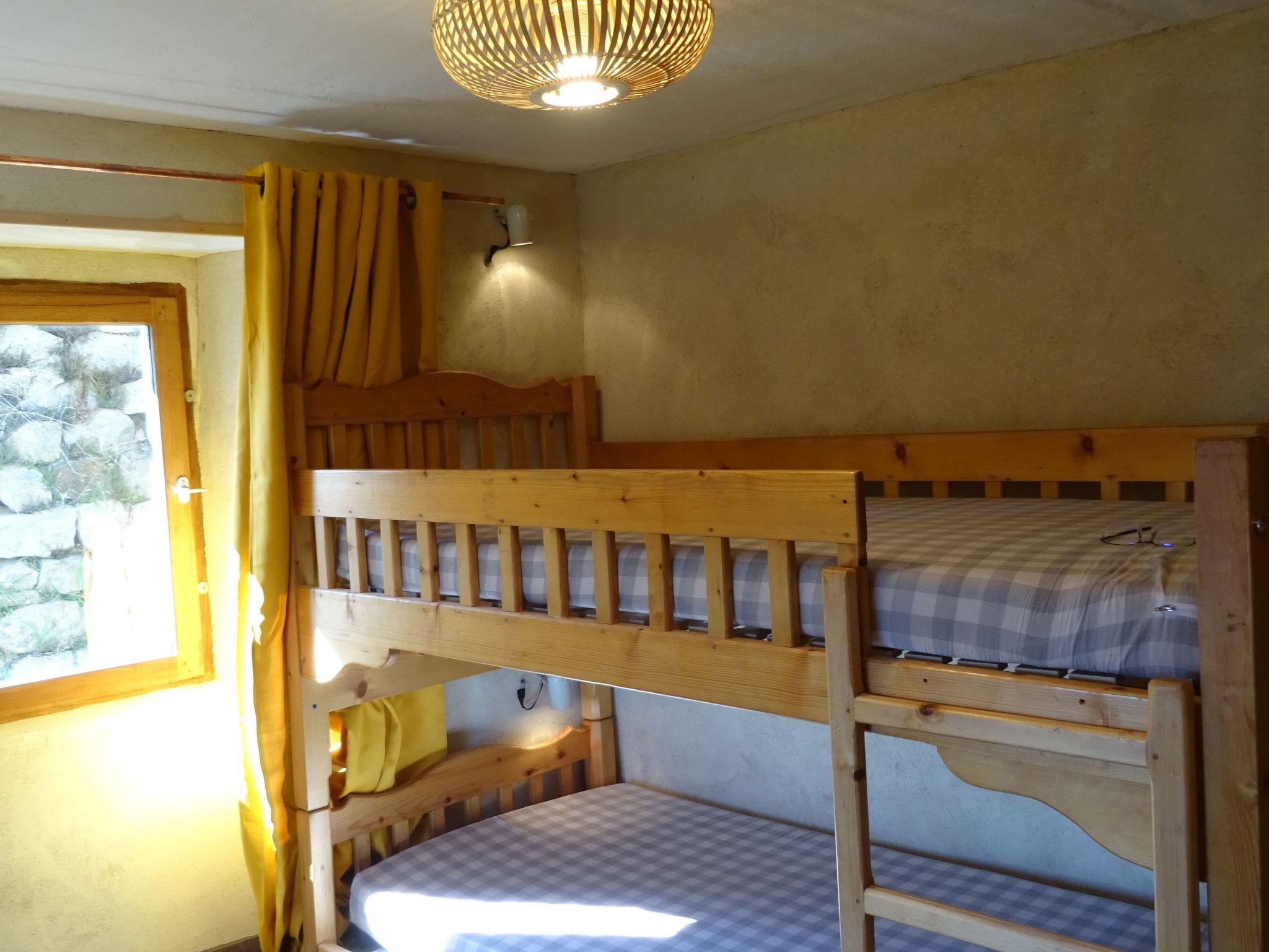 - an 8 m² bedroom under the terrace with 2 single bunk beds (length: 200 cm, width: 90 cm), a small school desk, a chest of drawers and a corner washbasin with hot and cold water. This room is accessible from the outside, either through a door leading to the living room on level 1 described below.