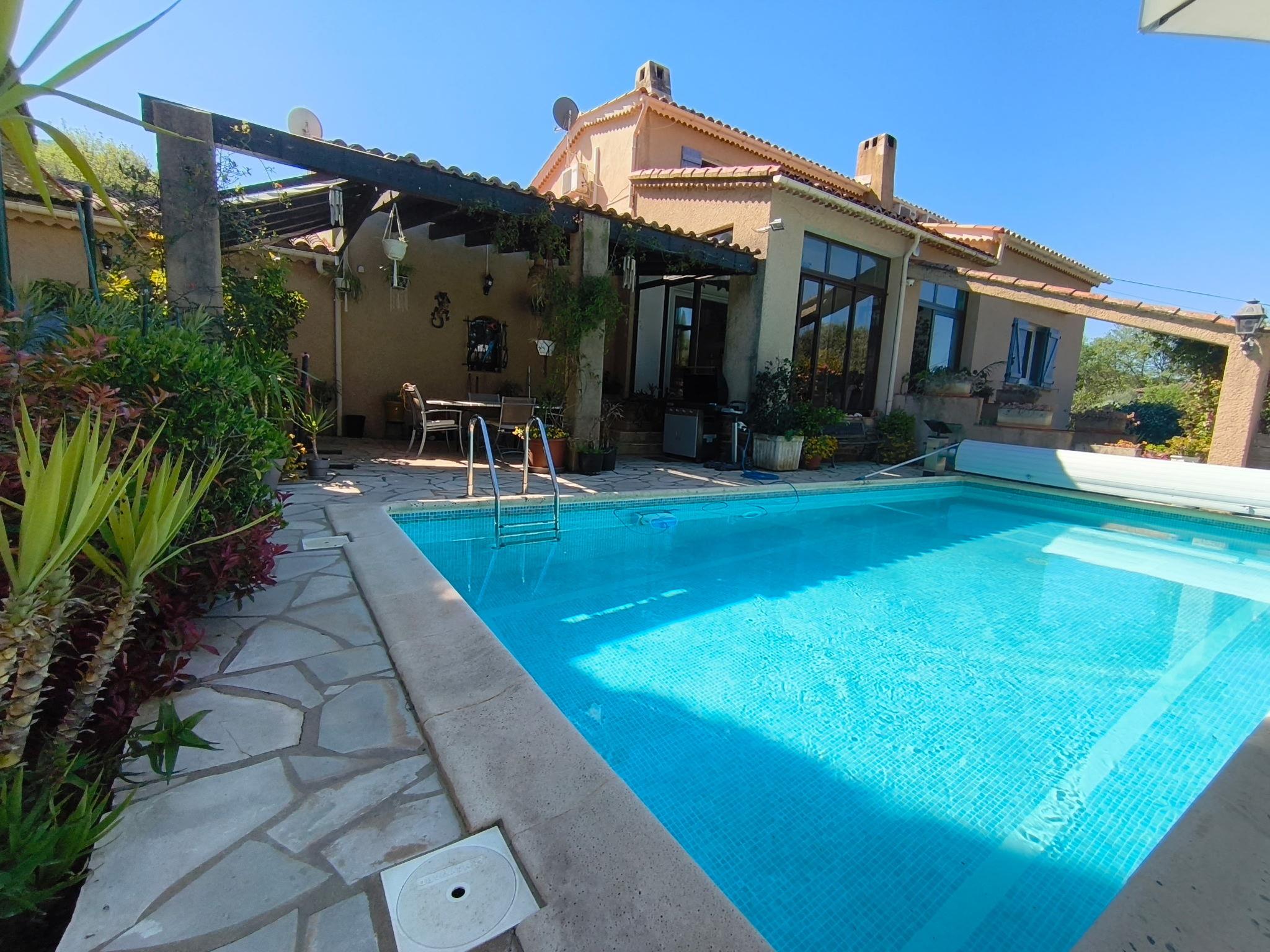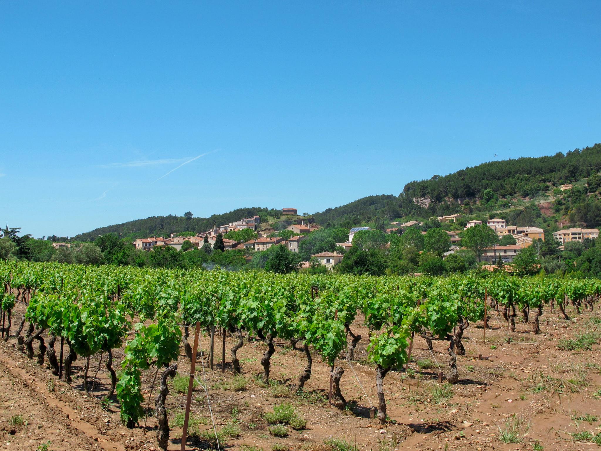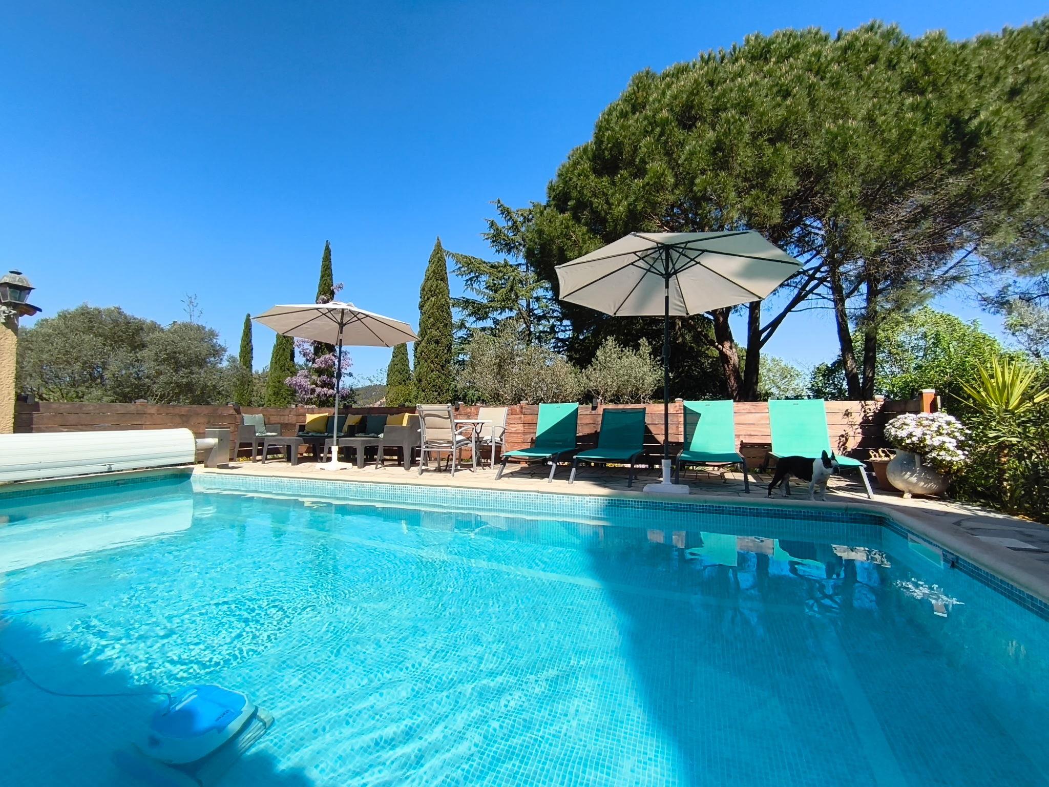 Terraced house, surrounded by trees, fields and vineyards. 2 km from the centre of Gonfaron, 12 km from the centre of Le Luc, 43 km from the centre of Toulon, in a sunny position in the residential district, 35 km from the sea. For shared use: natural state property 2'400 m2 (fenced). Private: swimming pool angular (8 x 4 m, seasonal availability: 01.Jun. - 28.Sep.) with shutter cover. Terrace, garden furniture. Bumpy, narrow motor access (400 m via unmade road). Roofed, parking (for 2 cars) on the premises. Shop 2 km, supermarket 3.3 km, shopping centre 10 km, restaurant 2.2 km, bar 2.2 km, bakery 2.2 km, café 2.2 km, bus stop 2.2 km, railway station "Pignans" 8.8 km, sandy beach "Hyères, La Londe" 35 km. Golf course (18 hole) 28 km, riding stable 7 km. Nearby attractions: Sanctuaire Notre Dame des Anges, Abbaye du Thoronet, Gorges du Verdon, Circuit du Var, Cotignac, Vallon Sourn. Well-known lakes can easily be reached: Lac de Carcès (pêche uniquement) 26 km, Lac de Sainte Croix 69 km. Hiking paths: Plaine de Maures, Parc Régional de la Sainte Baume, Gorges du Verdon. The owner does not accept any youth groups. Please note: Owner lives in separate semi-detached house. The owner has a dog. Neighbourhood highly sensitive to noise. Quietness and good behaviour expected.