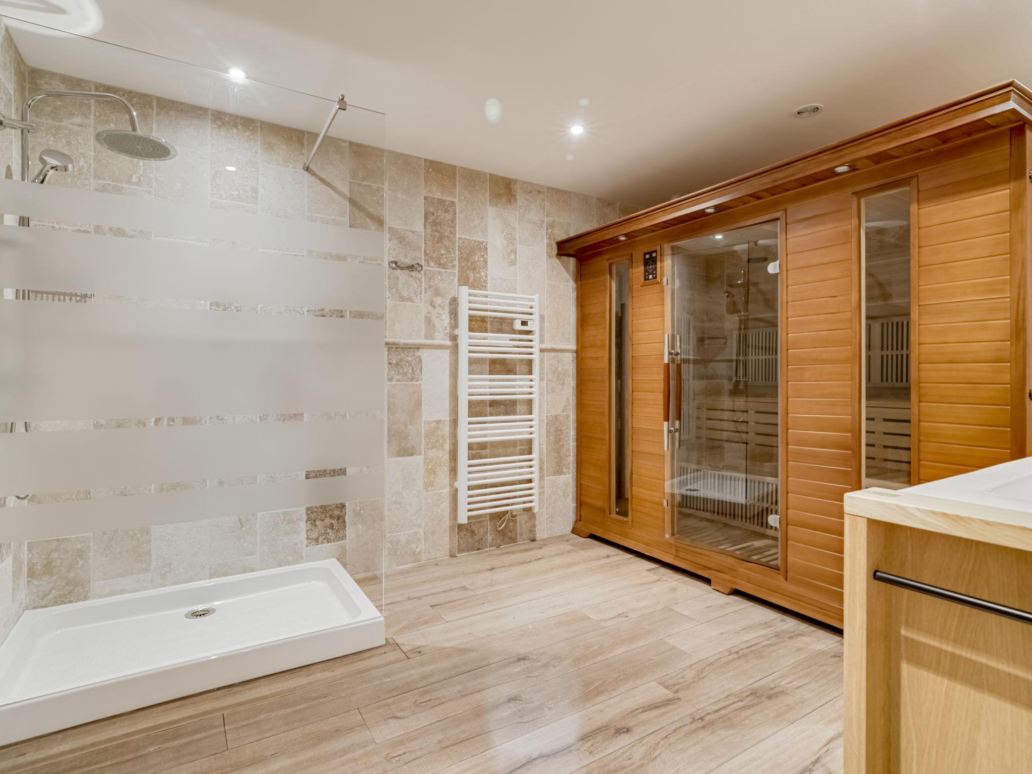 4-room villa 250 m2 on 2 levels. Comfortable and tasteful furnishings: living/dining room with open-hearth fireplace and TV (flat screen). Exit to the garden, to the terrace. 1 room with 1 french bed (160 cm, length 200 cm), bath/shower/WC, double hand-basin, with corner bath and air conditioning. Exit to the garden. Kitchen (oven, dishwasher, 5 gas rings, toaster, kettle, microwave, freezer, electric coffee machine) with dining table. Sep. WC. Upper floor: 1 room with 1 french bed (1 x 180 cm, length 200 cm), bath/shower/WC and air conditioning. Exit to the balcony. 1 room with 1 french bed (1 x 160 cm, length 200 cm), air conditioning. Exit to the balcony. Bath/WC. Electric heating, air-conditioning, boiler (300 litres). Deck chairs (4). Facilities: washing machine, dryer, sauna, safe. Internet (WiFi, free). Parking (roofed, 2 cars). Please note: not suitable for children under 12 years. Smoke alarm. Video surveillance of the entrance and car park. 0606900012739