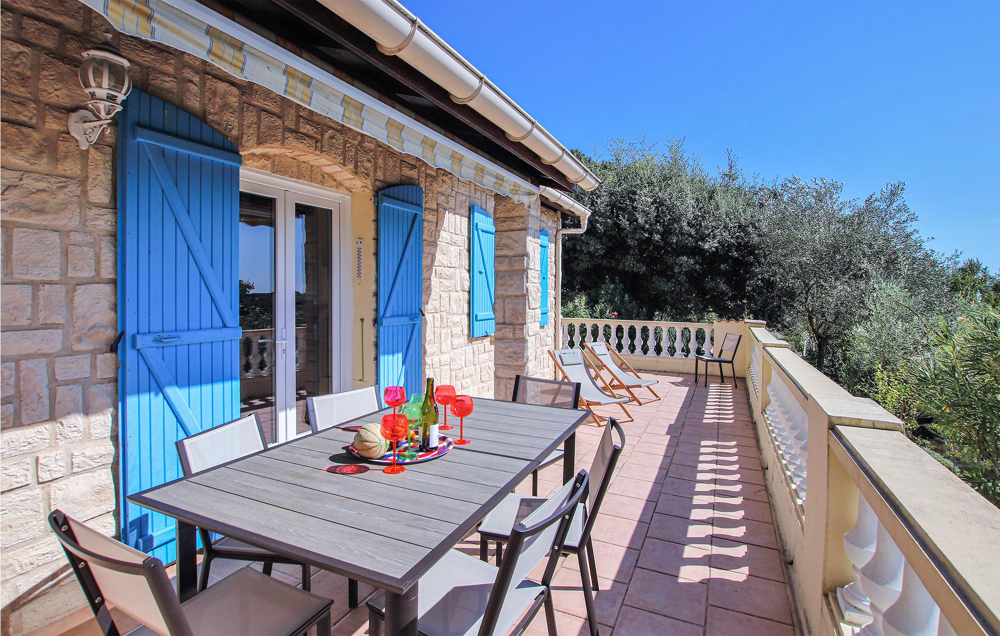 Vom Wohnzimmer aus haben Sie Zugang zur großen, offenen Terrasse, wo Sie am Esstisch jede Mahlzeit im Freien genießen können. Erholen Sie sich nachmittags in den Gartenmöbeln bei einer eisgekühlten Erfrischung. Im privat eingezäunten Garten finden Sie viele Olivenbäume und gepflegte Beete, was ihn zu einem wunderbaren Ort für Ruhe und Erholung macht.