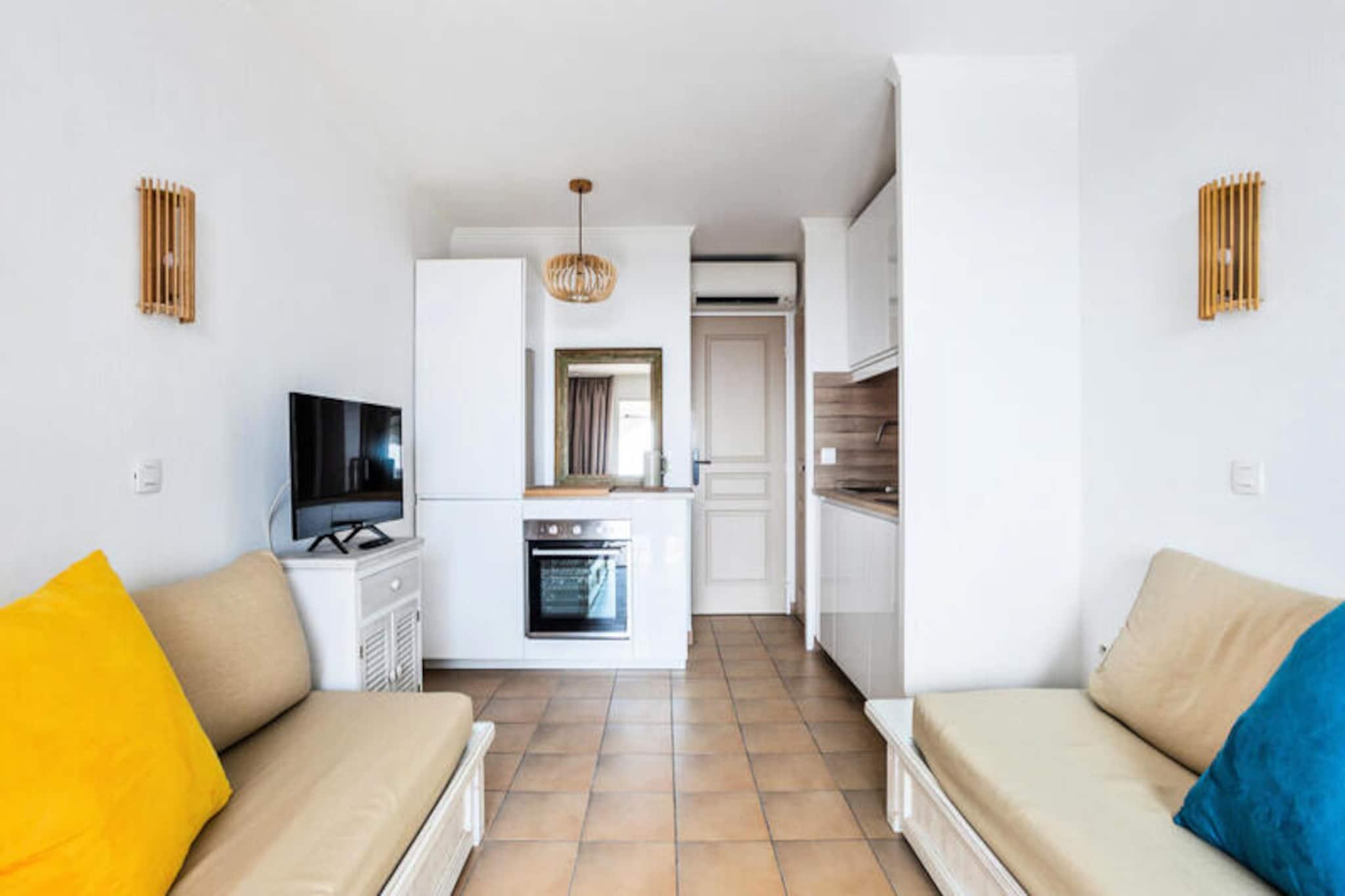 This spacious 2-room apartment can accommodate up to 4 guests and is designed for comfort. It includes a cozy living room, a bedroom, and a bathroom with WC. Pets are allowed for an additional fee, and there’s free parking (subject to availability). For added convenience, guests can request extra services such as a baby kit (subject to availability), bed linen, and towels for an additional charge. The apartment also features a maintenance kit to help with cleaning during your stay. Located overlooking the Gulf of Saint-Tropez, the apartment offers easy access to a range of local attractions. The surrounding 25-hectare park is perfect for relaxation, and you can enjoy a stunning panorama of the Mediterranean. Nearby, explore cafes, markets, and restaurants that showcase the charm of the region. The vibrant town center of Saint-Tropez is just a short drive away, offering local shops, galleries, and entertainment. The apartment comes with a fully equipped kitchen, allowing guests to prepare meals during their stay. On-site, enjoy two large swimming pools: a wave pool with slides and a heated pool. Additional amenities include a maintenance kit, and optional housekeeping and linen change services. This family-friendly residence also features children's clubs and activities, ensuring fun for all ages.