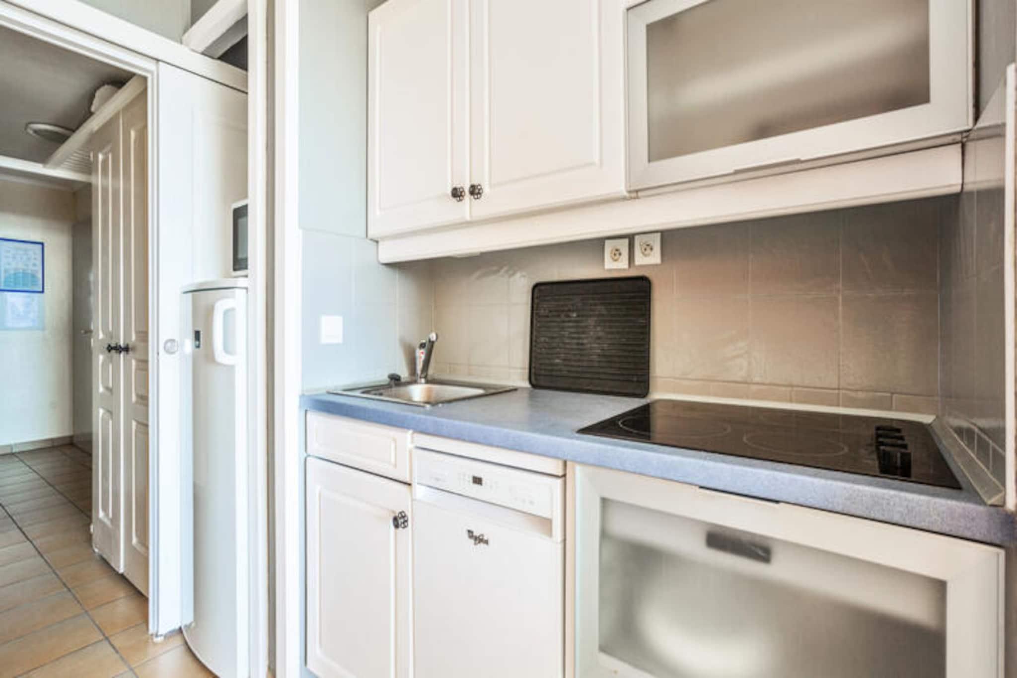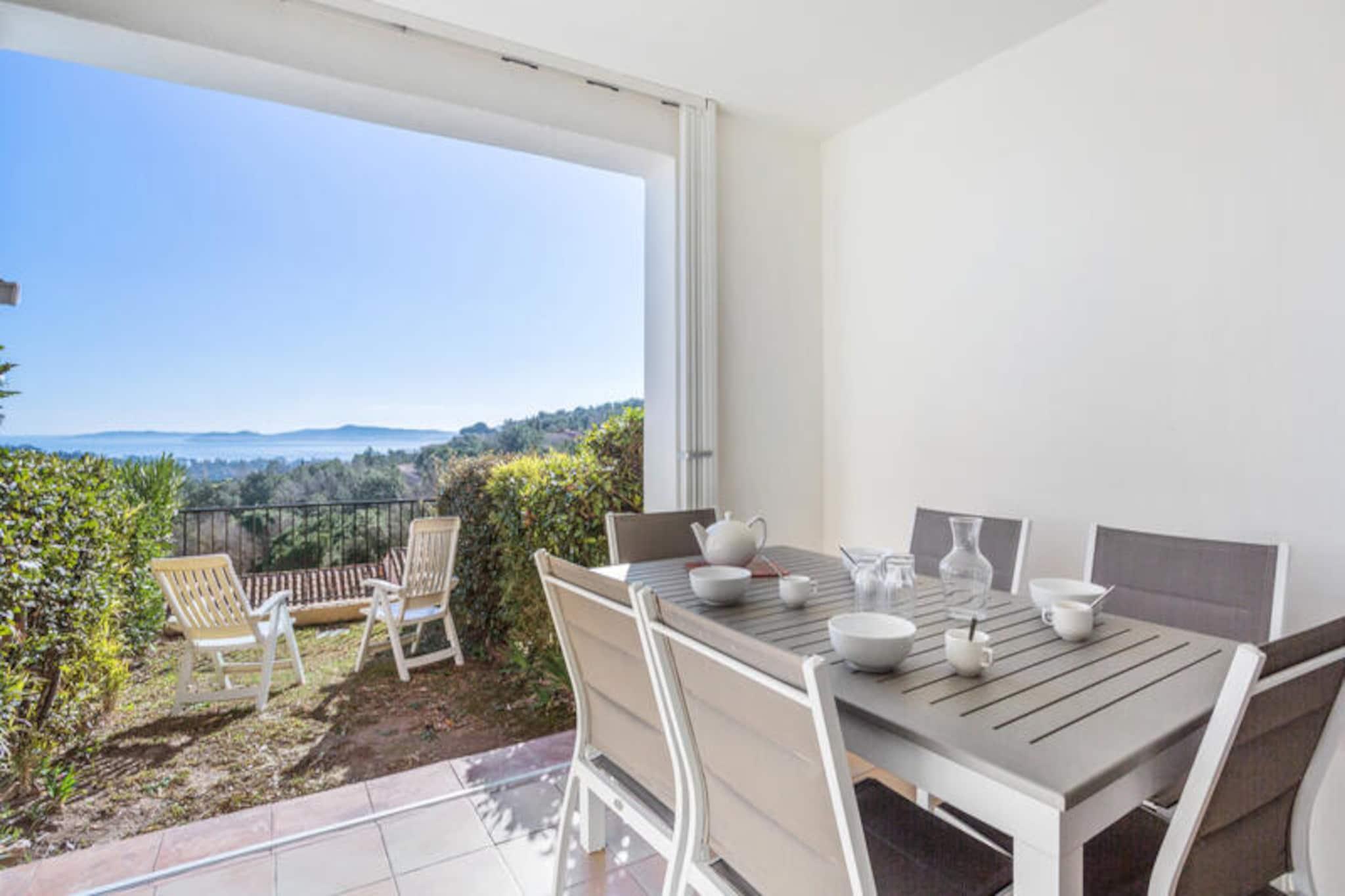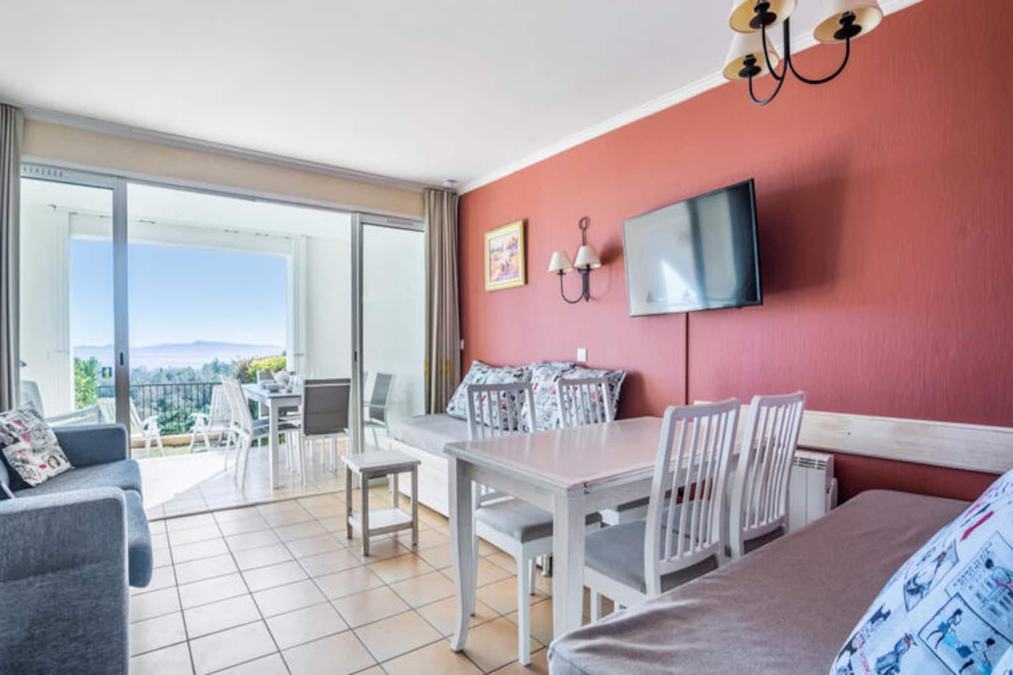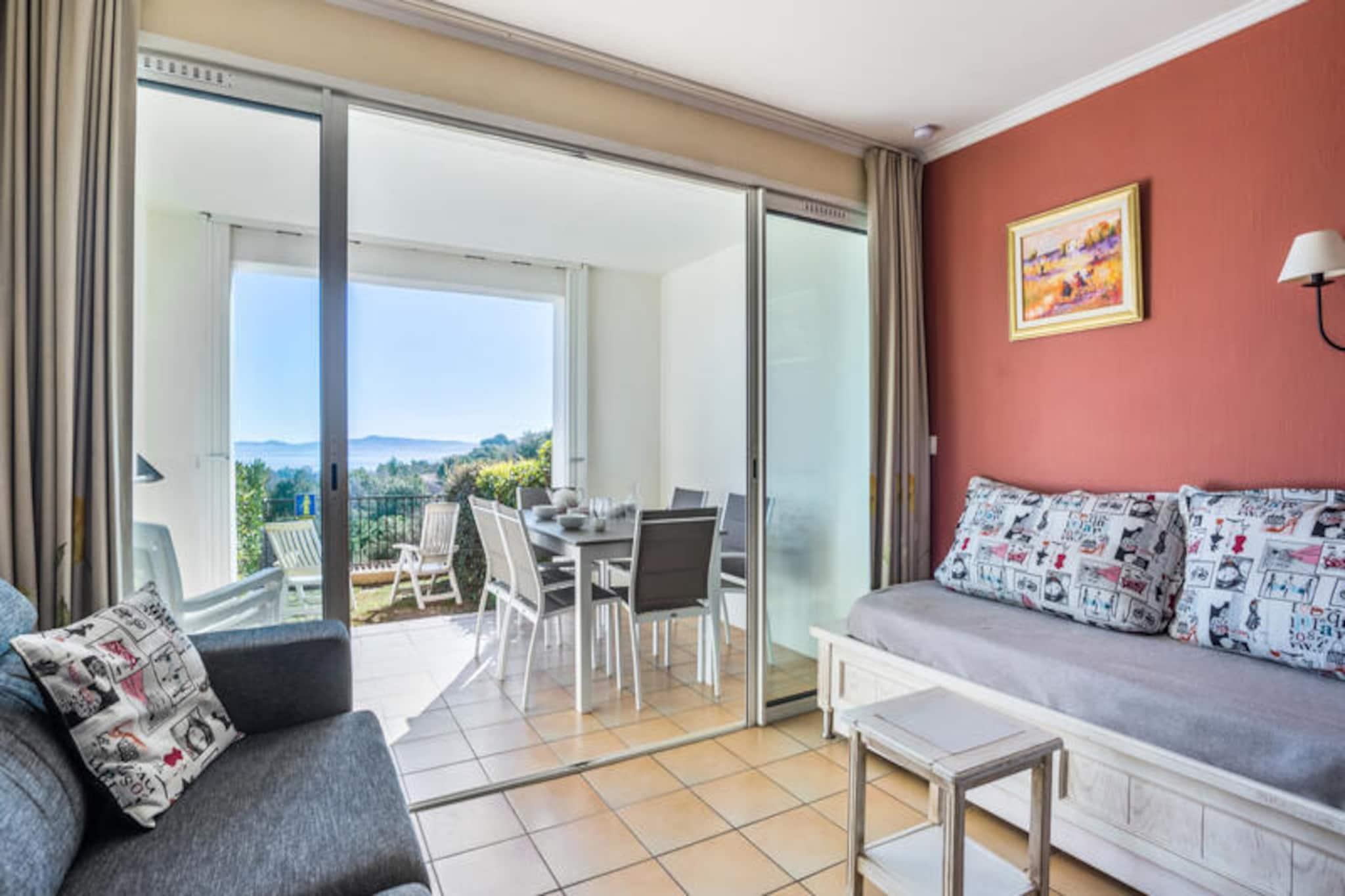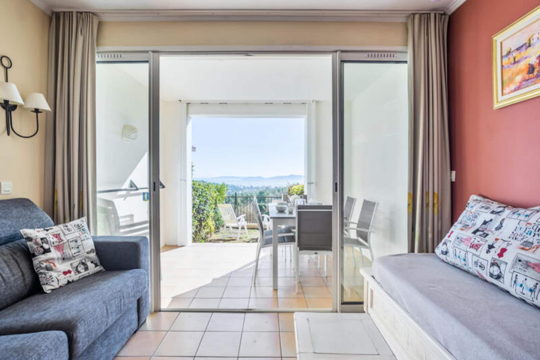 This welcoming apartment offers a comfortable stay for up to 4 guests with its double sofa bed and two single sofa beds in the living room. The bedroom is equipped with a double bed for a restful night’s sleep. The accommodation is pet-friendly (additional charges apply) and offers a parking space subject to availability. A EURO500 deposit is required upon check-in to ensure the security of your stay. Linen and towels are available for an extra charge, and you can enjoy free Wi-Fi if available, with optional services like end-of-stay cleaning. Located just a few kilometers from the sandy beaches, this property is the perfect base to explore the area. Enjoy scenic walks in nearby villages like Grimaud, Plan de la Tour, and Lavandou, or head to the famous Saint-Tropez. The residence also offers easy access to local attractions, including the Luna Park funfair, Grimaud port, and the stunning beach of Croix Valmer. Several restaurants, shops, and a supermarket are available on-site, making it convenient for guests. The apartment features a well-equipped open kitchen, a modern bathroom with a bathtub, and a separate toilet. The living area leads to a furnished terrace with a beautiful sea view. Guests can enjoy the residence's many amenities, such as the aquatic area, tennis courts, and children's clubs. You can also dine at the on-site La Calade restaurant, offering delicious Proven?al cuisine with a view of the Gulf of Saint-Tropez.