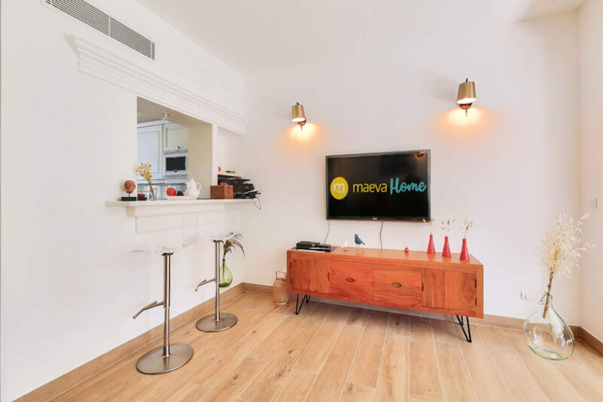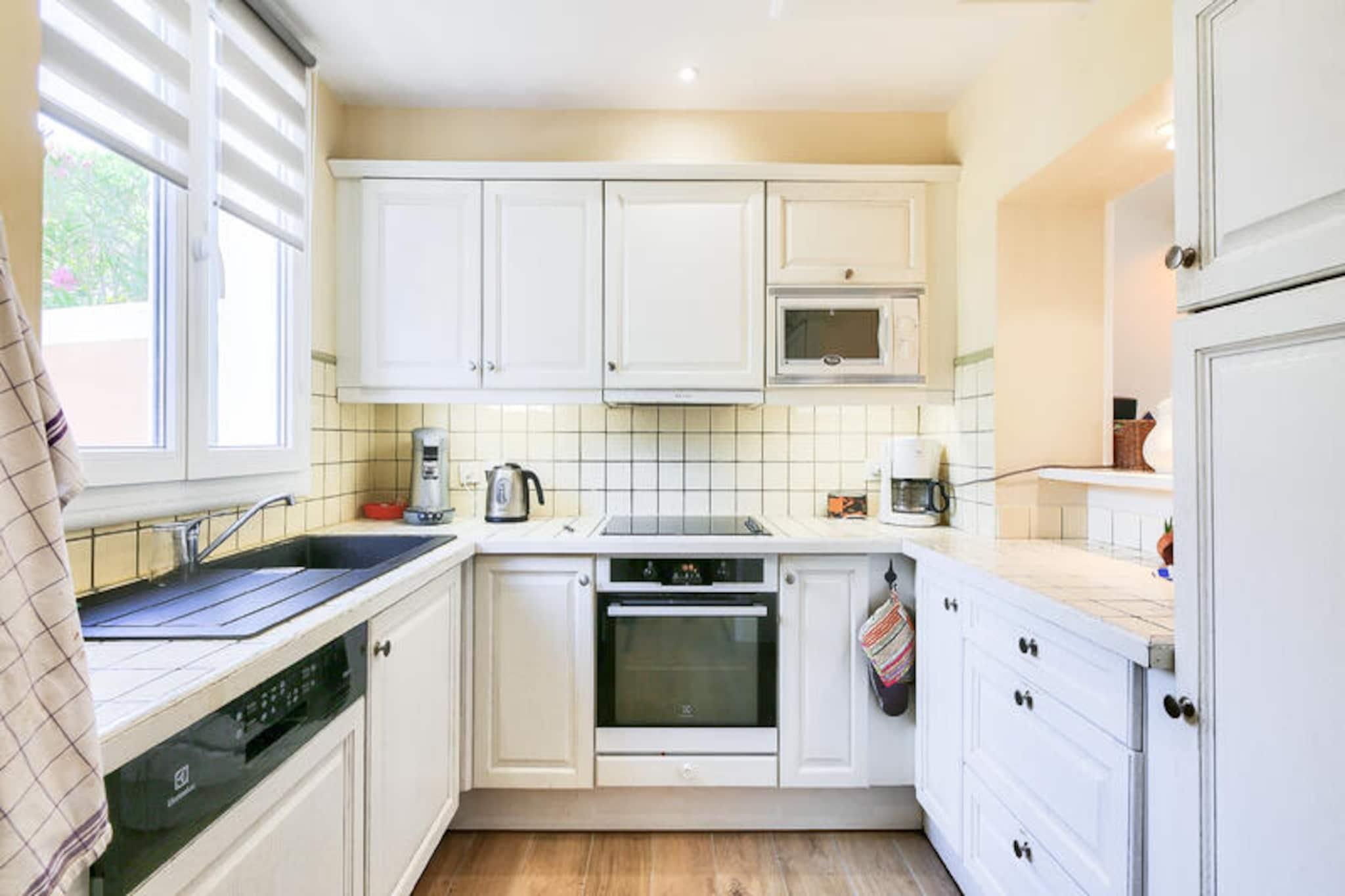 Nestled between Saint Tropez and Ste Maxime, this charming holiday home offers a spacious, air-conditioned villa with two bedrooms, accommodating up to 6 guests. The first bedroom has a double bed, while the second features twin beds, and the living room includes a sofa bed. Pets are allowed for an additional charge, and the property offers free parking based on availability. Additional amenities include a flat-screen TV, Wi-Fi (for an extra charge), and storage space, making it ideal for families or groups. The villa is located in a 25-hectare wooded estate with scenic views of the Mediterranean bay. Just 3 km from the beach, enjoy easy access to local attractions such as Croix Valmer, Grimaud, and Ramatuelle, perfect for evening walks or dining. The nearby Luna Park and Grimaud port offer family-friendly fun. Additionally, Lavandou's crystal-clear beach is a short drive away, providing a perfect spot for relaxation. Inside, you'll find a fully equipped semi-open kitchen and two bathrooms, including a bathtub and a shower room. The villa has a furnished covered terrace, a large garden, and a private outdoor pool. Additional facilities include a washing machine, ironing board, and hairdryer, ensuring a comfortable stay. The residence also features two swimming pools, including a wave pool open from May to September and a heated pool available until the end of September.