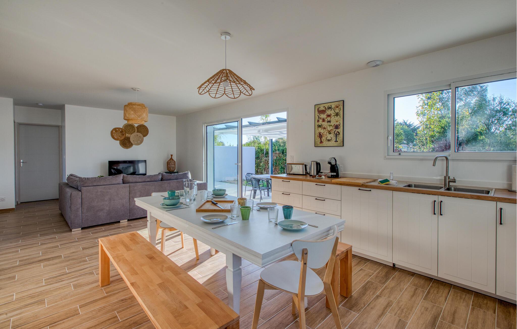 Dieses lichtdurchflutete Ferienhaus überzeugt mit einem großzügigen Wohnbereich und einer geschmackvollen Einrichtung. Kochen Sie in der voll ausgestatteten Küche Ihre Lieblingsgerichte und genießen Sie diese am großen Esstisch. Lehnen Sie sich anschließend auf den bequemen Sofas zurück und planen Sie Ihre nächsten Unternehmungen bei einem Glas Wein.