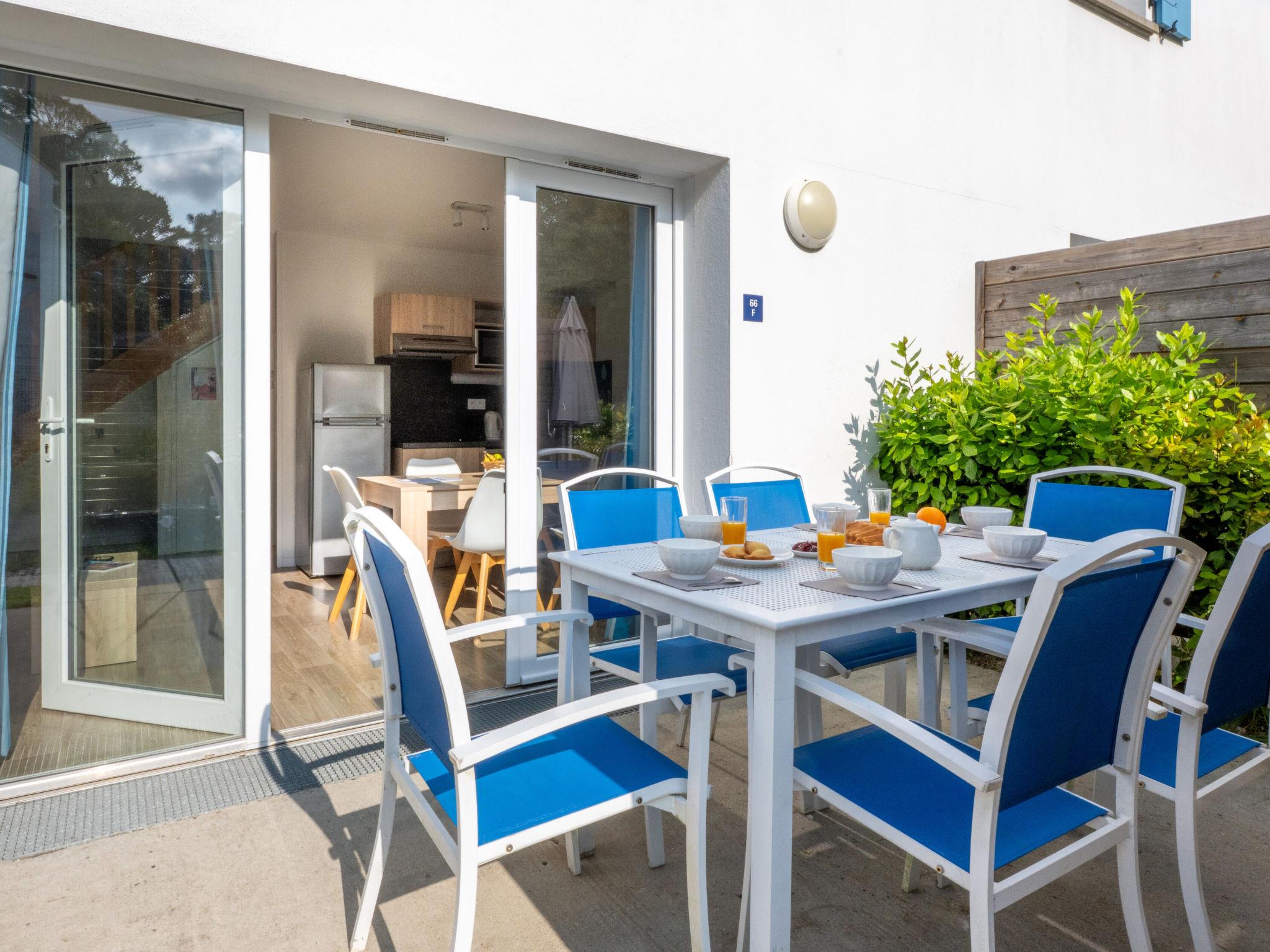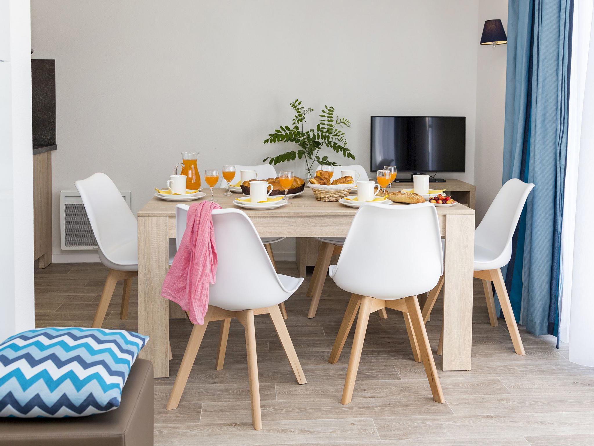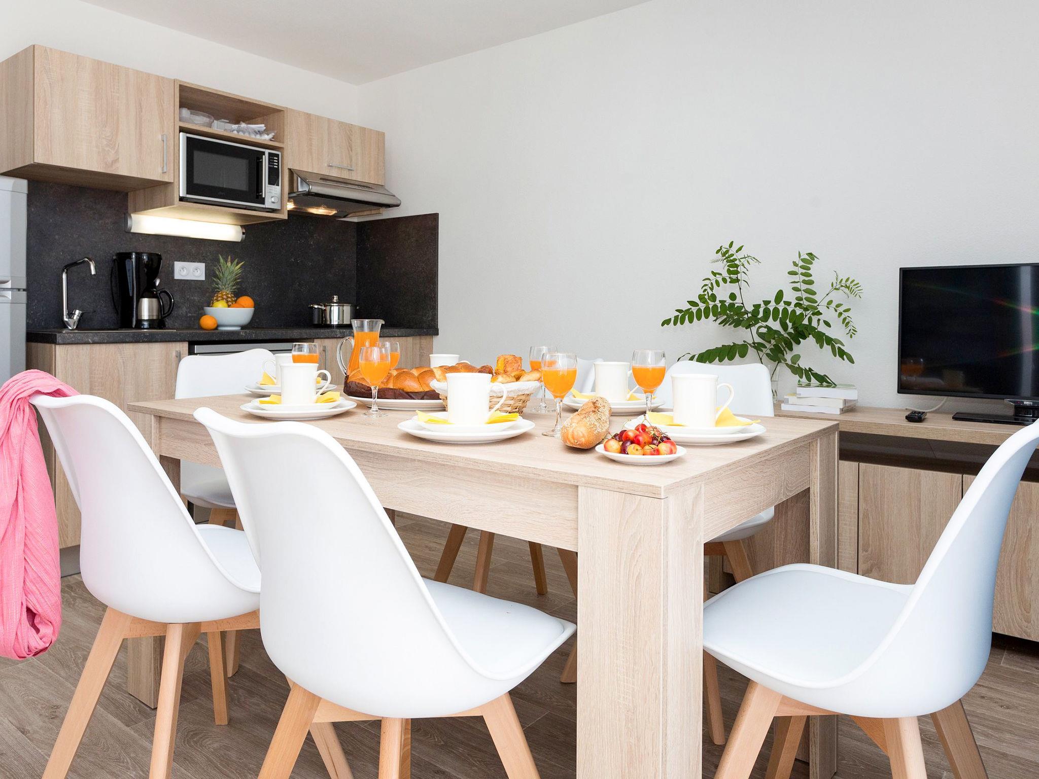 " Odalys Collection Le Domaine des Pins", 3-room apartment 44 m2 on 2 levels. Modern furnishings: living/sleeping room with 1 double sofabed, dining table and satellite TV (flat screen). Open kitchen (dishwasher, 4 ceramic glass hob hotplates, toaster, kettle, electric coffee machine, combination microwave). Upper floor: 1 double bedroom. 1 room with 2 sleeping facilities. Bathroom, sep. WC. Electric heating. Balcony or terrace. Balcony furniture. Facilities: children's high chair, baby cot, hair dryer. Internet (WiFi, free). Parking. Please note: non-smokers only. Maximum 2 pets/ dogs allowed. Smoke alarm, fire extinguisher.
