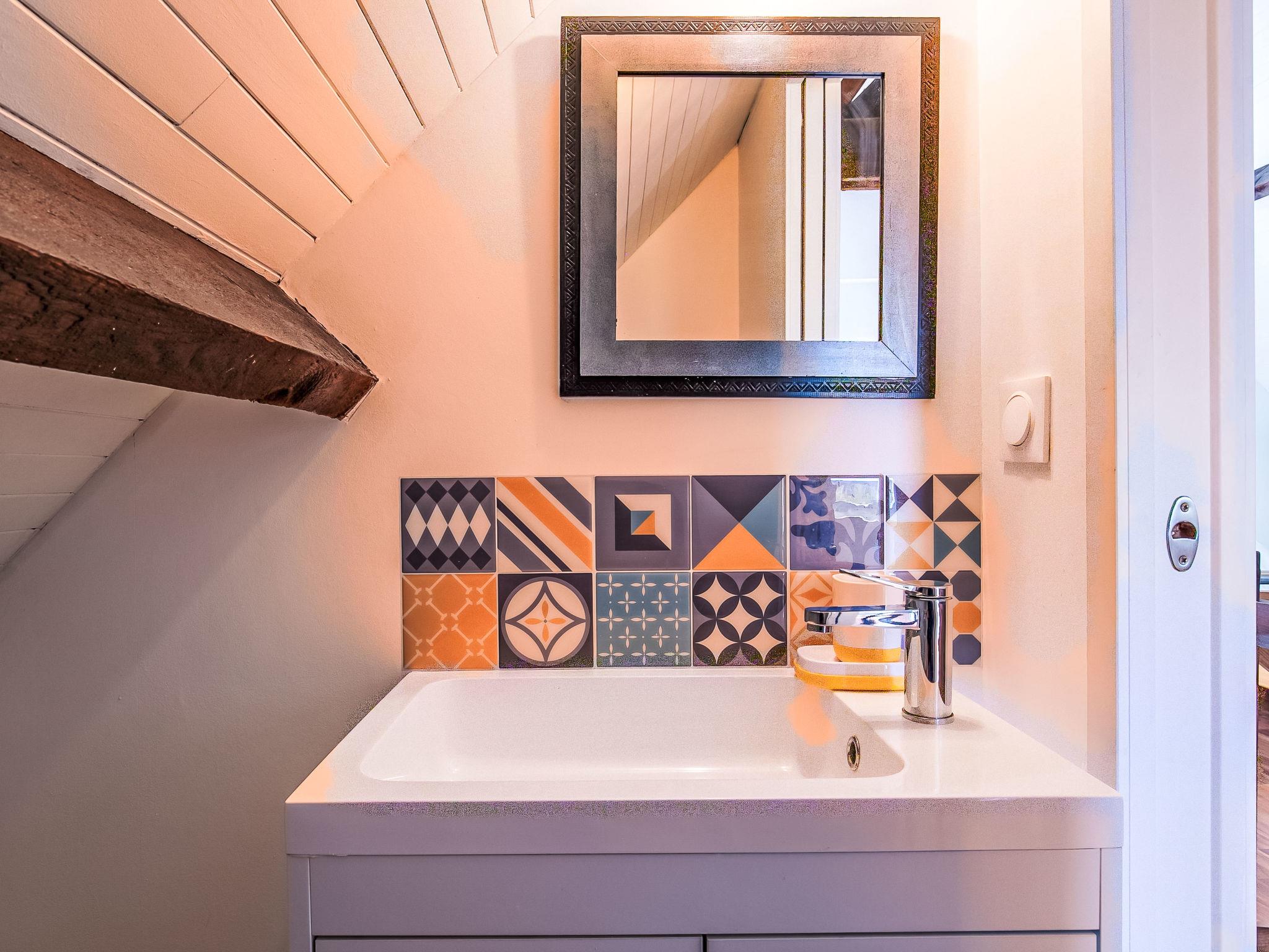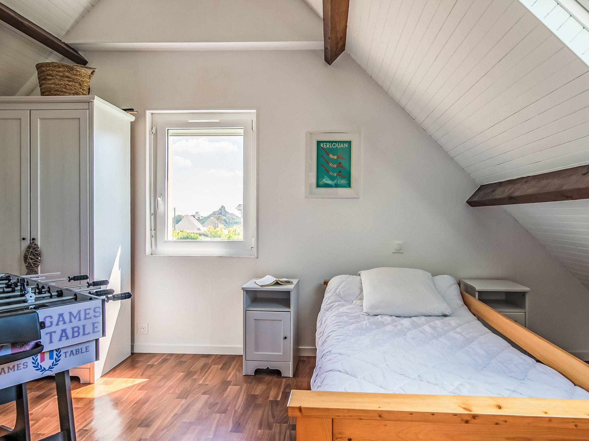 "Le Bruit de la Mer - Trouz ar Mor", 4-room house 90 m2. Bright, fully renovated in 2021, comfortable and tasteful furnishings: living/dining room with satellite TV, international TV channels and wood-burning stove. Exit to the garden, to the terrace. 2 rooms, each room with 1 french bed (160 cm, length 200 cm). Open kitchen (oven, dishwasher, 4 ceramic glass hob hotplates, toaster, kettle, microwave, freezer, electric coffee machine) with small dining table. Exit to the terrace. Shower, sep. WC. Upper floor: (steep stair) open living/sleeping room 20 m2, with sloping ceilings with 2 beds (90 cm, length 190 cm), electric heating. Parquet floors. Terrace, south facing position and west facing position. Terrace furniture, barbecue (portable), deck chairs (2), box-room. Facilities: washing machine, dryer, iron. Internet (WiFi, free). Please note: non-smoking house. Maximum 2 pets/ dogs allowed. Smoke alarm.