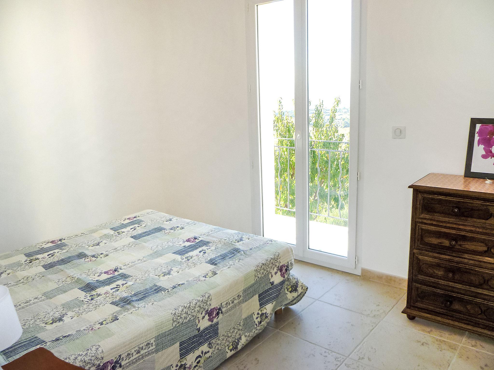 4-room house 95 m2, on the upper floor. Bright, practical furnishings: large living/dining room with TV. Exit to the balcony, to the terrace. 2 rooms, each room with 1 french bed (1 x 140 cm, length 190 cm). Exit to the balcony. 1 room with 1 x 2 bunk beds (80 cm, length 190 cm). Kitchen (oven, dishwasher, 3 ceramic glass hob hotplates, microwave, freezer, electric coffee machine). Shower, sep. WC. Underfloor heating. Terrace 25 m2. Terrace furniture, barbecue. Very beautiful view of the sea and the countryside. Facilities: washing machine. Please note: maximum 1 pet/ dog allowed. TV only FR. Smoke alarm.