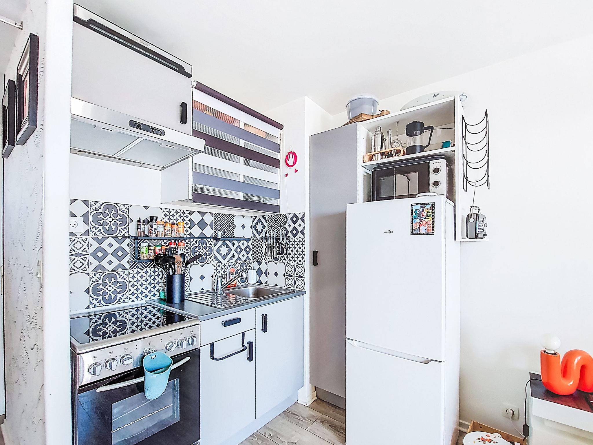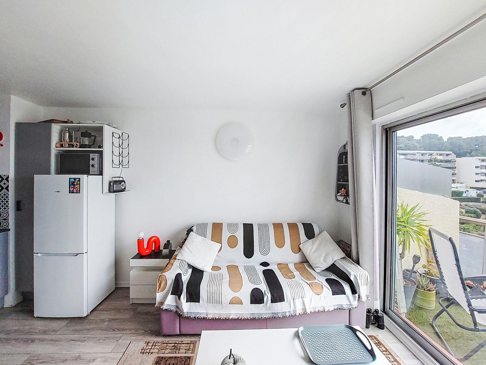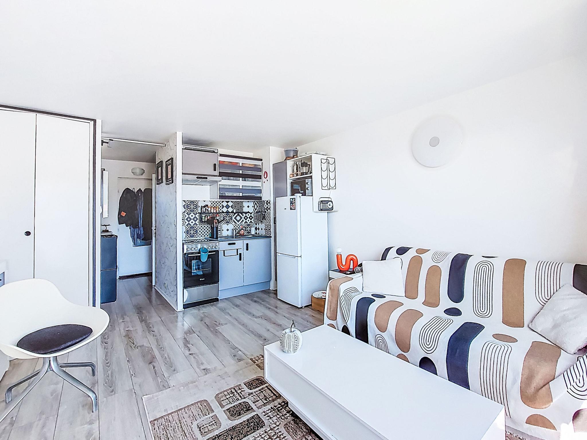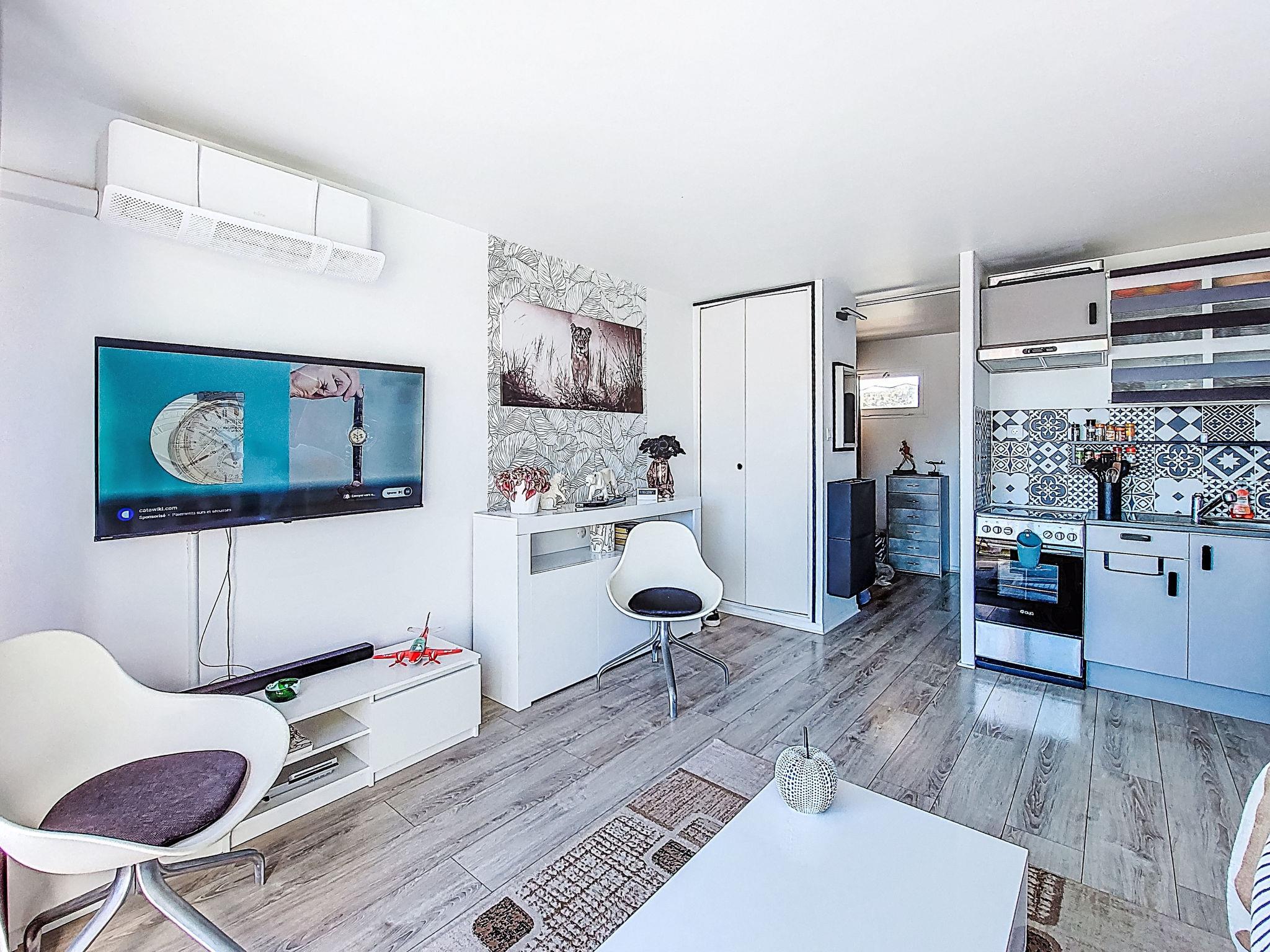 1-room studio 26 m2 on 3rd floor. Comfortable and beautiful furnishings: living/dining room with 1 double sofabed (160 cm, length 190 cm), TV (flat screen), air conditioning. Exit to the terrace. Kitchenette (oven, 4 ceramic glass hob hotplates, toaster, microwave, electric coffee machine). Shower/WC. Forced-air heating. Terrace 7 m2. Terrace furniture. View of the sea. Facilities: washing machine. Internet (WiFi, extra). Parking space n 694. Please note: TV only FR. Smoke alarm. Offer by a private individual according to Art. 155, IV of CGI. 13028003367OB