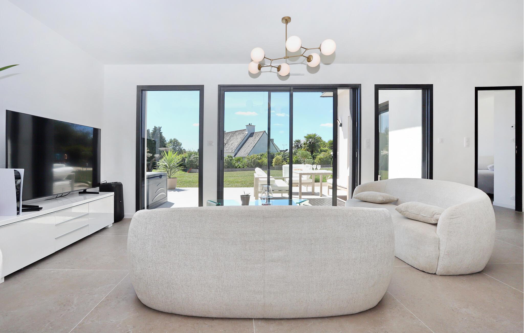 Dieses moderne Ferienhaus liegt eingebettet in einen schönen, großen Garten und unweit des feinen, weißen Sandstrands von Kerleven. Das helle und geräumige Interieur verwöhnt Sie mit einer stilvollen Einrichtung, in der Sie harmonische Stunden mit Freunden oder der Familie genießen können. Freuen Sie sich auf gesellige Kochabende und ausgedehnte Mahlzeiten, spielen Sie auf der PlayStation oder gönnen Sie sich wohlige Momente im beheizten Indoor-Pool.