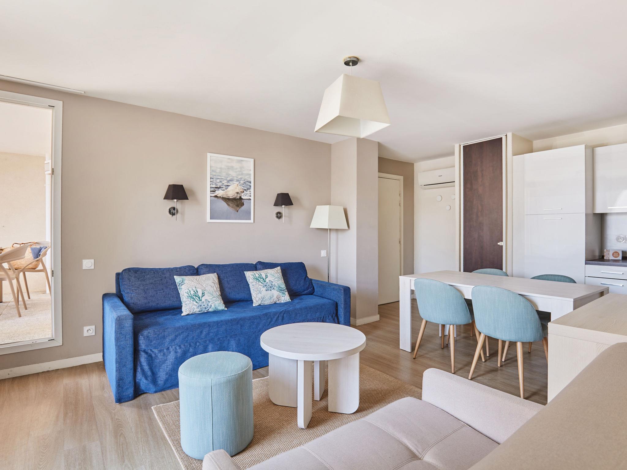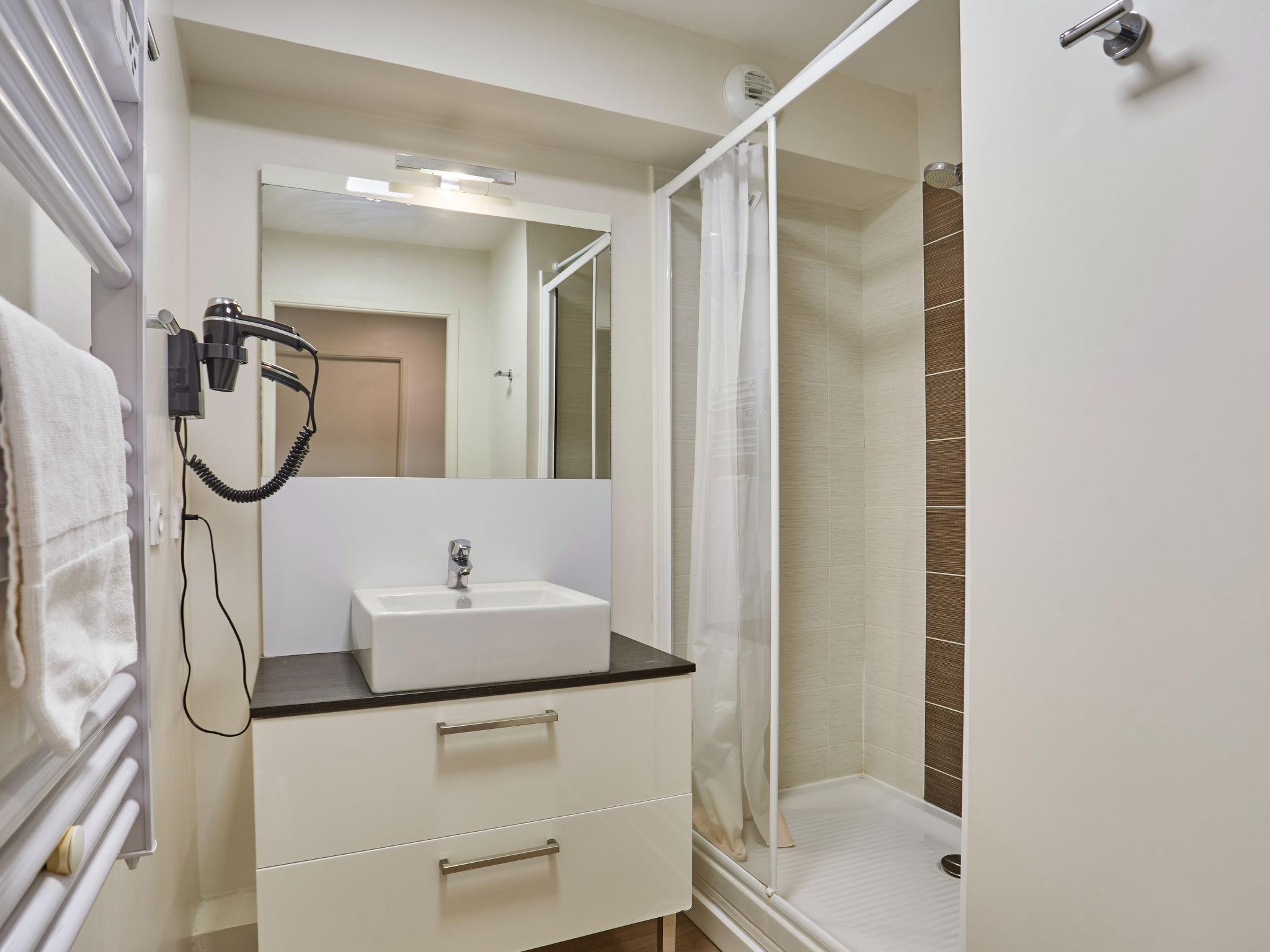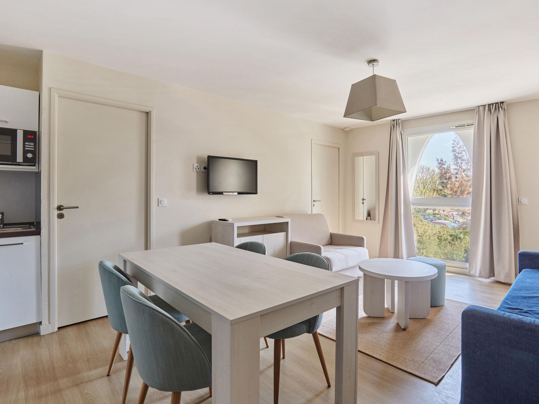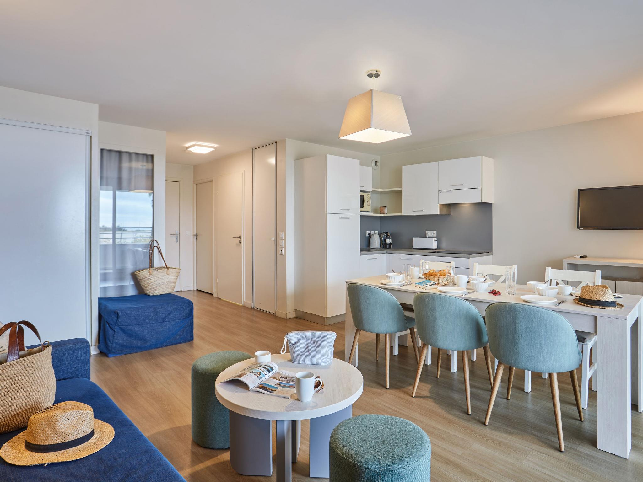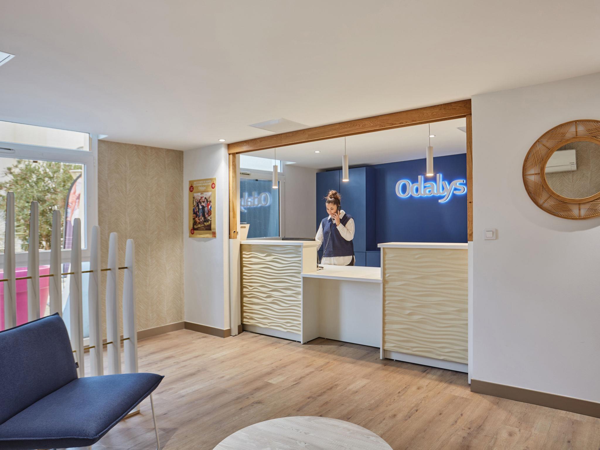 "Odalys Référence Les Dunes du Soleil", 2-room apartment 30 m2, on the ground floor. Comfortable furnishings: living/sleeping room with 1 double sofabed, dining table, TV and air conditioning. Exit to the balcony, to the terrace. 1 room with 1 x 2 bunk beds. Small, open kitchen (dishwasher, 4 ceramic glass hob hotplates, kettle, microwave, electric coffee machine). Shower/WC. Electric heating. Patio 4 m2. Terrace furniture. Facilities: children's high chair, baby cot, hair dryer. Internet (WiFi, free). Please note: non-smokers only. Maximum 1 pet/ dog allowed. Smoke alarm, fire extinguisher.