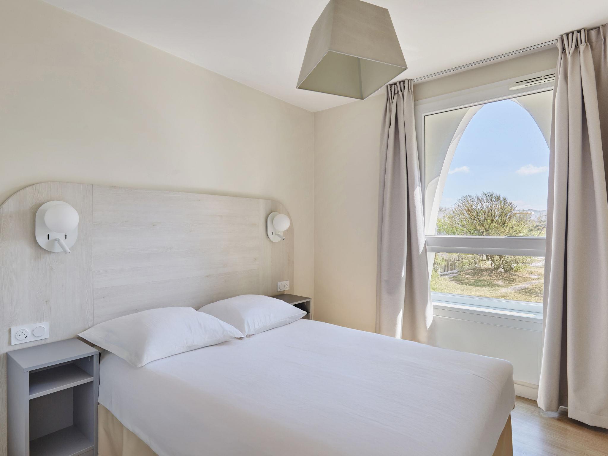 "Odalys Référence Les Dunes du Soleil", 1-room studio 27 m2, on the ground floor. Comfortable furnishings: living/sleeping room with 1 double sofabed, dining table, TV and air conditioning. Exit to the terrace. Small, open kitchen (dishwasher, 2 ceramic glass hob hotplates, kettle, microwave, electric coffee machine). Exit to the balcony, to the terrace. Shower/WC. Electric heating. Terrace, west facing position. Terrace furniture. Facilities: children's high chair, baby cot, hair dryer. Internet (WiFi, free). Please note: non-smokers only. Maximum 1 pet/ dog allowed. Smoke alarm, fire extinguisher.