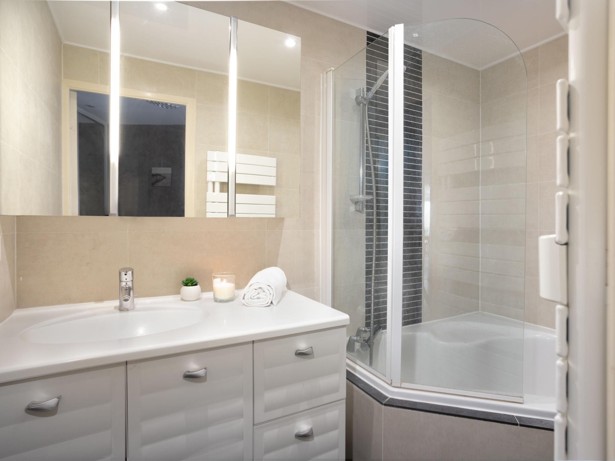 3-room apartment 63 m2 on 2nd floor, south facing position. Renovated, comfortable and beautiful furnishings: living/dining room with 1 double sofabed (140 cm, length 190 cm), TV (flat screen). Exit to the terrace. 1 room with 1 french bed (140 cm, length 190 cm), TV (flat screen). 1 room with 2 beds (90 cm, length 190 cm). Open kitchen (dishwasher, 3 ceramic glass hob hotplates, toaster, kettle, freezer, electric coffee machine, combination microwave) with hatch. Bathroom, shower, sep. WC. Air-conditioning. 3 balconies 10 m2, south-west facing position, large terrace 40 m2, south facing position. Terrace furniture, deck chairs. Marvellous view of the sea. Facilities: washing machine. Internet (WiFi, extra). Garage space n voiture standard (1 car), height 180 cm, width 220 cm. Please note: maximum 1 pet/ dog allowed. Smoke alarm.