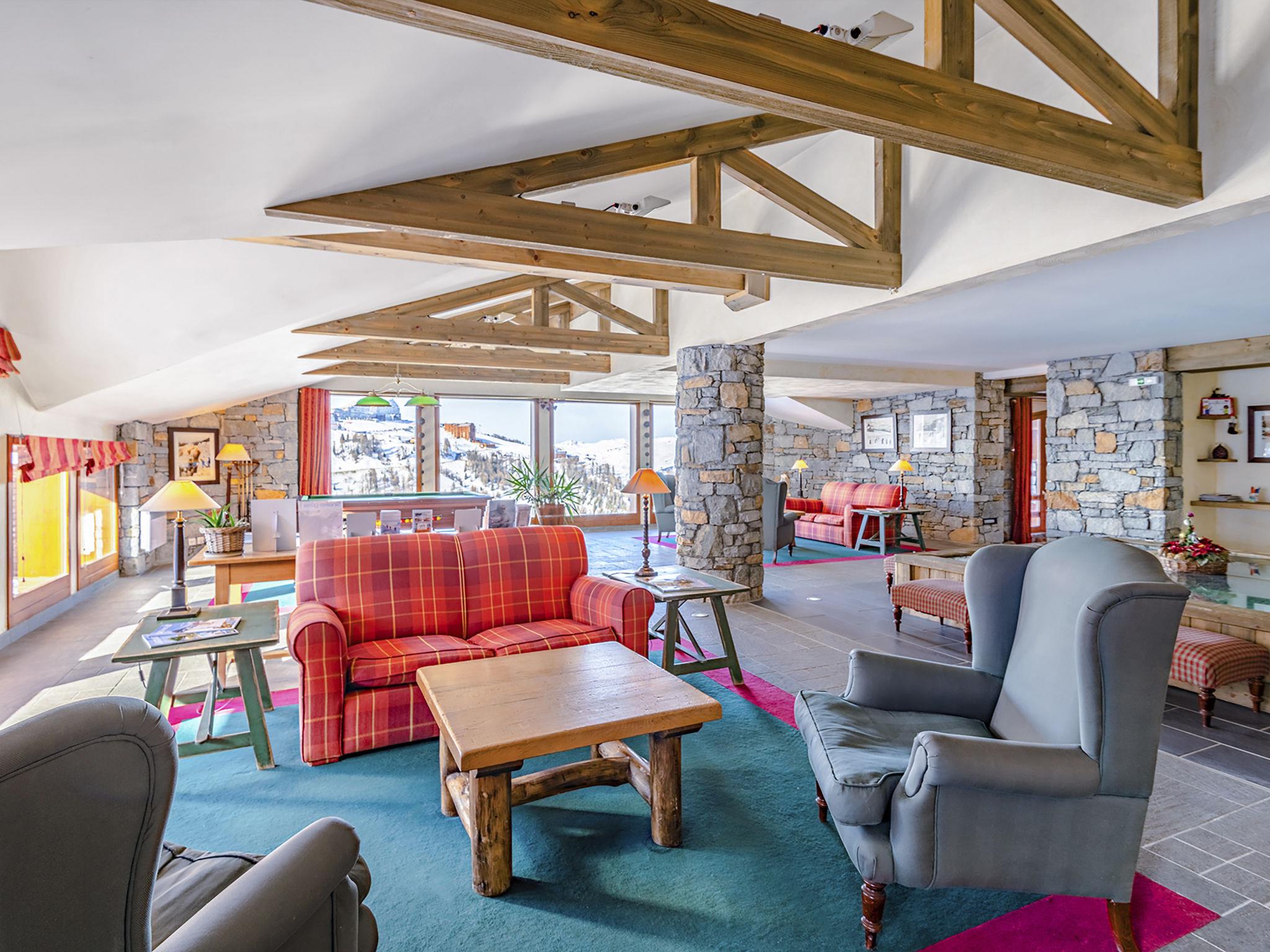 Cosy, comfortable residence "Aspen". 48 apartments in the residence. In the district of Plagne Villages. For shared use: indoor pool heated (9 x 6 m, pool opening hours: 10:00-19:30). Shower/WC in the pool area. In the complex: reception, lounge, WiFi (extra). Sauna (extra). Steam room (extra). Billiard table, lift, storage room for skis, washing machine (extra), tumble dryer (extra). Parking (extra) at 100 m. Parking space or garage only for small to medium-sized cars. Dimension: height 190 cm. Shop, restaurant 300 m, bus stop "Arret Bus Plagne 1800 Bas" 2.7 km. Ski lift 300 m, slopes 100 m. Well-known ski regions can easily be reached: Peisey-Vallandry 30 km, Montchavin 13 km. Please note: reception open 17:00-20:00 hrs. Please note: the photograph shows a typical example. The holiday properties may differ in living space, floorplan, equipment and furnishing.