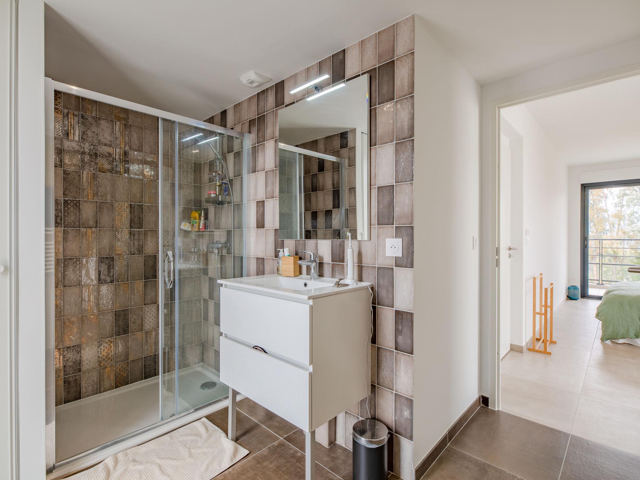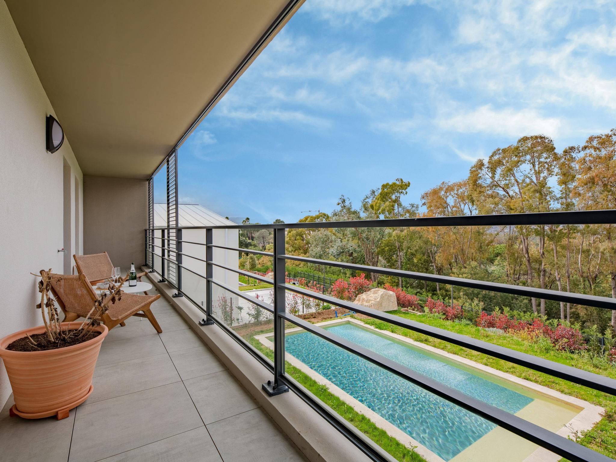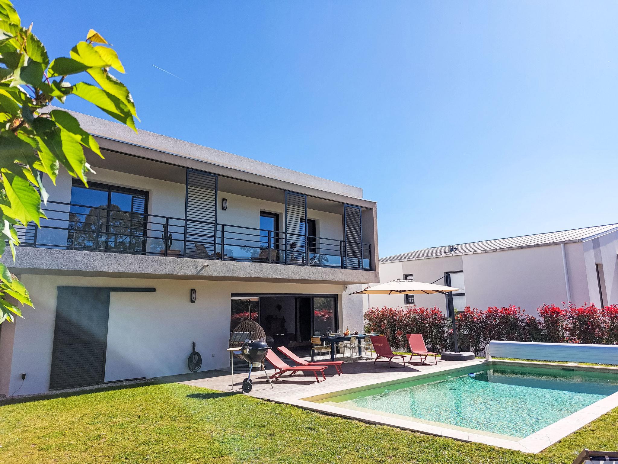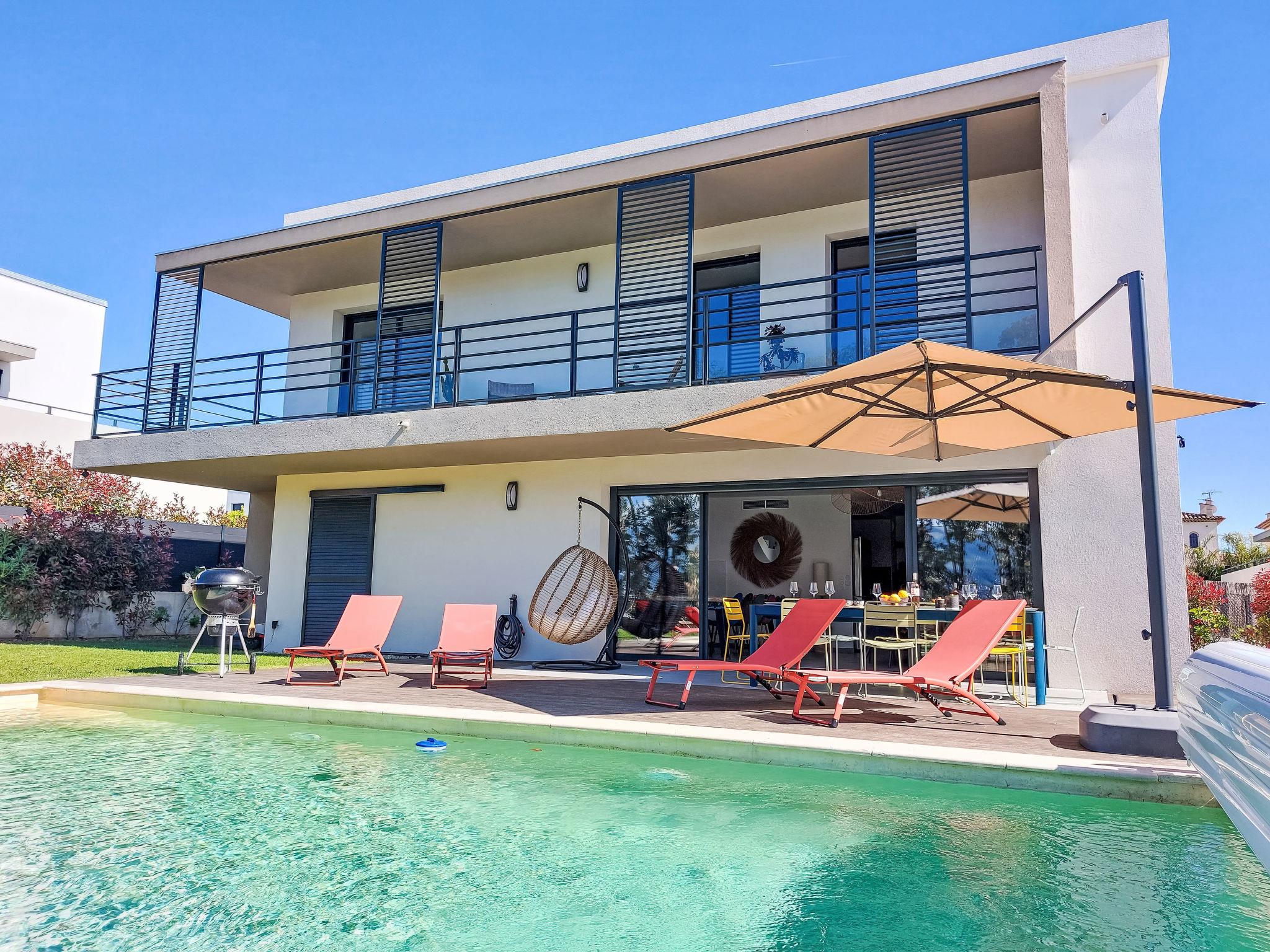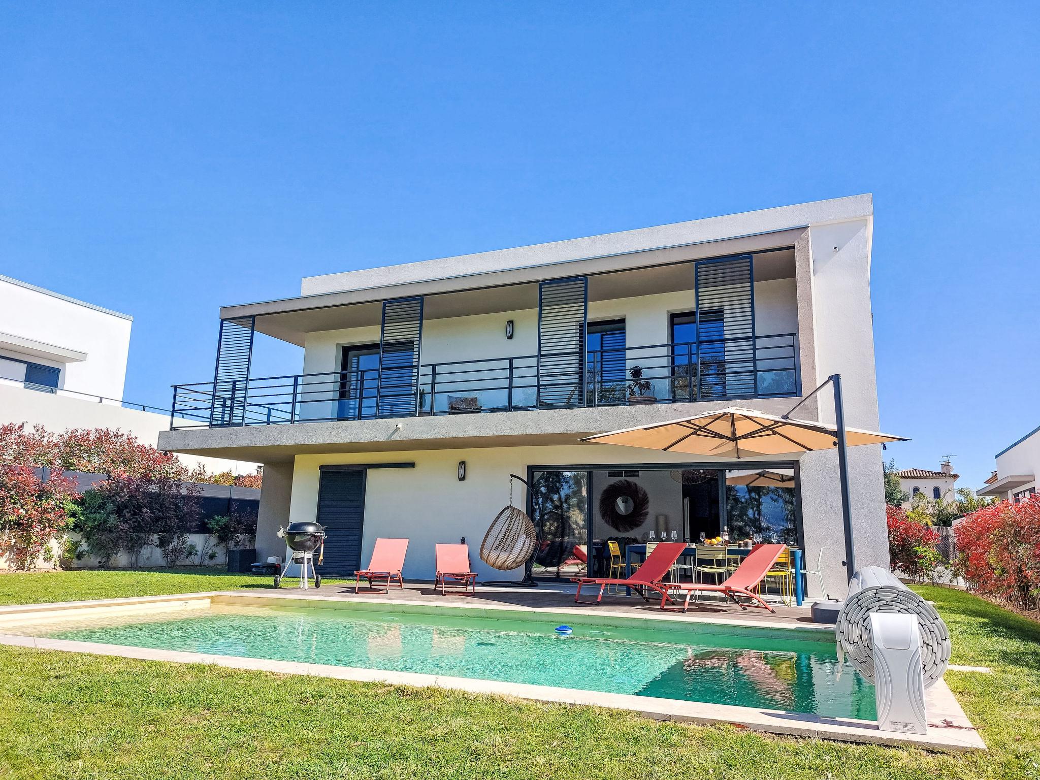 La Roquette sur Siagne 10 km from Cannes: Very modern, beautiful villa "Villa La Roquette sur Siagne", 2 storeys, detached, built in 2023. Residential area (villas). Private: well-kept garden 400 m2 (fenced), swimming pool heated (8 x 4 m, depth 120 - 150 cm, seasonal availability: 01.May. - 30.Sep.) with shutter cover. In the house: burglar alarm system. Parking (for 3 cars). Shop, restaurant 500 m, bus stop 600 m, sandy beach "Plage du Midi" 7 km. Sports harbour 10 km, golf course (18 hole) 5 km. Nearby attractions: Cannes 10 km, Grasse 10 km, Nice 35 km. Hiking paths: Tanneron 6 km. The owner does not accept any youth groups. Part of the house is closed and unoccupied. Residence with electric gates. Neighbourhood highly sensitive to noise. Quietness and good behaviour expected.