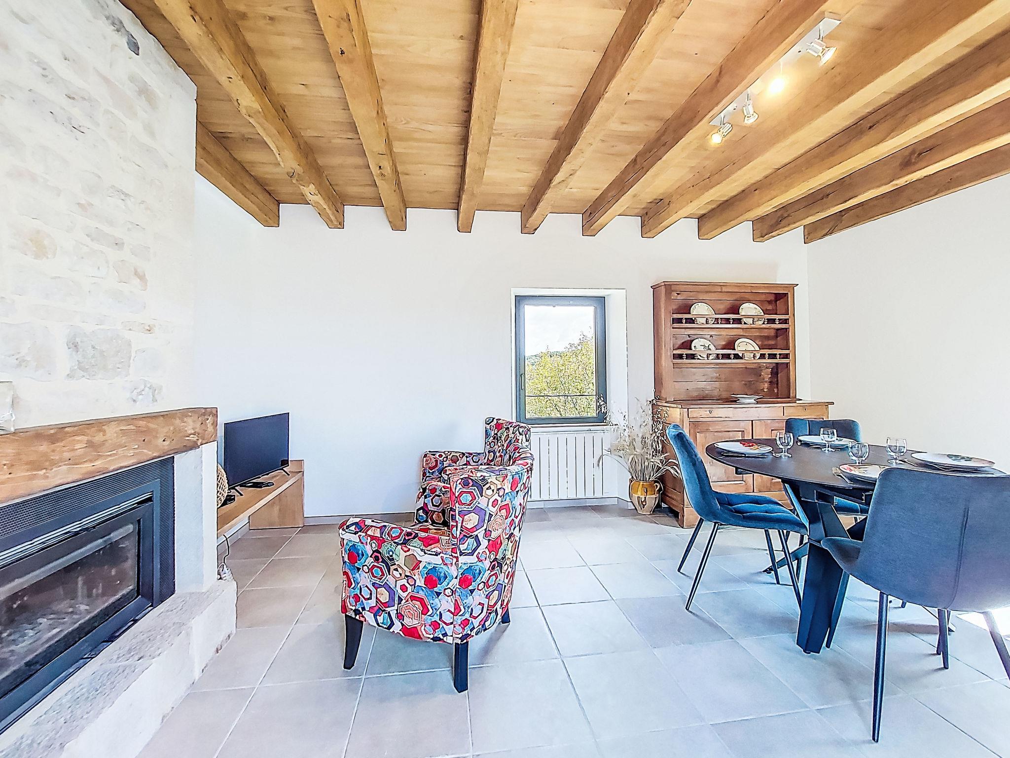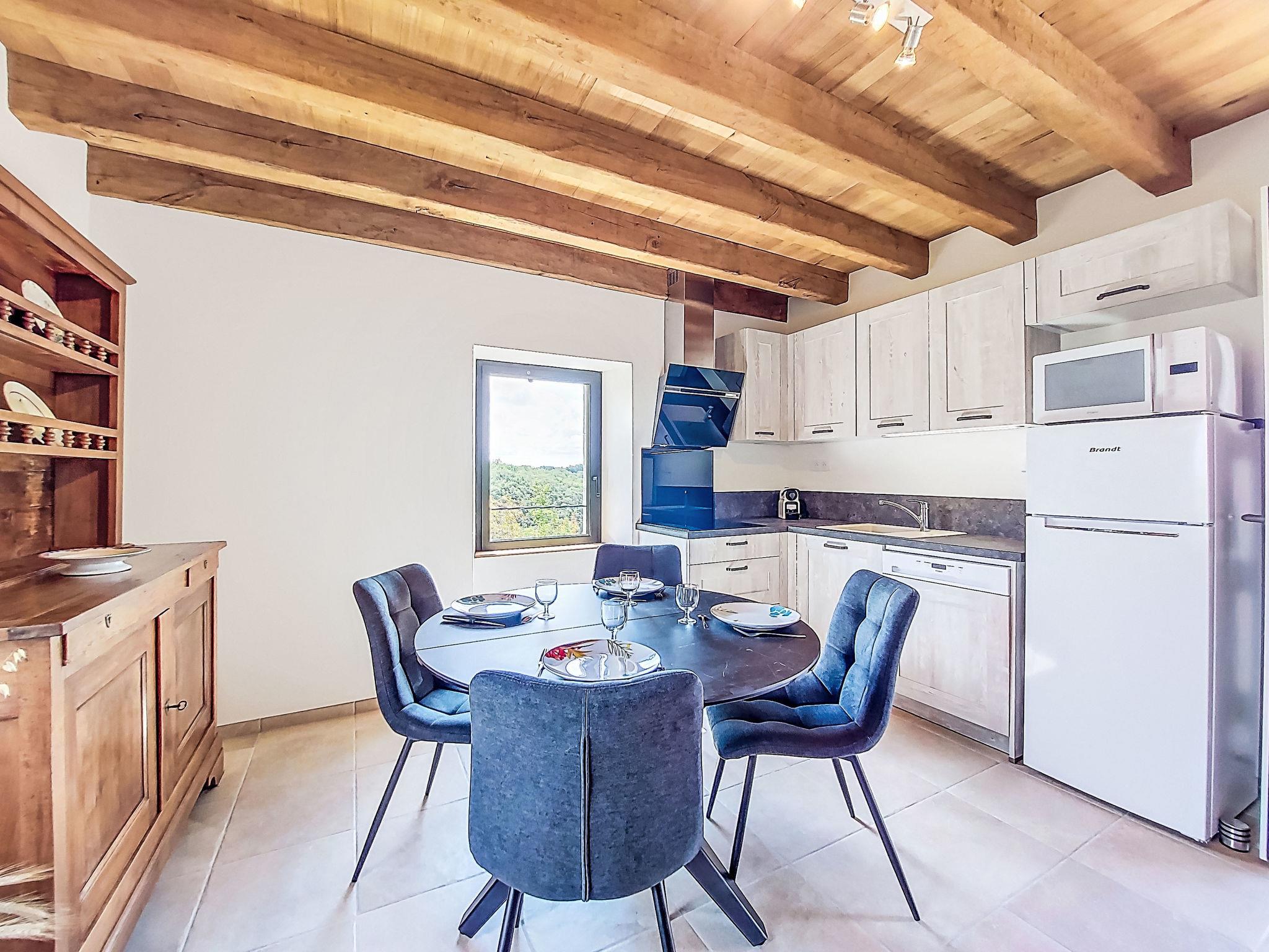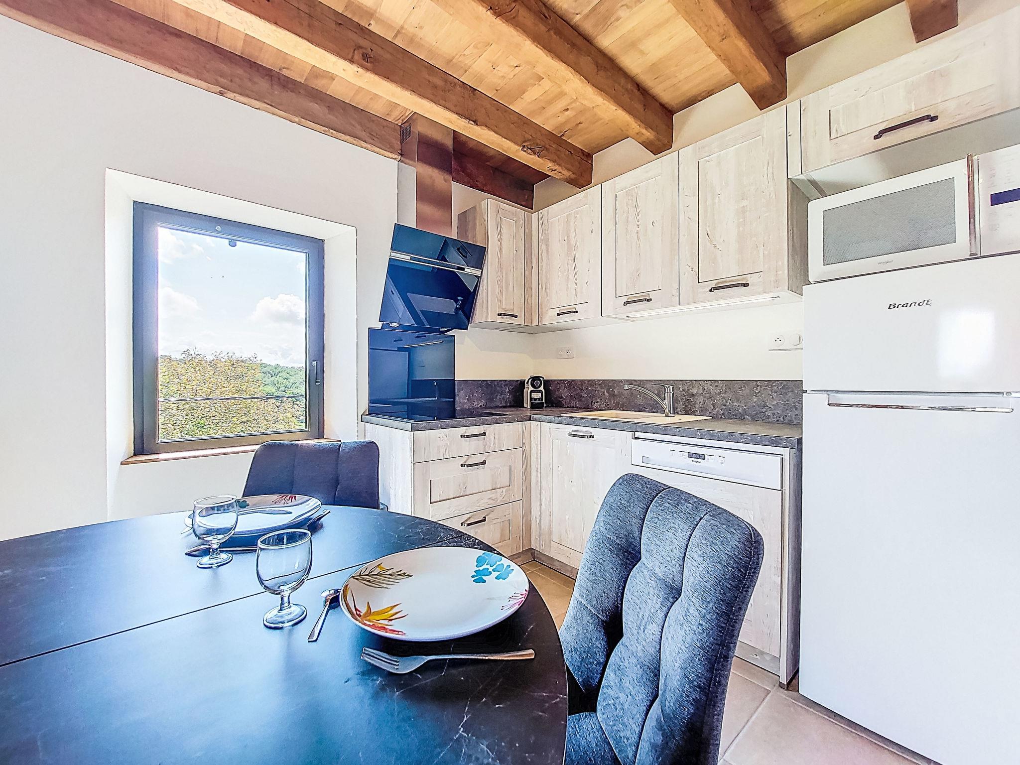 "Cuzac", 3-room house 50 m2 on 3 levels. Partly with sloping ceilings, modern and cosy furnishings: kitchen-/living room (dishwasher, 1 induction hot plates, 3 gas rings, toaster, kettle, electric coffee machine, Capsules for coffee machine (Nespresso) extra, combination microwave) with open-hearth fireplace, dining table and satellite TV (flat screen), DVD. On the lower ground floor: (steep stair), 1 room with 1 french bed (140 cm, length 190 cm). Exit to the garden. Shower, sep. WC. Upper floor: 1 open room with sloping ceilings with 2 beds (90 cm, length 190 cm). Electric heating. Terrace roofed. Terrace furniture, barbecue (portable), deck chairs (2). Marvellous panoramic view of the countryside. Facilities: washing machine, children's high chair, baby cot, logs (extra). Please note: non-smoking house. Maximum 2 pets/ dogs allowed. Smoke alarm.