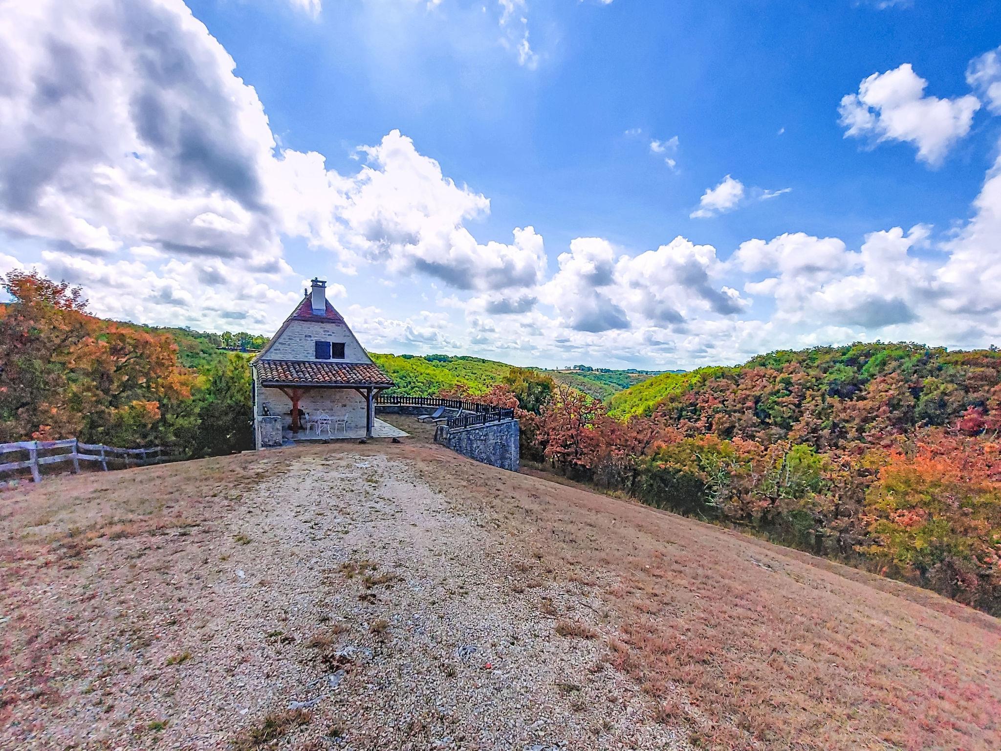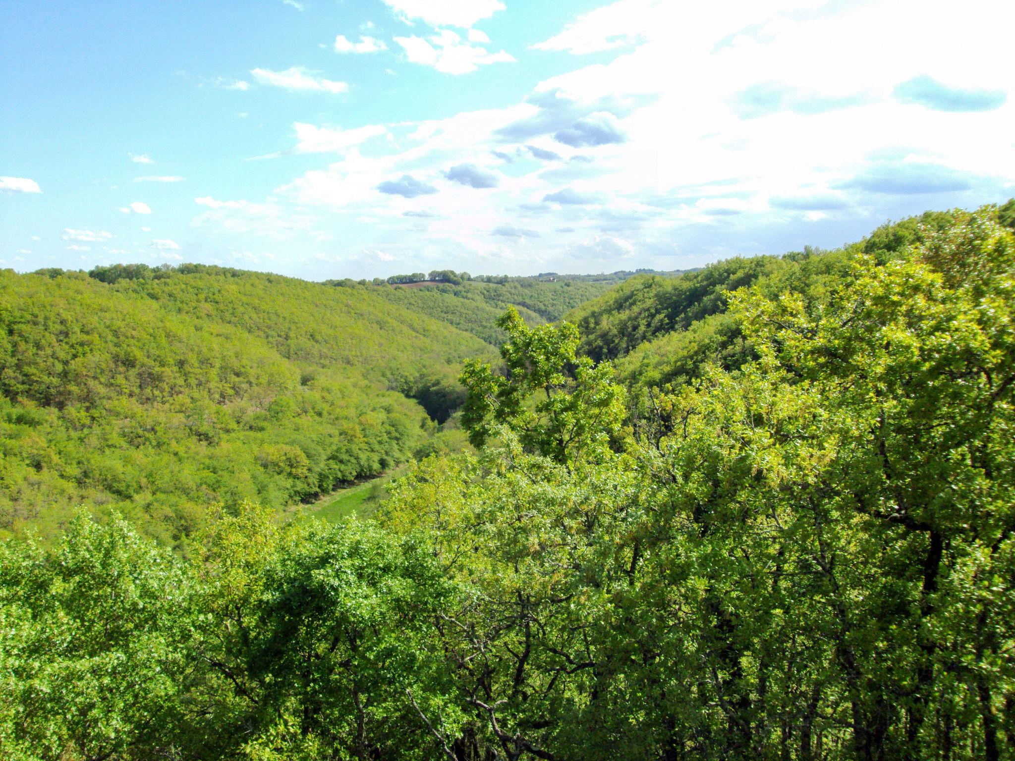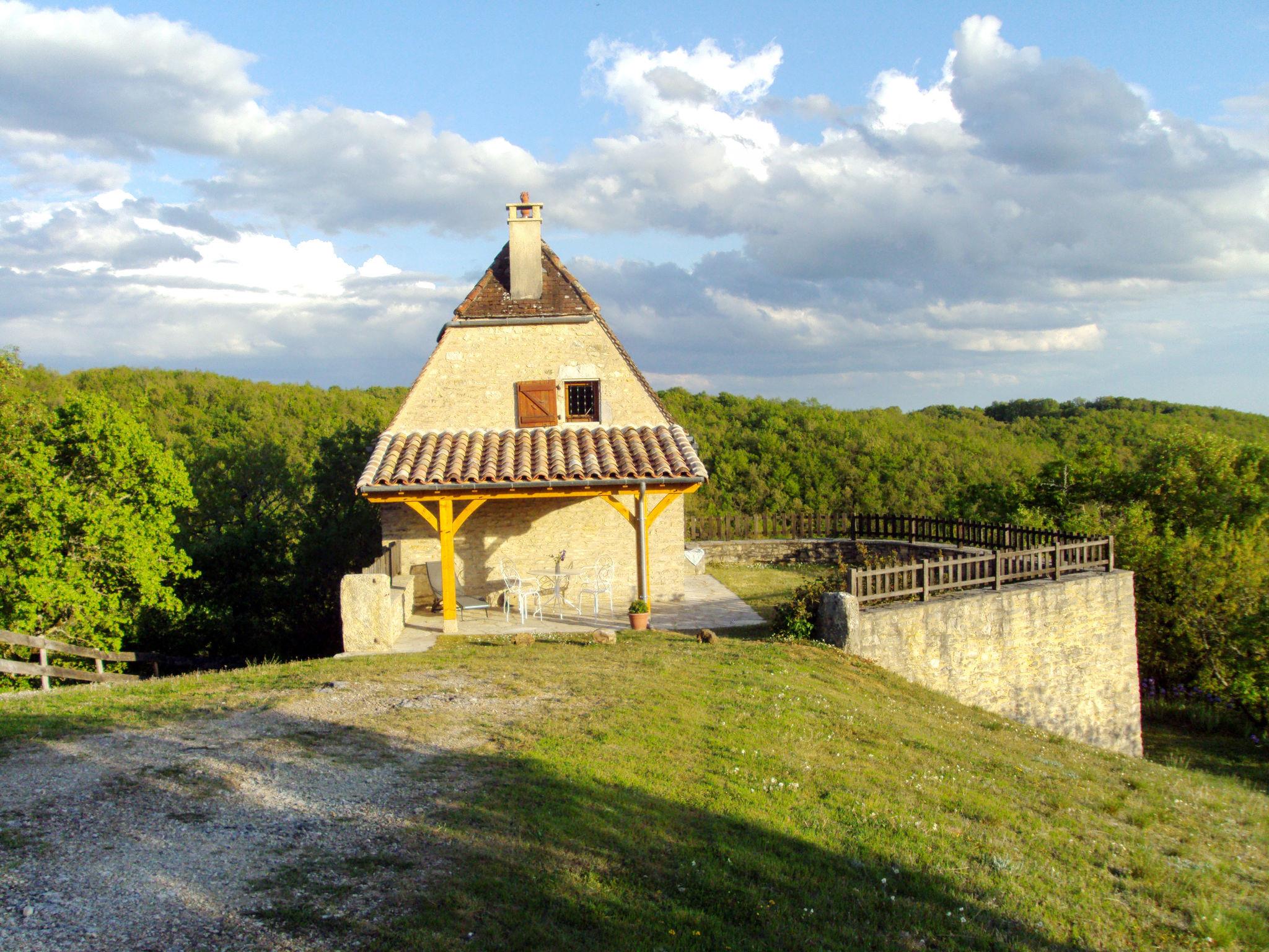 Small, cosy, rustic country house "Cuzac", surrounded by trees and meadows. 3 km from the centre of Labastide-Murat, 25 km from the centre of Rocamadour, 32 km from the centre of Cahors, in a secluded, elevated position on a slope, 3 km from the lake, in the countryside. Private: natural state property 5'000 m2 with trees, meadow, lawn for sunbathing. Motor access to the house (300 m via unmade road). Parking at the house on the premises. Shop 3 km, bus stop "St Henri" 23 km.