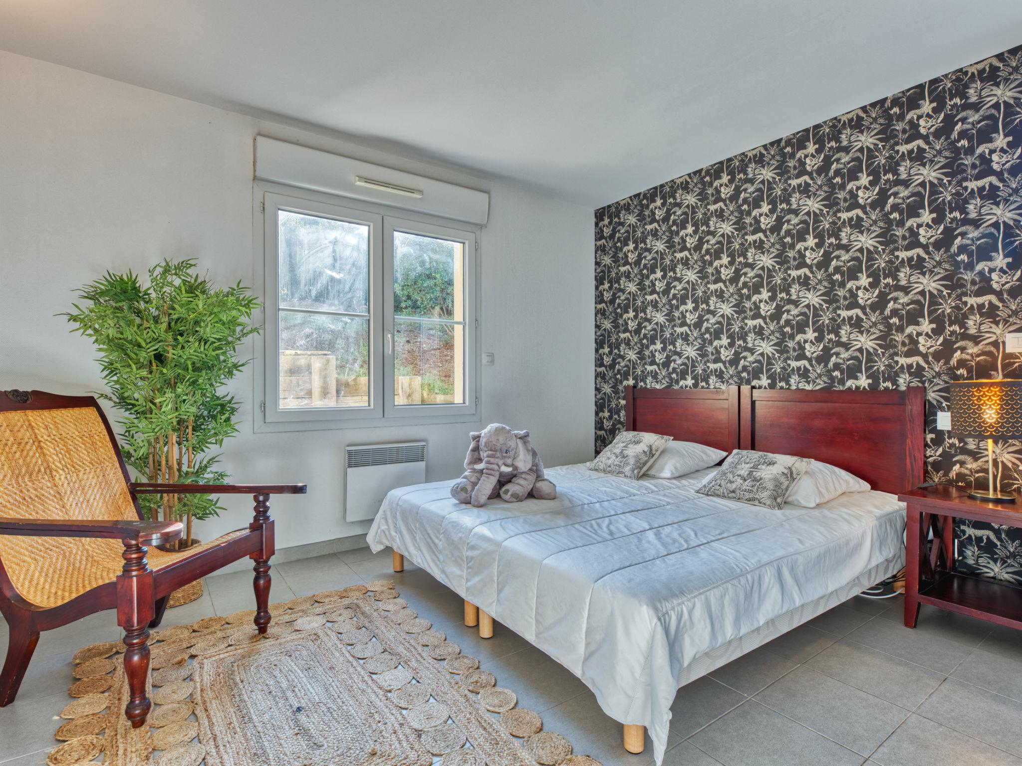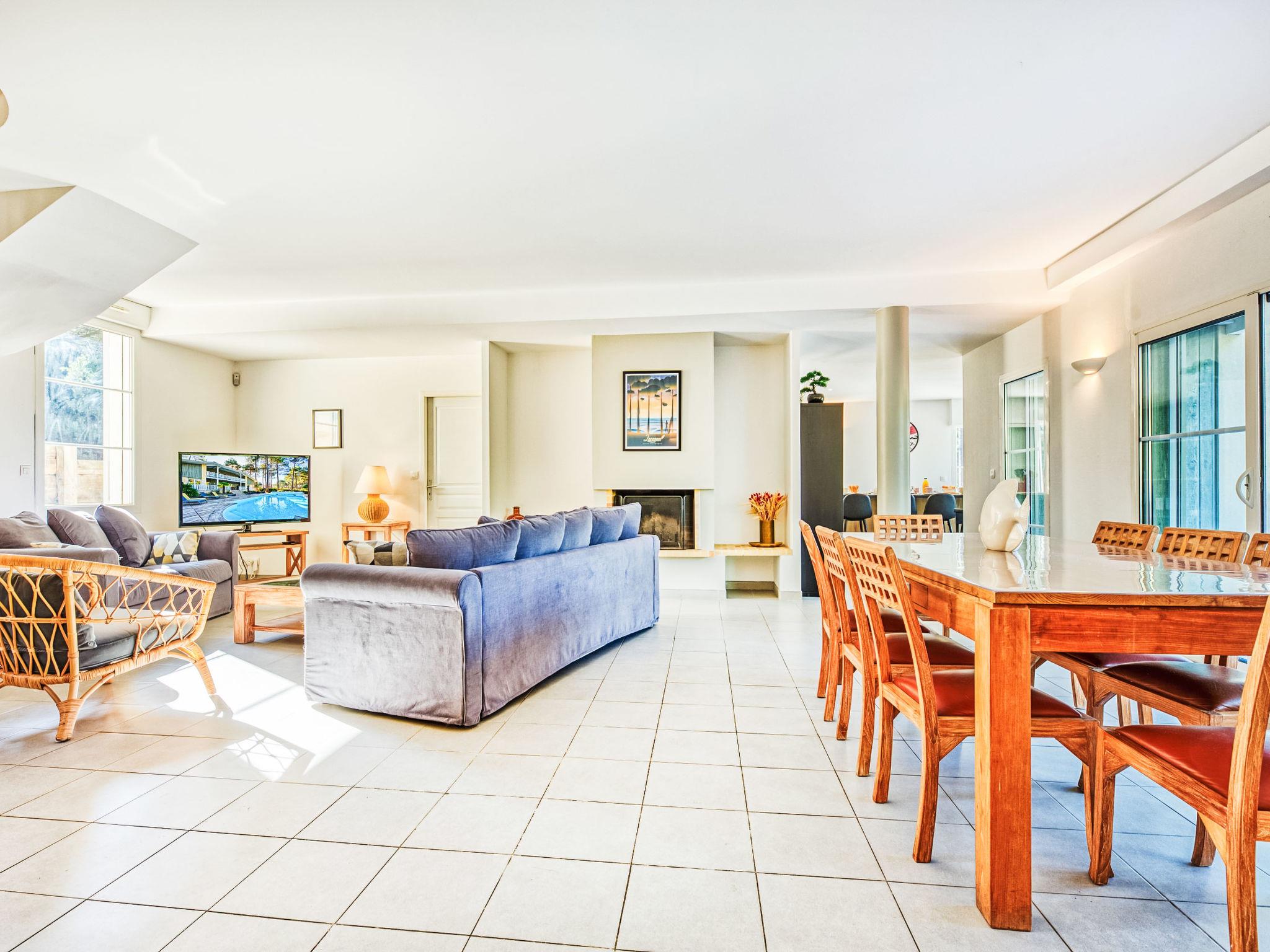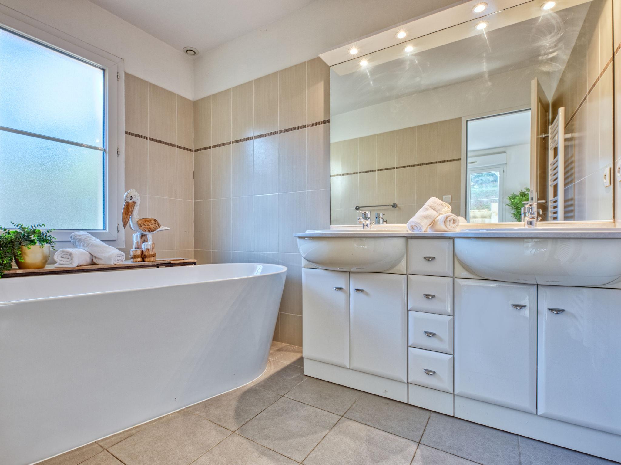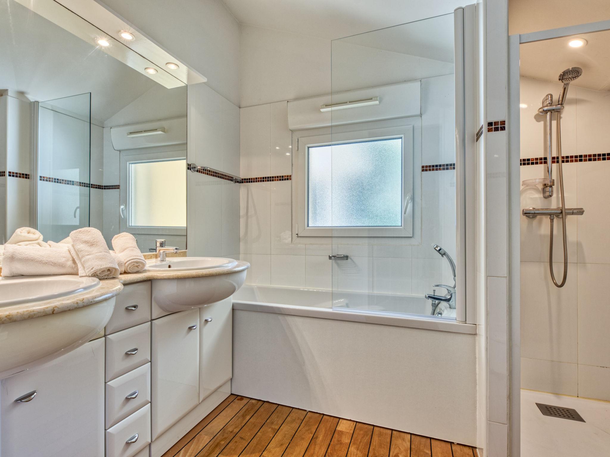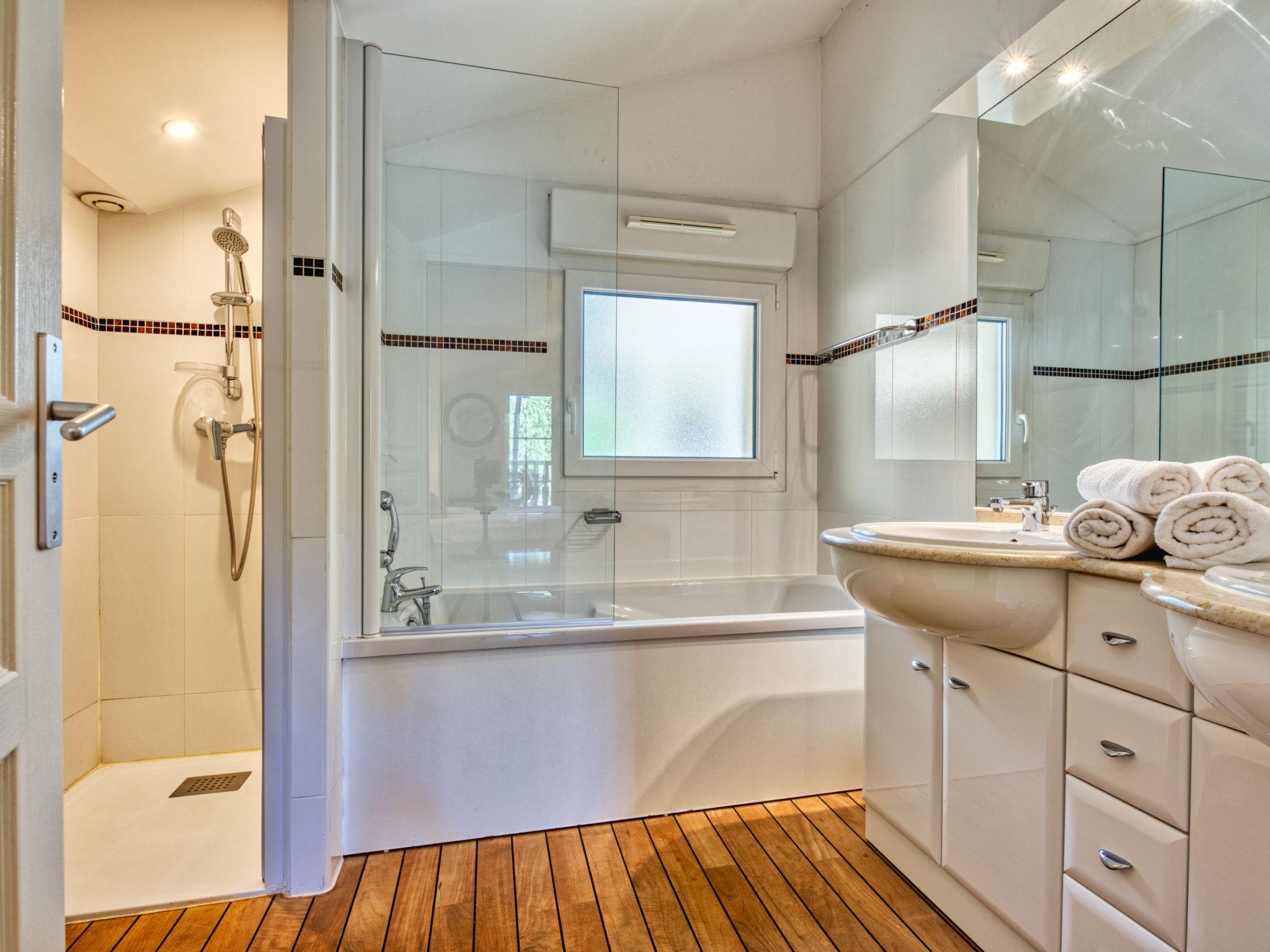 6-room villa 228 m2. Modern furnishings: large living/dining room with open-hearth fireplace and flat screen. 1 room with 1 french bed (180 cm, length 200 cm), bathroom and separate WC. 2 rooms, each room with 1 double bed (2 x 90 cm, length 200 cm), separate WC and shower. Large, open kitchen (oven, dishwasher, 4 induction hot plates, toaster, kettle, microwave, electric coffee machine, Capsules for coffee machine (Tassimo et senseo) extra) with TV. Exit to the garden, to the terrace. Upper floor: 1 room with 1 double bed (160 cm, length 200 cm), separate WC, bath/shower and TV. Exit to the balcony. 1 room with 1 french bed (2 x 90 cm, length 200 cm), bath/shower/WC. Large terrace, west facing position. Terrace furniture, deck chairs (6). Beautiful view of the swimming pool, the garden and the forest. Facilities: washing machine. Internet (WiFi, free). Parking (roofed). Please note: non-smoking house. Smoke alarm. Offer by a private individual according to Art. 155, IV of CGI.