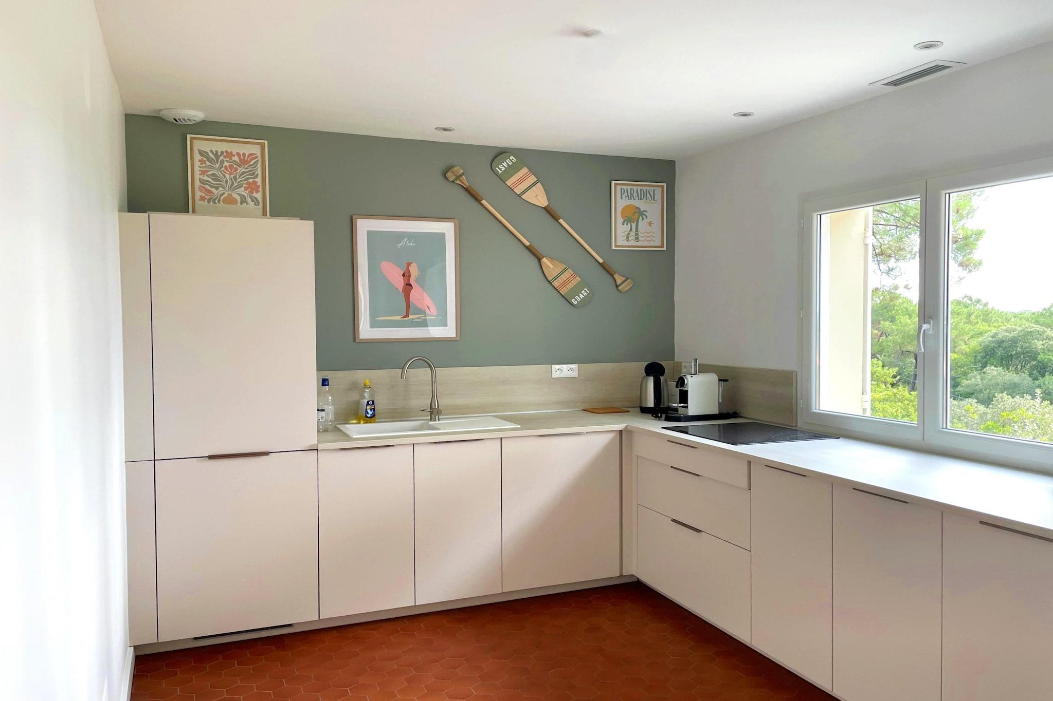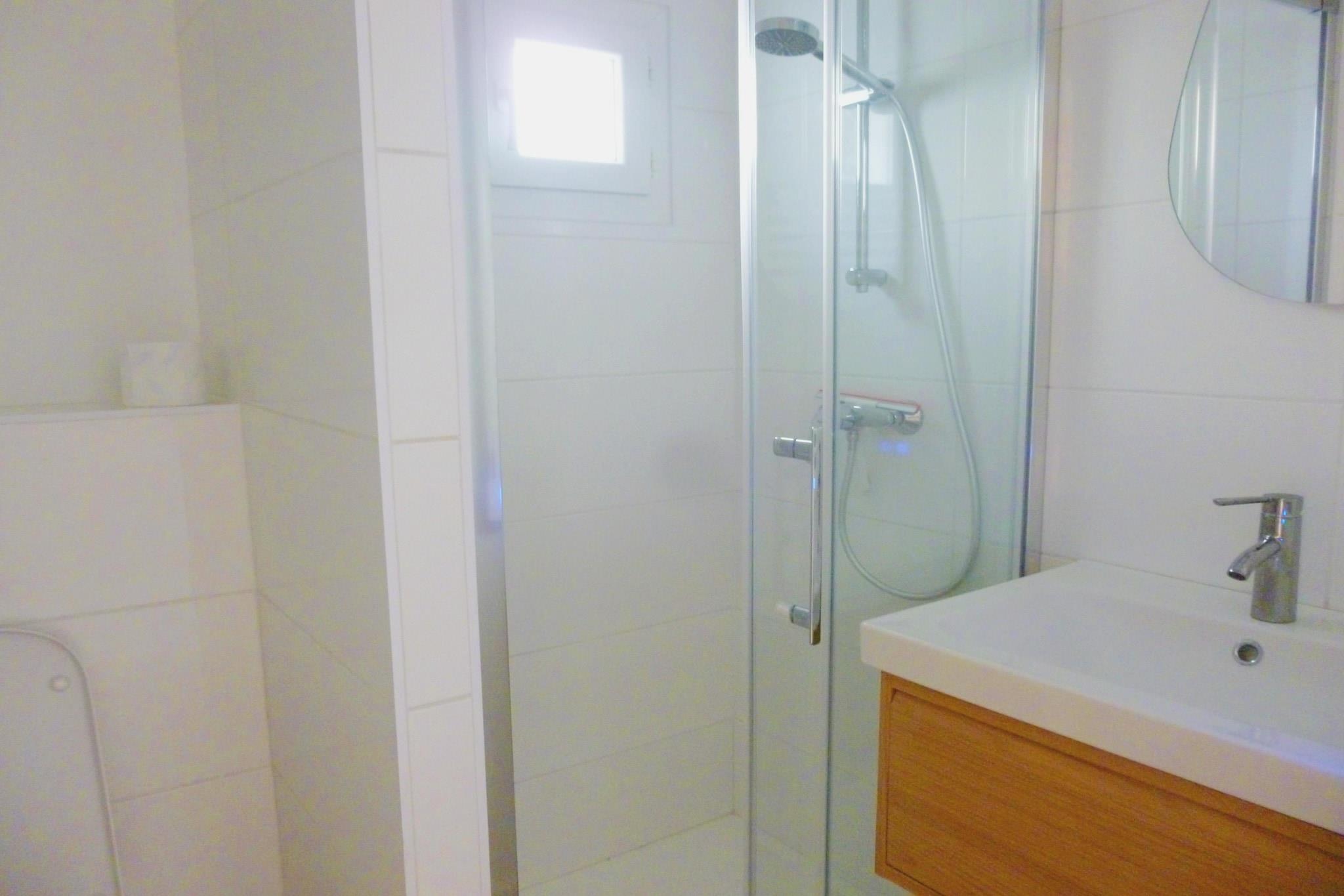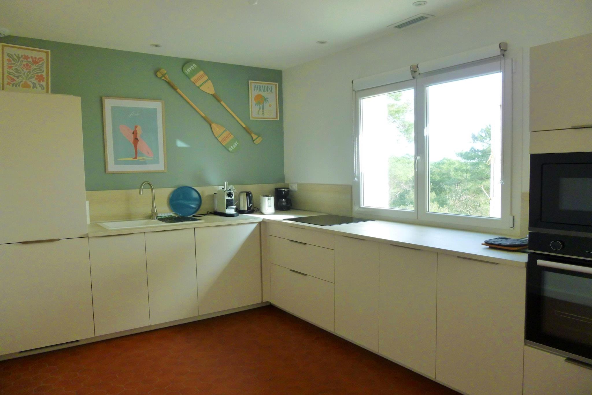 Ground floor: (Kitchen(toaster, cooker, coffee machine, dishwasher, fridge), Living/diningroom(TV, dining table, seating area), bedroom(double bed(140 x 190 cm), toilet), bedroom(double bed(140 x 190 cm)), bedroom(double bed(140 x 190 cm)), bathroom(shower), bathroom(shower), toilet, toilet) Guest house ground floor: (open kitchen(toaster, cooker, coffee machine, dishwasher, fridge), Living/diningroom(TV, dining table, seating area), bedroom(double bed(140 x 190 cm)), bathroom(shower, washbasin), toilet) washing machine, terrace(30 m2), parking