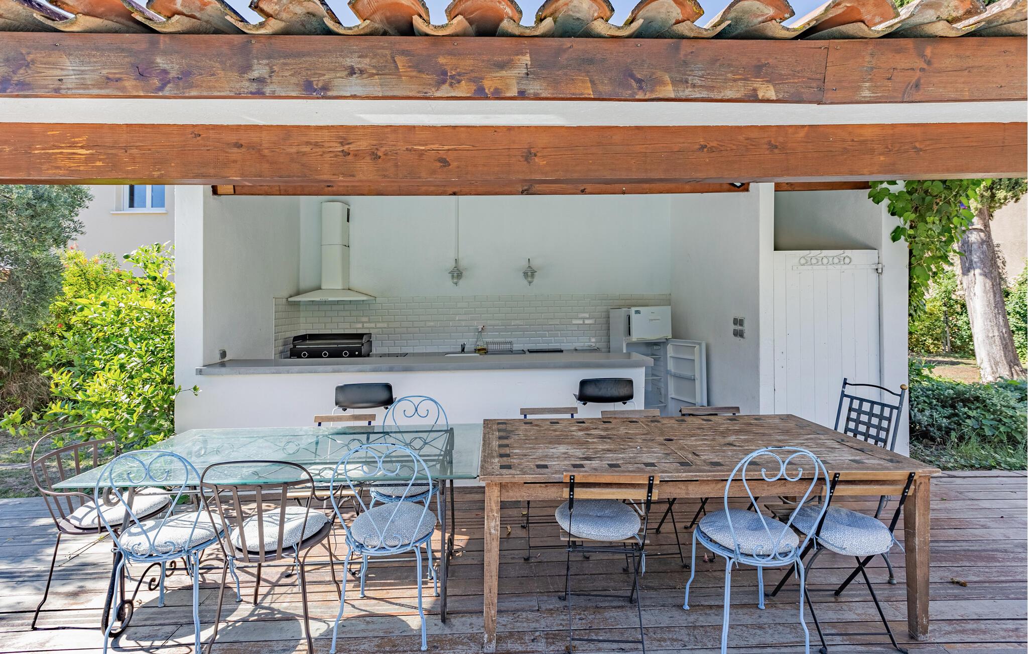Verbringen Sie nicht nur im hellen, offenen Wohnbereich gesellige Stunden, sondern genießen Sie auch Ihre Zeit im schönen Außenbereich. Machen Sie sich es auf den Sonnenliegen in der Sonne bequem und schwimmen Sie ab und zu eine Runde im Pool. Bereiten Sie in der gemütlichen Außenküche leckere Mahlzeiten zu, während Sie die Kinder beim Spielen zusehen.