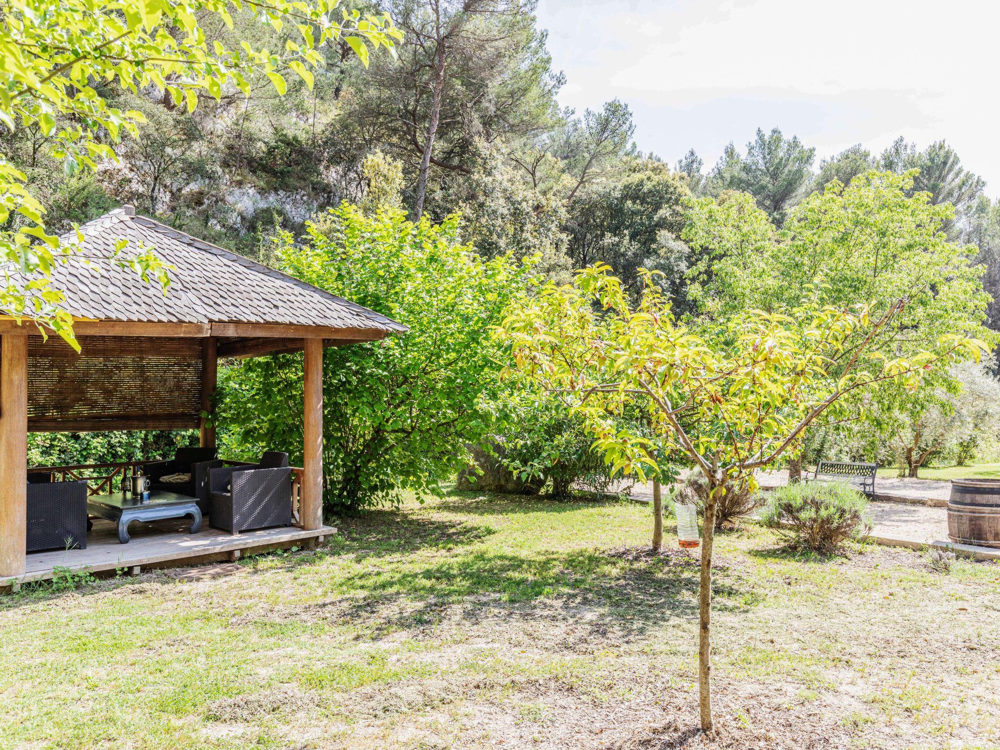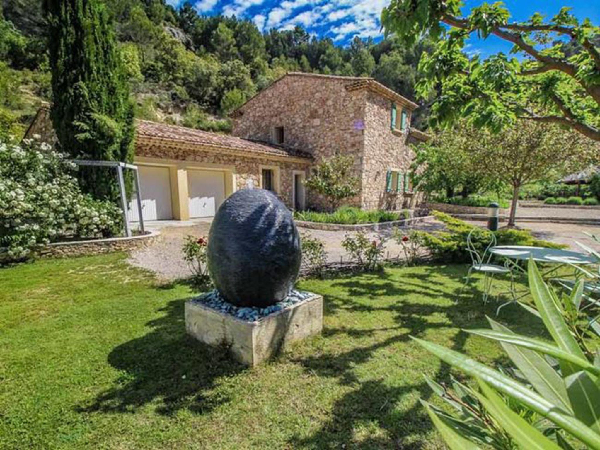 Le Barroux 7 km from Malaucène: Villa "L'Oliveraie", 2 storeys, built in 2005, surrounded by trees. In the resort 2 km from the centre of Le Barroux. Private: property 3 ha, well-kept garden (fenced) with wildlife garden and flowers, swimming pool angular, with privacy (5 x 8 m, depth 120 - 175 cm, seasonal availability: 01.May. - 30.Sep.). Pool house, table tennis, boules. In the house: massage (extra). Trampoline. Breakfast and half board possible (extra). Parking (for 2 cars) on the premises. Grocery 2 km, supermarket 7 km, restaurant 500 m, bakery 2 km, bus stop "Le Barroux" 1.3 km. Nearby attractions: Château du Barroux 2 km, Malaucène 7 km, Parc Spiroux 20 km, Wave Island 20 km, Mont Ventoux 21 km. Please note: car recommended. Suitable for families, baby equipment on request (included). Residence with electric gates. The owner lives on the same property.