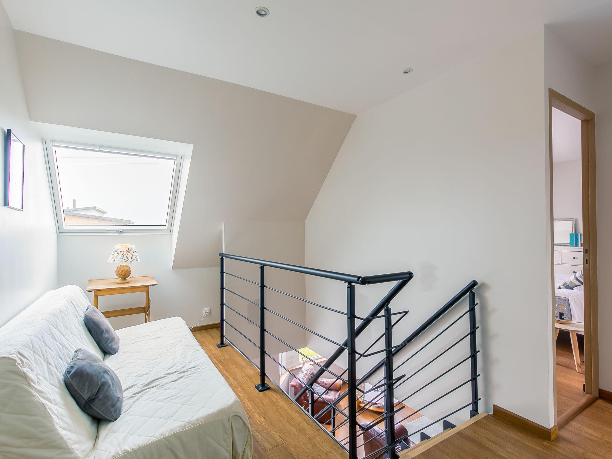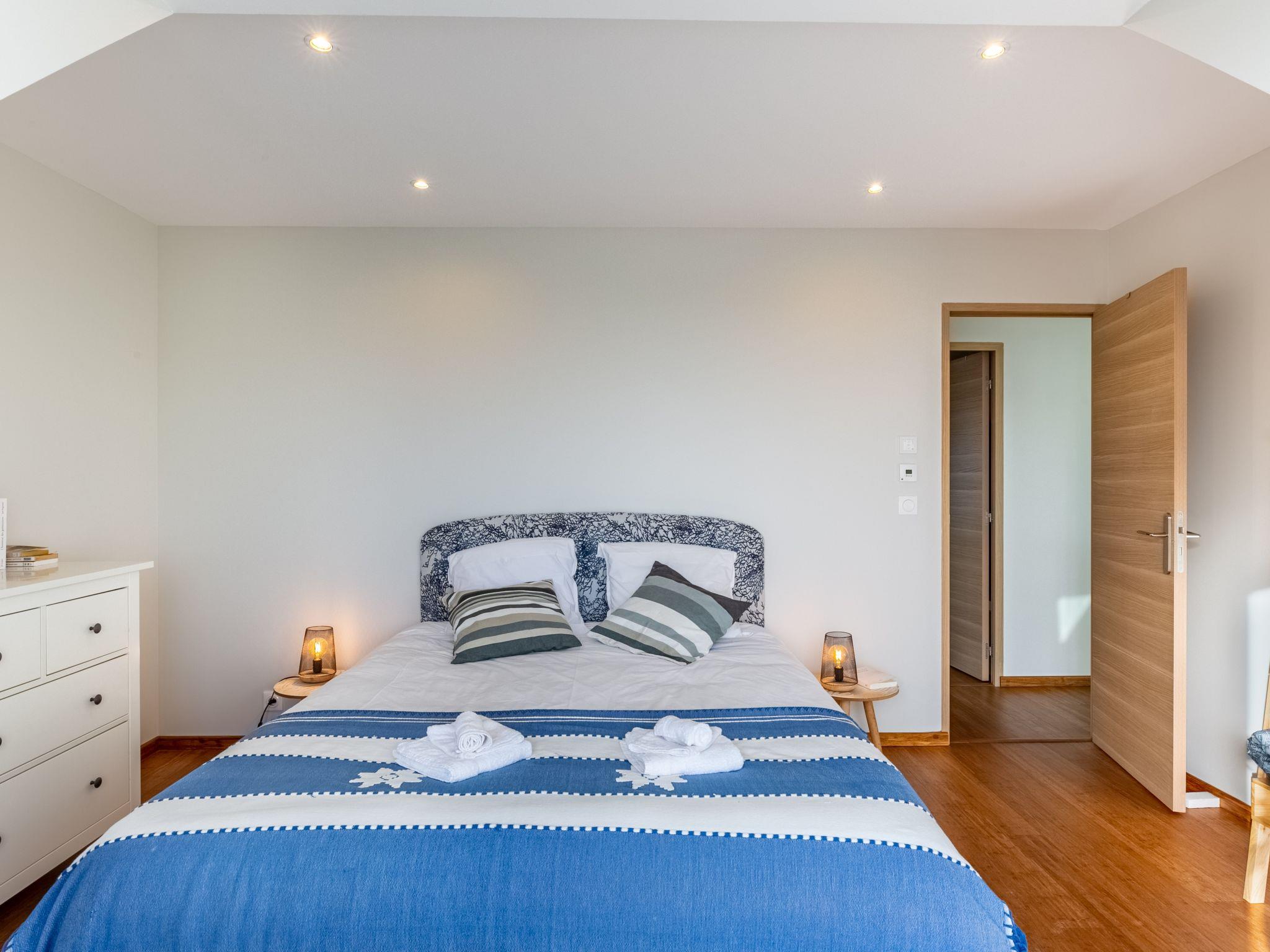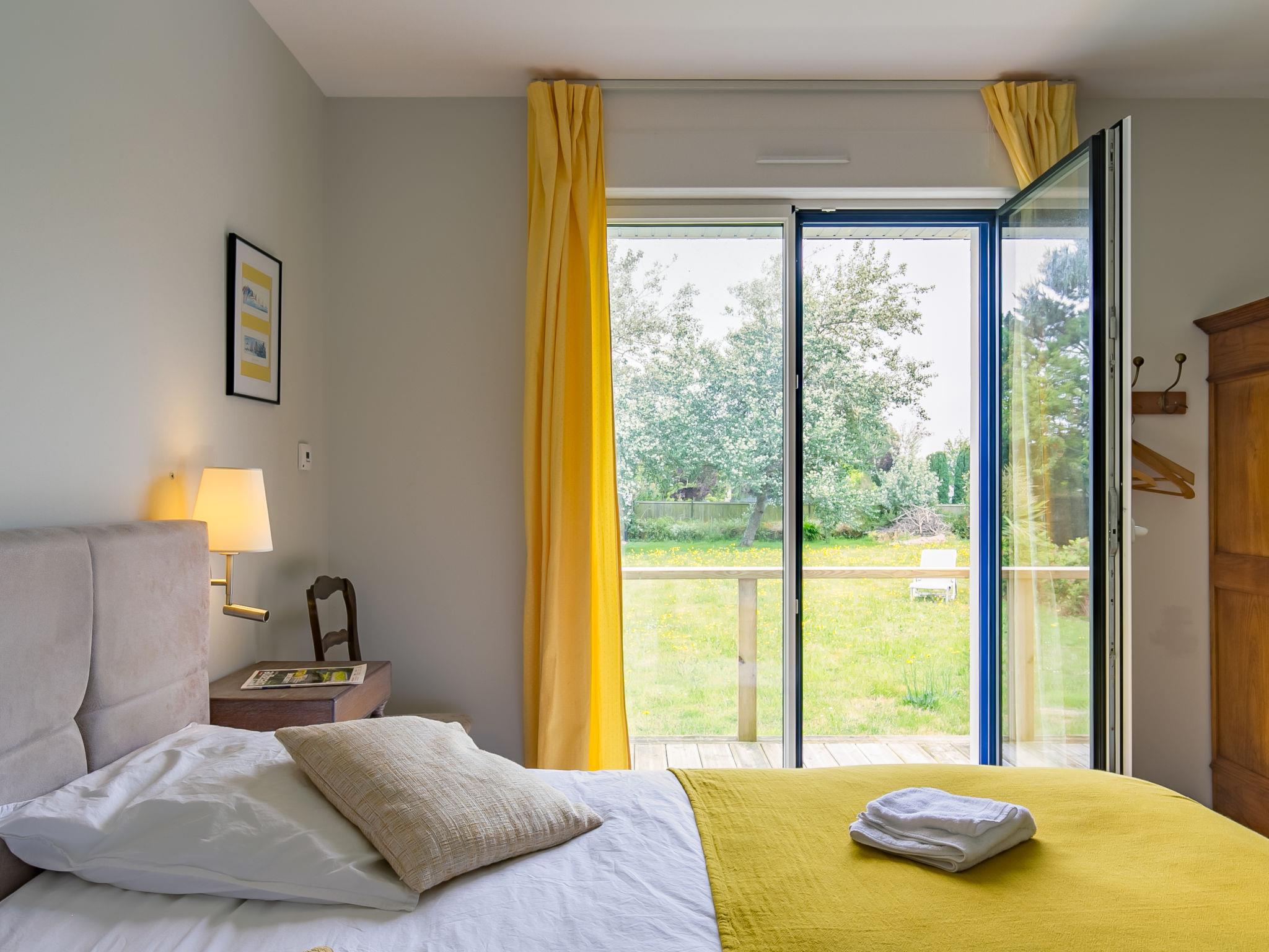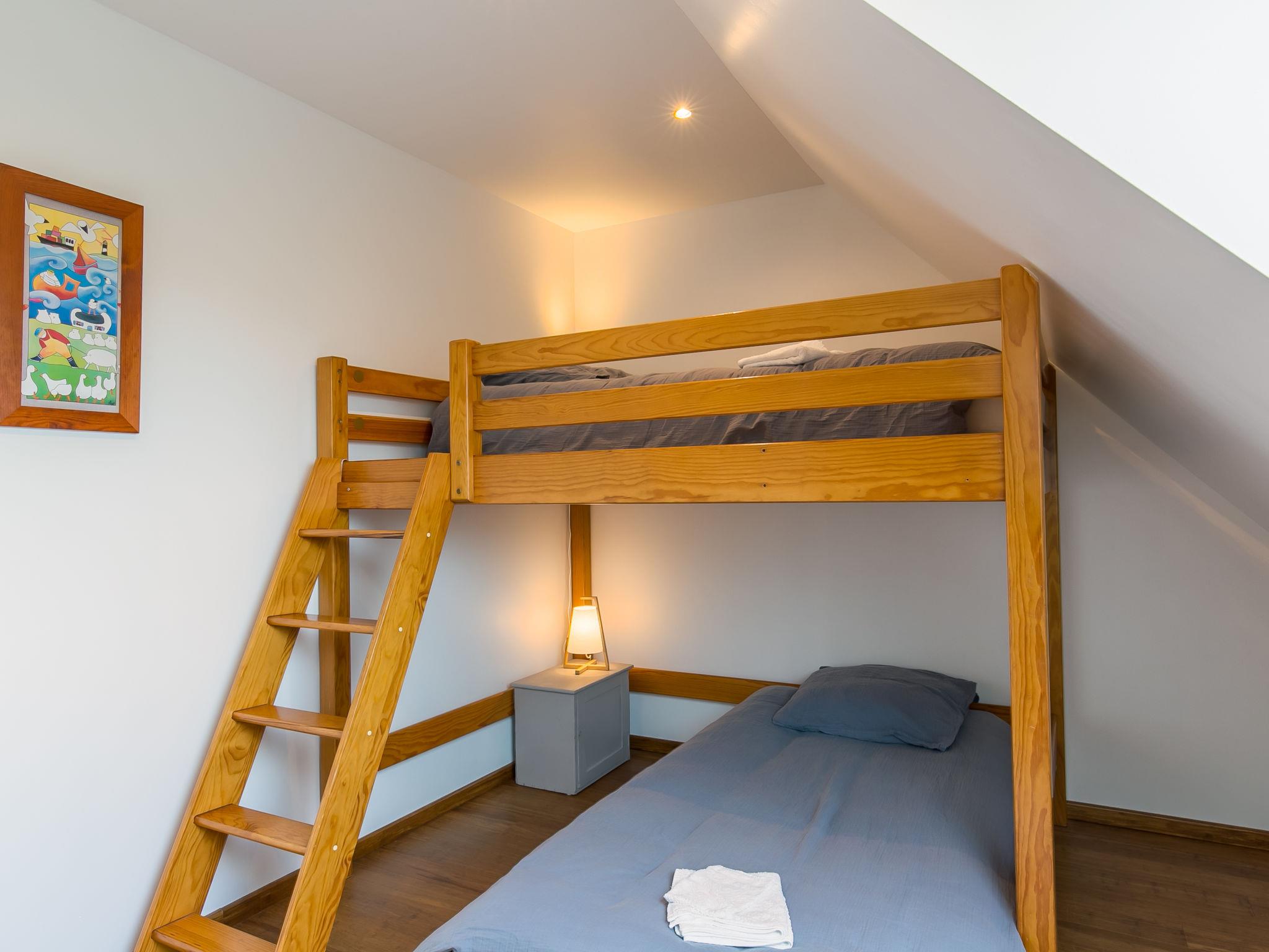 "La Grève bleue", 5-room house 140 m2. Object suitable for 6 adults + 2 children. Spacious and bright, fully renovated in 2021, comfortable and modern furnishings: large living/dining room with open-hearth fireplace, dining table, digital TV and flat screen. Exit to the garden, to the terrace. 1 room with 1 french bed (160 cm, length 200 cm). Kitchen (oven, dishwasher, 3 induction hot plates, toaster, kettle, microwave, freezer, electric coffee machine, cooking island) with dining table. Shower/WC. Electric heating. Upper floor: 1 room with 1 french bed (160 cm, length 200 cm). 1 room with 2 beds (80 cm, length 200 cm). 1 children's room with 1 x 2 bunk beds (90 cm, length 190 cm). Shower, sep. WC. Small balcony 4 m2, south facing position and west facing position, terrace 16 m2, south facing position and west facing position. Terrace furniture, balcony furniture, barbecue (portable), deck chairs (2). Distant view of the sea. Facilities: washing machine, baby cot, baby changing unit. Internet (WiFi, free). Please note: suitable for families. Non-smoking house. Smoke alarm.
