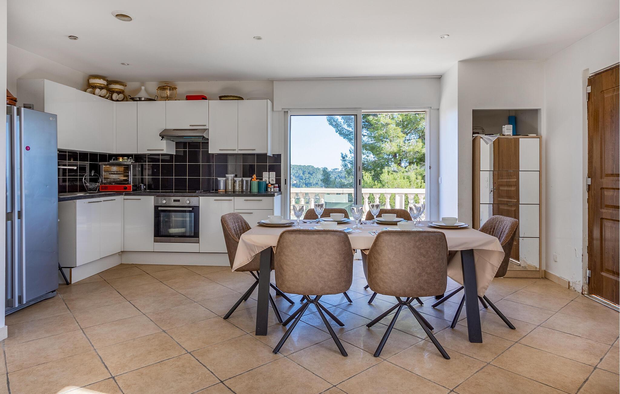 Diese helle Ferienwohnung empfängt Sie mit großzügig geschnittenen Räumlichkeiten und einer eleganten, minimalistischen Einrichtung. Nutzen Sie die moderne, gut ausgestattete Küche, um mit Kräutern der Provence zu experimentieren, und genießen Sie das Resultat gemeinsam im stilvollen Essbereich, während die aromatische Brise durch den Wohnbereich strömt. Machen Sie es sich abends vor dem Fernseher bequem oder entspannen Sie sich nach einer ausgedehnten Wanderung auf dem gemütlichen Sofa.