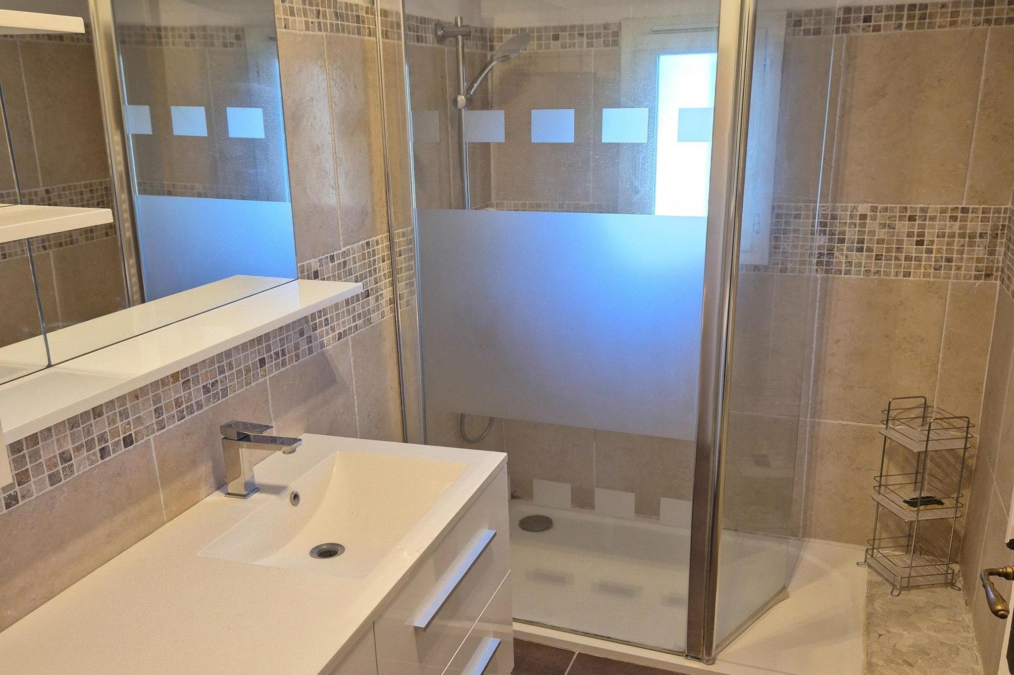 Ground floor: (Kitchen(electric kettle, cooker(gas), coffee machine(filter), oven, microwave, dishwasher, fridge, freezer, air conditioning), Living/diningroom(TV(flatscreen), dining table(10 persons), air conditioning), Bedroom with bathroom(double bed, shower, toilet), bathroom(shower, toilet), playroom) On the 1st floor: (bedroom(double bed), bedroom(double bed or 2 single beds), Bedroom with bathroom(double bed, bath tub, shower, toilet), Bedroom with bathroom(double bed, bath tub, shower, toilet), shower, toilet) garage, tumble dryer, cot, air conditioning, terrace, terrace(roofed), garden(partially fenced), garden furniture, BBQ, parking, deckchairs, swimming pool(private, fenced, 10 x 5 m.), play equipment, table football, plancha grill