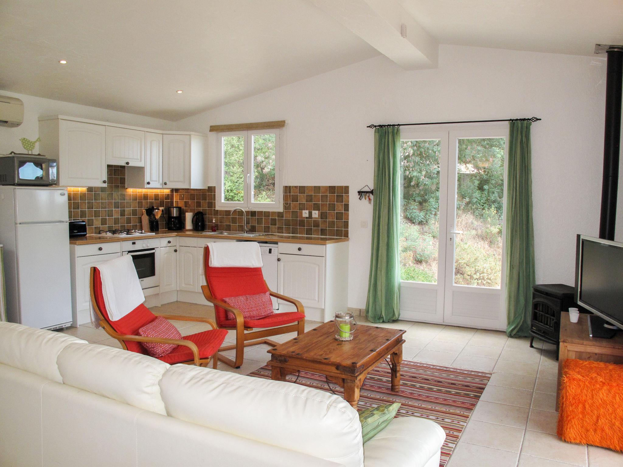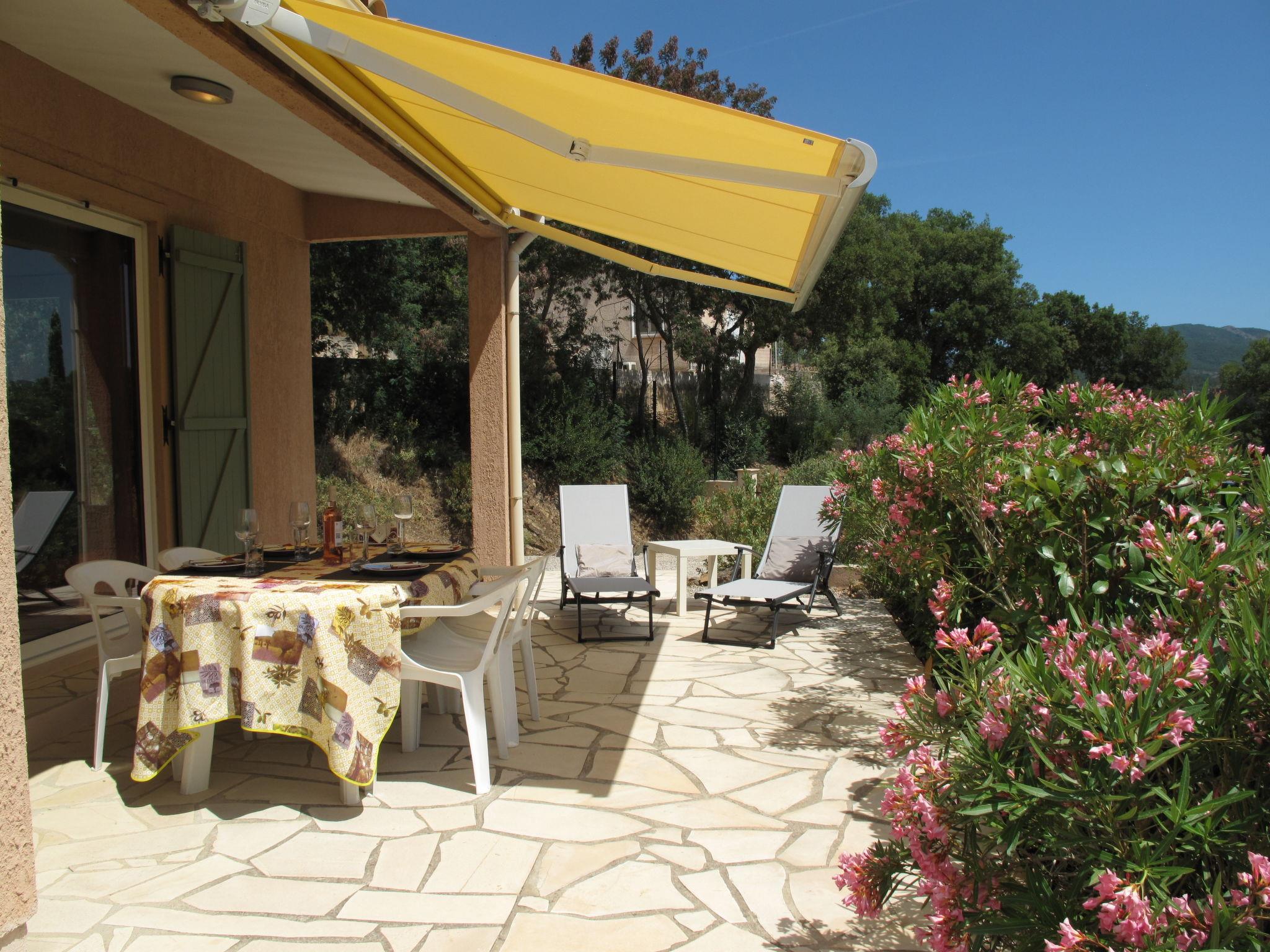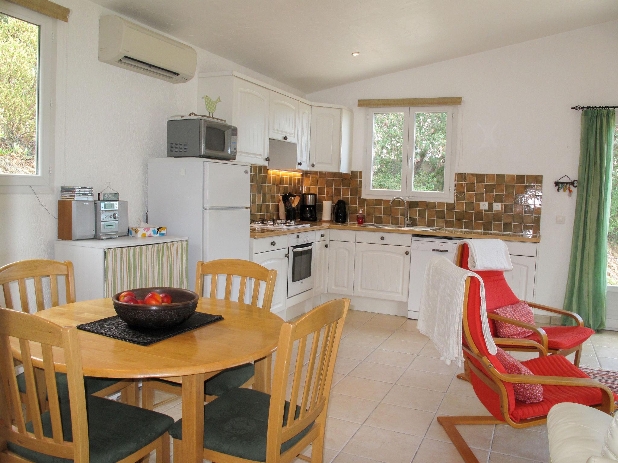 " Marie-Julie", 3-room house 60 m2. Practical and beautiful furnishings: living/dining room with satellite TV (flat screen), DVD. Exit to the terrace. 1 room with 1 french bed (160 cm, length 190 cm), shower. Exit to the terrace. 1 room with 1 french bed (160 cm, length 190 cm). Kitchen (oven, dishwasher, 4 gas rings, toaster, kettle, microwave, electric coffee machine). Shower/WC, sep. WC. Air-conditioning. Terrace 20 m2. Terrace furniture. Facilities: washing machine, children's high chair, baby cot (extra). Please note: non-smoking house. Smoke alarm. FR64948