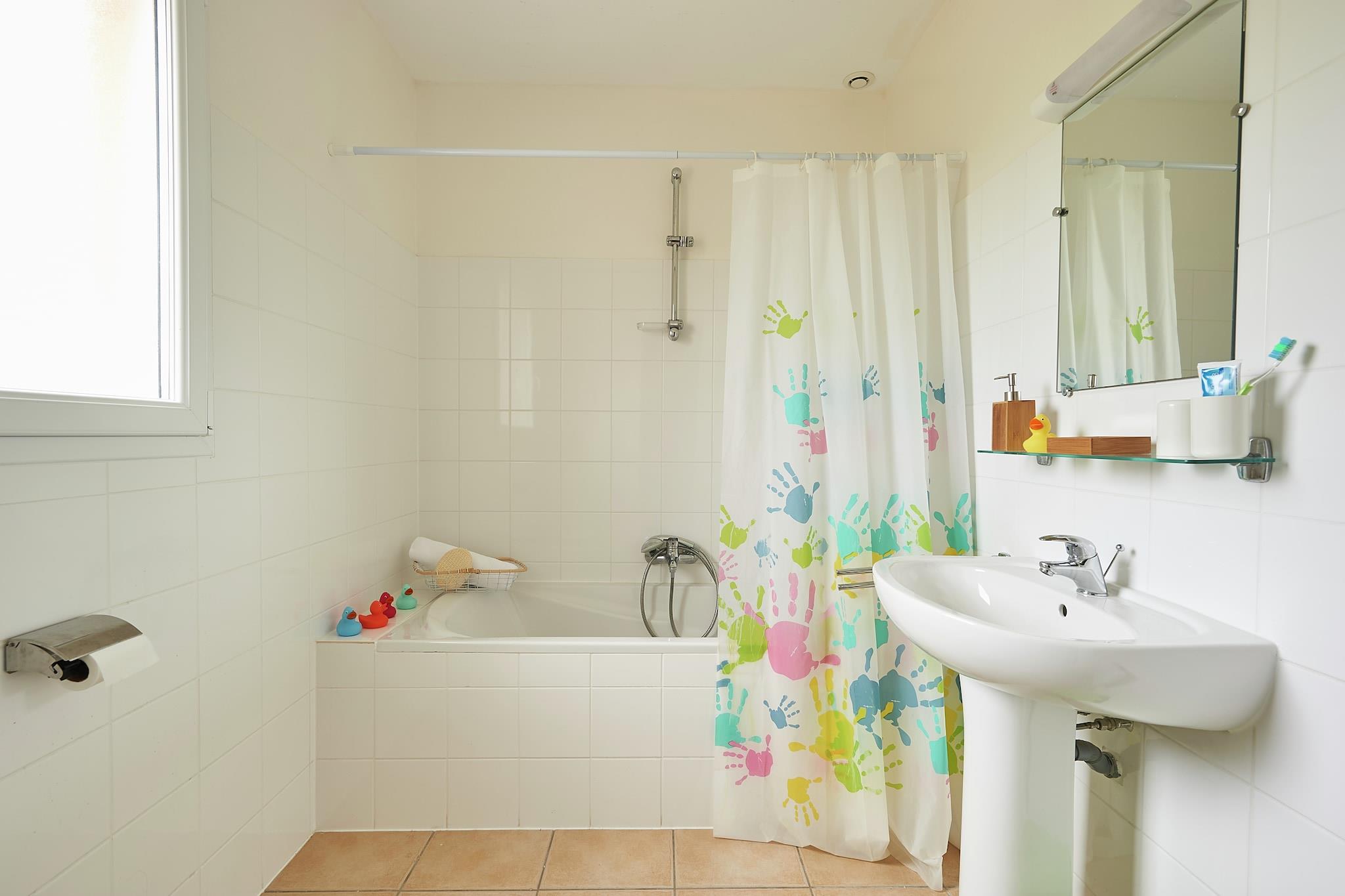 Ground floor: (hallway, Living room(TV(dutch television channels), fireplace, DVD player), Kitchen(oven, microwave, dishwasher, fridge-freezer), bedroom(double bed or 2 single beds), bedroom(double bed or 2 single beds), bedroom(double bed or 2 single beds), bathroom(shower, washbasin), bathroom(bath tub, washbasin), toilet, toilet) washing machine, garden doors, heating(central), terrace(roofed), garden, garden furniture, BBQ, swimming pool(shared with other guests), boules court