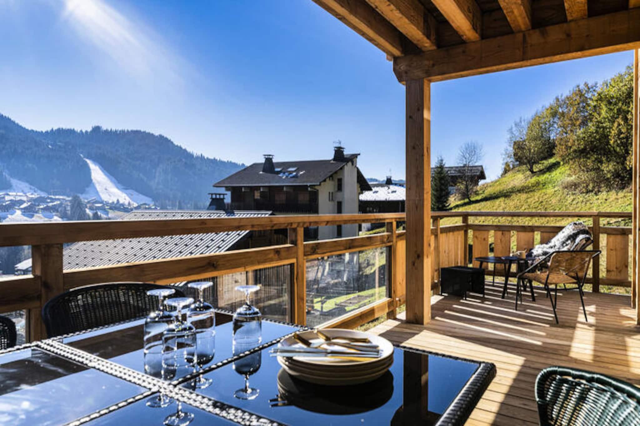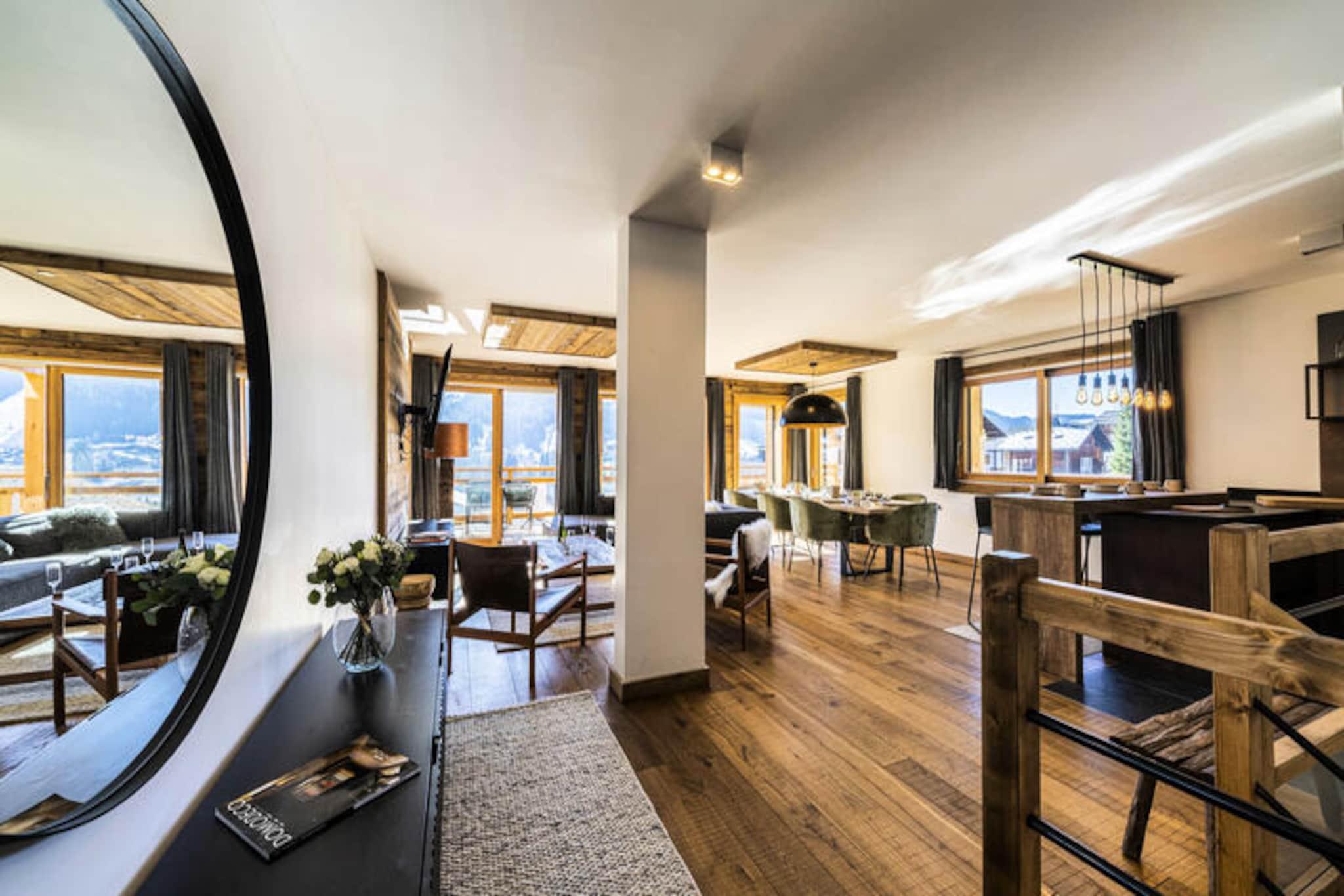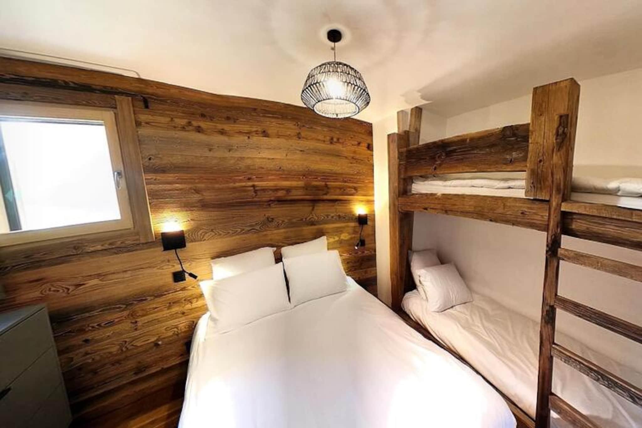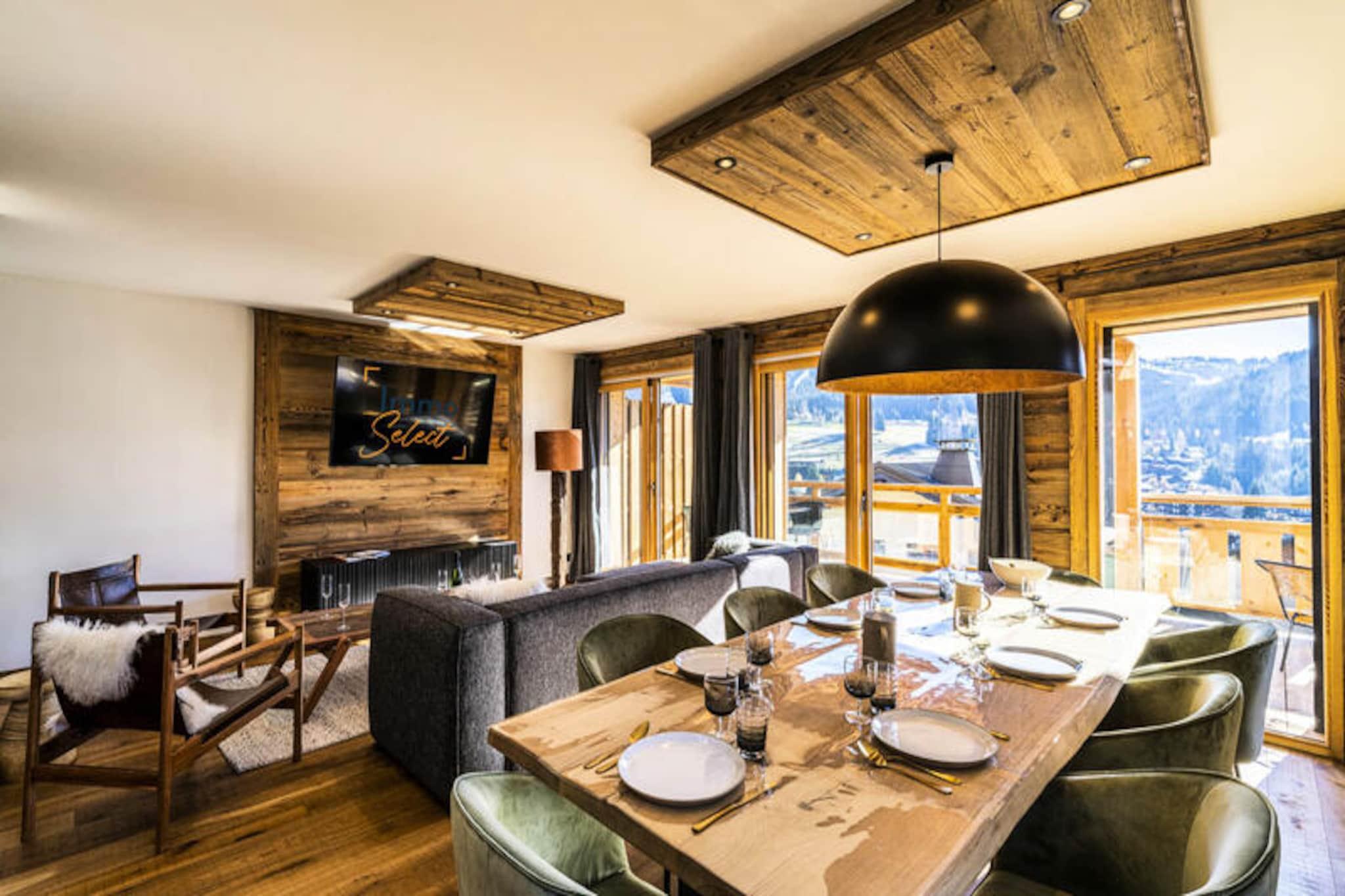 Perched high above the resort with breathtaking views of the surrounding mountains, this luxurious duplex apartment offers a serene alpine retreat. Completed in 2020 with premium materials, the property seamlessly blends modern elegance with the natural charm of its idyllic setting. Bathed in sunlight thanks to its south-east exposure and expansive bay windows, the apartment invites you to relax and recharge in a warm, cozy atmosphere. Just 450 meters from the center and shops, and a short 650-meter stroll to the ski slopes and French Ski School, this location combines tranquility with convenience. A shuttle stop just 60 meters away ensures easy access to all the area has to offer. Spanning 103 m², this 4-star rated duplex is ideal for families or groups of up to 8 guests. The first level features a welcoming entrance hall and a spacious living room that opens onto a sun-drenched terrace, perfect for soaking in the panoramic views. The fully equipped kitchen, complete with a Nespresso machine, wine cellar, and raclette set, ensures you can enjoy gourmet meals in the comfort of your home away from home. On the lower level, two en-suite double bedrooms with plush bedding and modern amenities provide ultimate comfort, while a dormitory area with bunk beds and single beds offers a fun and functional space for children or additional guests. The property is equipped with underfloor heating, Wi-Fi, and four televisions, ensuring a comfortable stay year-round. Additional amenities include a washing machine, dryer, and private ski lockers. Guests benefit from included services such as end-of-stay cleaning, linens, towels, and beds made upon arrival. With its peaceful location, stunning views, and proximity to key facilities, this apartment is the perfect base for an unforgettable alpine getaway. Whether you're skiing in winter or hiking in summer, this property promises a truly exceptional experience.