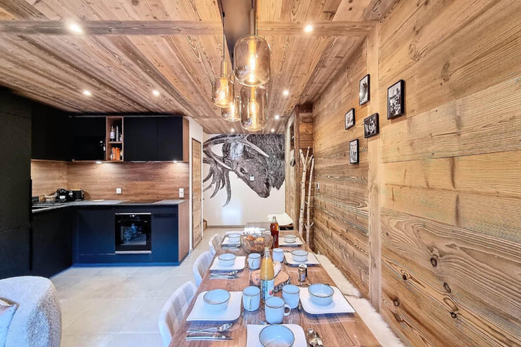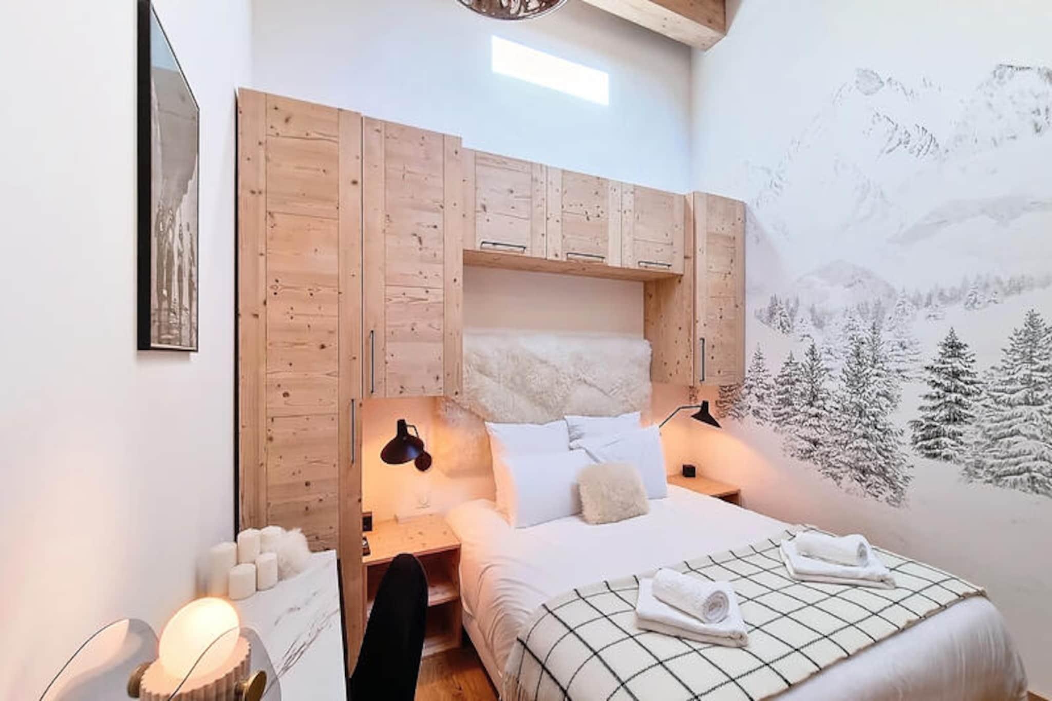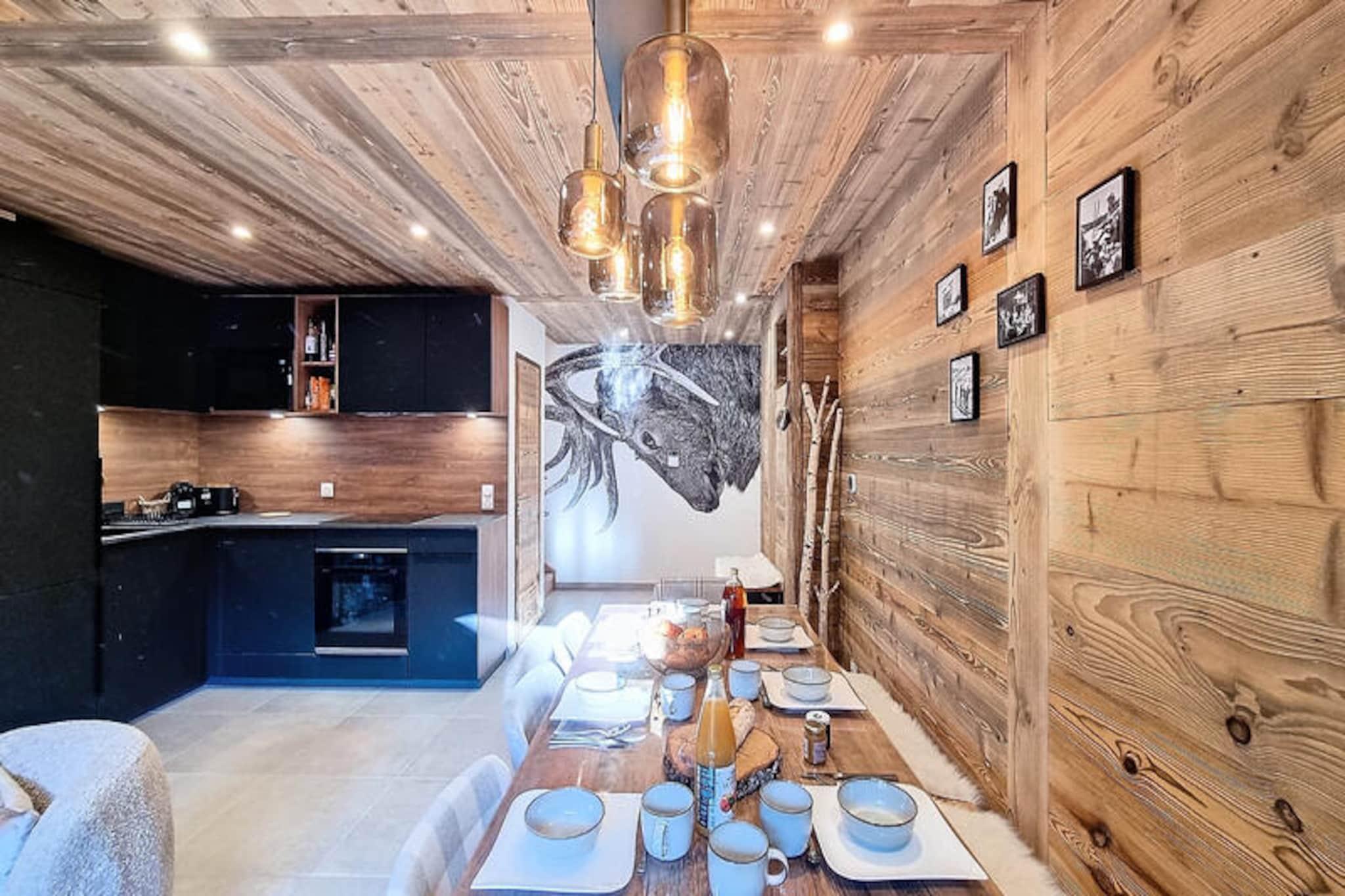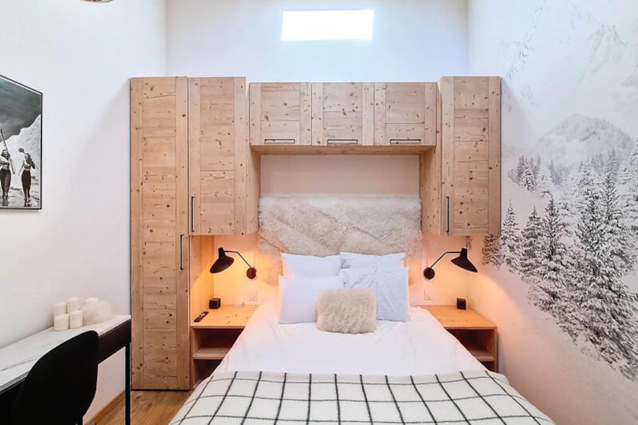 In the heart of the charming Les Gets ski resort, this beautifully designed 100 m² apartment offers a warm and inviting retreat for your mountain holiday. Surrounded by the breathtaking landscapes of the French Alps, this property combines modern comfort with alpine charm, creating the perfect setting for unforgettable family moments. Whether you're here to carve through pristine slopes or simply relax in a serene environment, this home is your gateway to a magical winter or summer escape. \n\nThe apartment comfortably accommodates up to 8 guests across 4 thoughtfully arranged bedrooms. Two double bedrooms feature en-suite bathrooms for added privacy, while a third double bedroom and a cozy cabin room with bunk beds share a spacious shower room. Each double bedroom is equipped with its own television, and all bathrooms are fitted with hairdryers for your convenience. The open-plan kitchen is fully equipped, boasting a refrigerator, dishwasher, microwave, raclette grill, and fondue set—perfect for preparing hearty alpine meals. Additional amenities include a washing machine, two ski storage spaces, and a cellar, ensuring a hassle-free stay. The property also offers a two-space underground garage and complimentary Wi-Fi.\n\nIdeally located just 50 meters from the market square and less than 200 meters from the supermarket and local shops, this apartment places you at the heart of Les Gets' vibrant village life. The ski lifts are an easy 8-minute walk away, while a nearby shuttle stop provides convenient access to Alta Lumina, a magical light and sound experience. Whether you're exploring the slopes, strolling through the village, or enjoying the region's culinary delights, everything you need is within reach.\n\nChoose this delightful apartment for your next alpine getaway and create cherished memories in the enchanting surroundings of Les Gets. With its blend of comfort, style, and unbeatable location, it's the perfect home base for your mountain adventures.