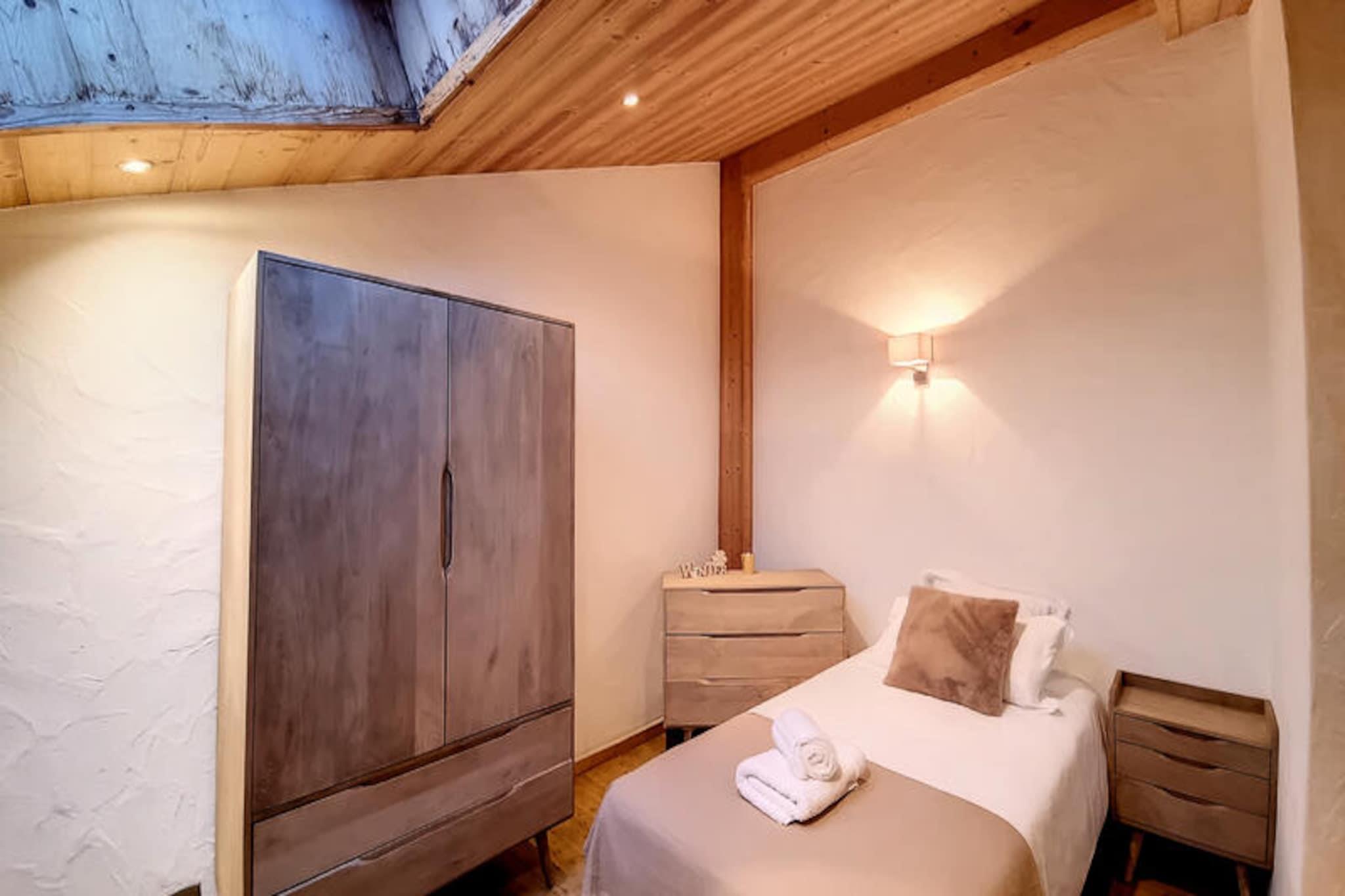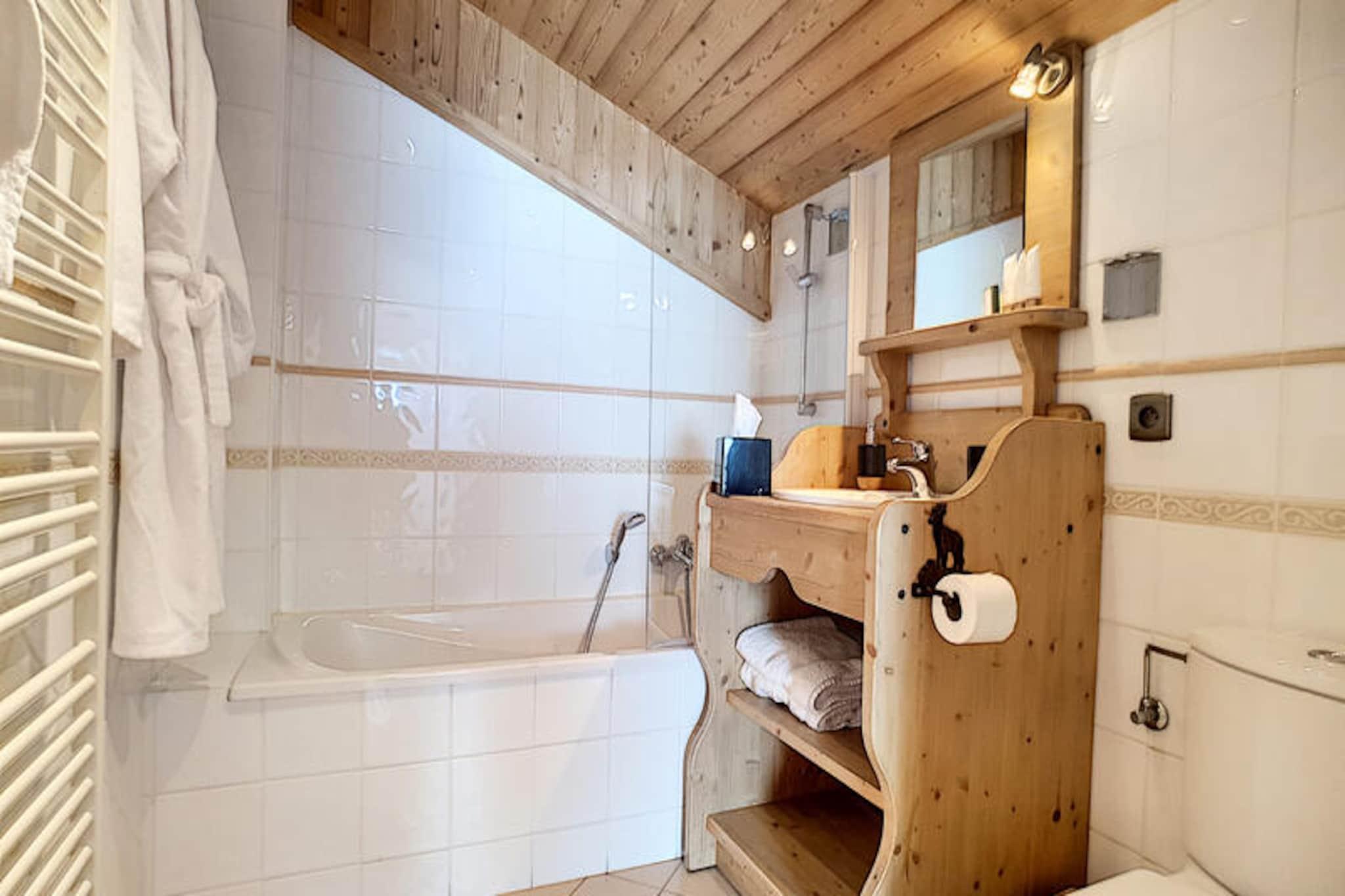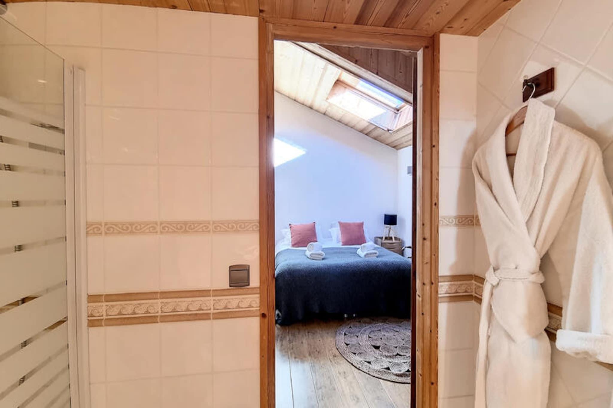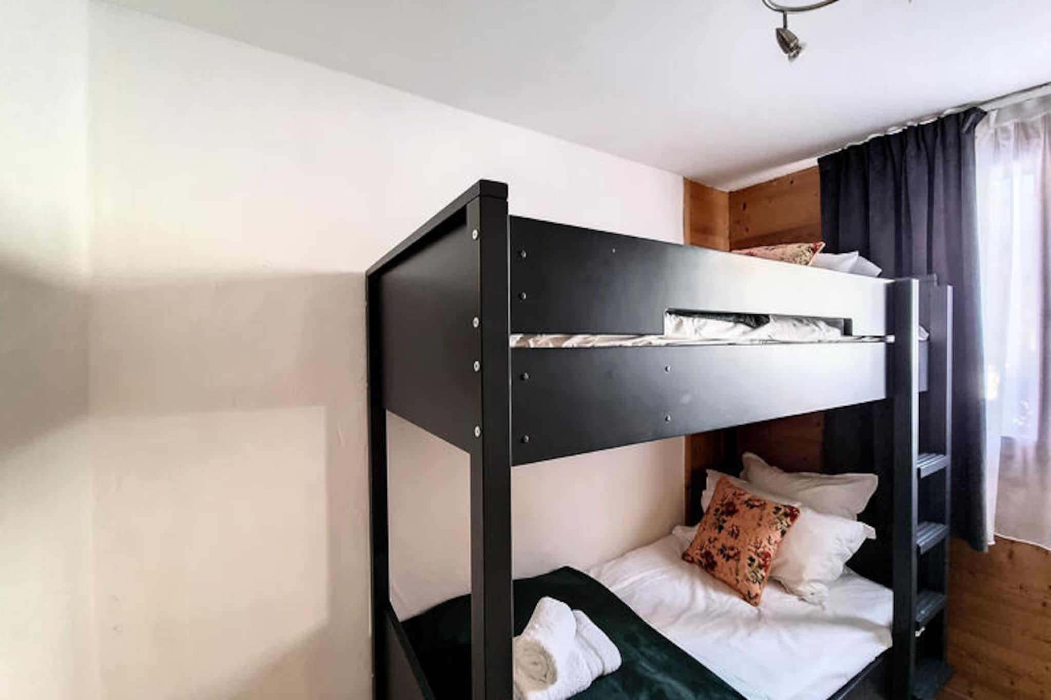This elegant chalet offers an exceptional stay that combines modern comfort with alpine charm. The spacious living room greets you with a cozy fireplace, a comfortable seating area, and direct access to a sunny terrace – perfect for unwinding after a day of exploring the stunning surroundings. The open-plan kitchen is fully equipped, making it an ideal space for preparing delicious meals with friends or family. The chalet is ideally located to enjoy the beauty of the Alps, offering proximity to skiing, hiking, and mountain biking activities. You’ll be just a short distance from local shops, restaurants, and other amenities, ensuring that all your needs are met during your stay. Book this exceptional chalet for a perfect alpine getaway! The chalet's bedrooms are designed with your comfort in mind. The master bedroom features a double bed (180x200) that can be separated into two single beds (90x200) and includes a private shower room. The other two bedrooms also have en-suite bathrooms, ensuring privacy and convenience. The second bedroom’s playful bunk beds are perfect for families or groups. For added convenience, a private outdoor parking space and a ski locker are provided, ensuring easy access to your gear after a day on the slopes.