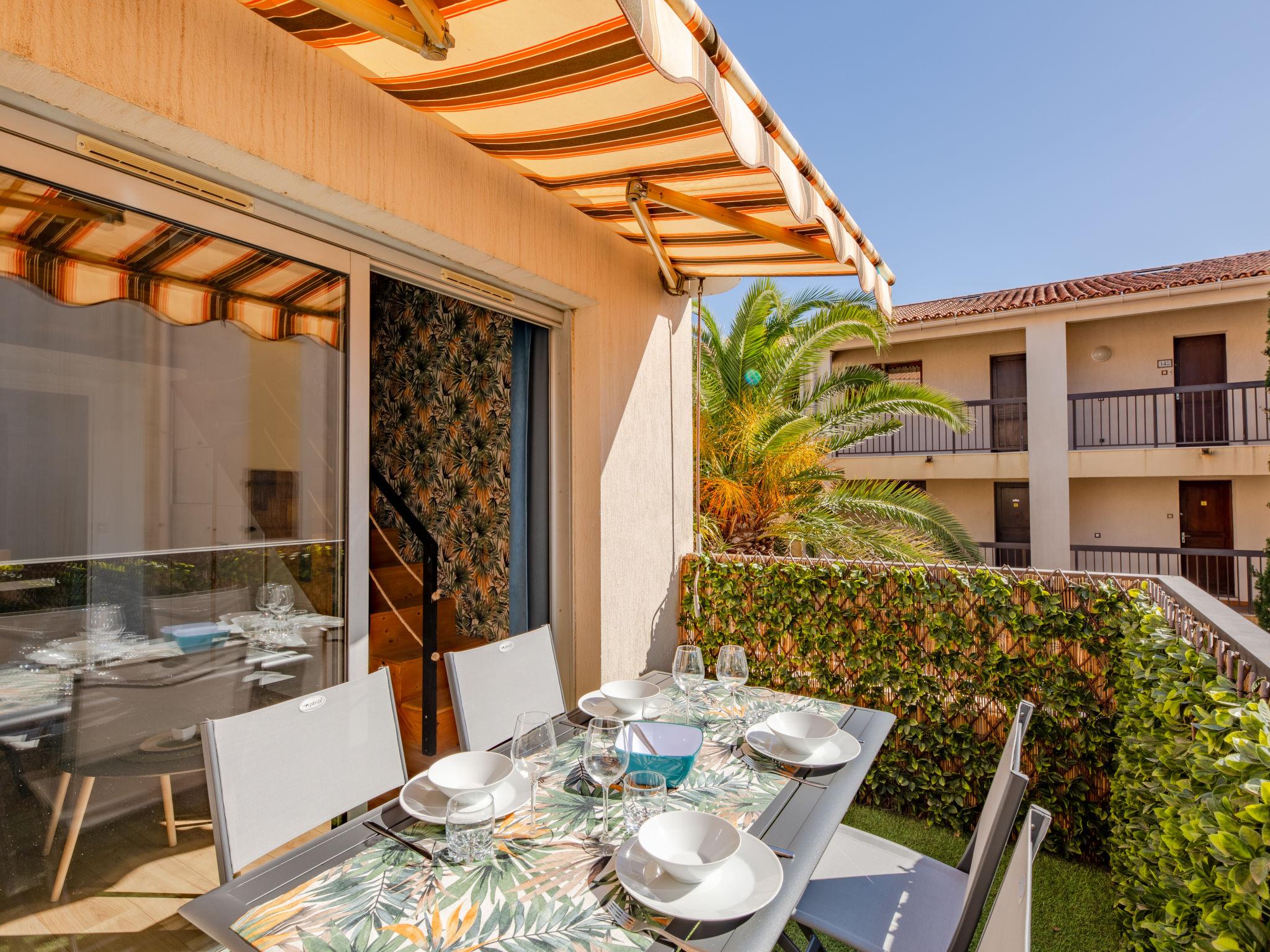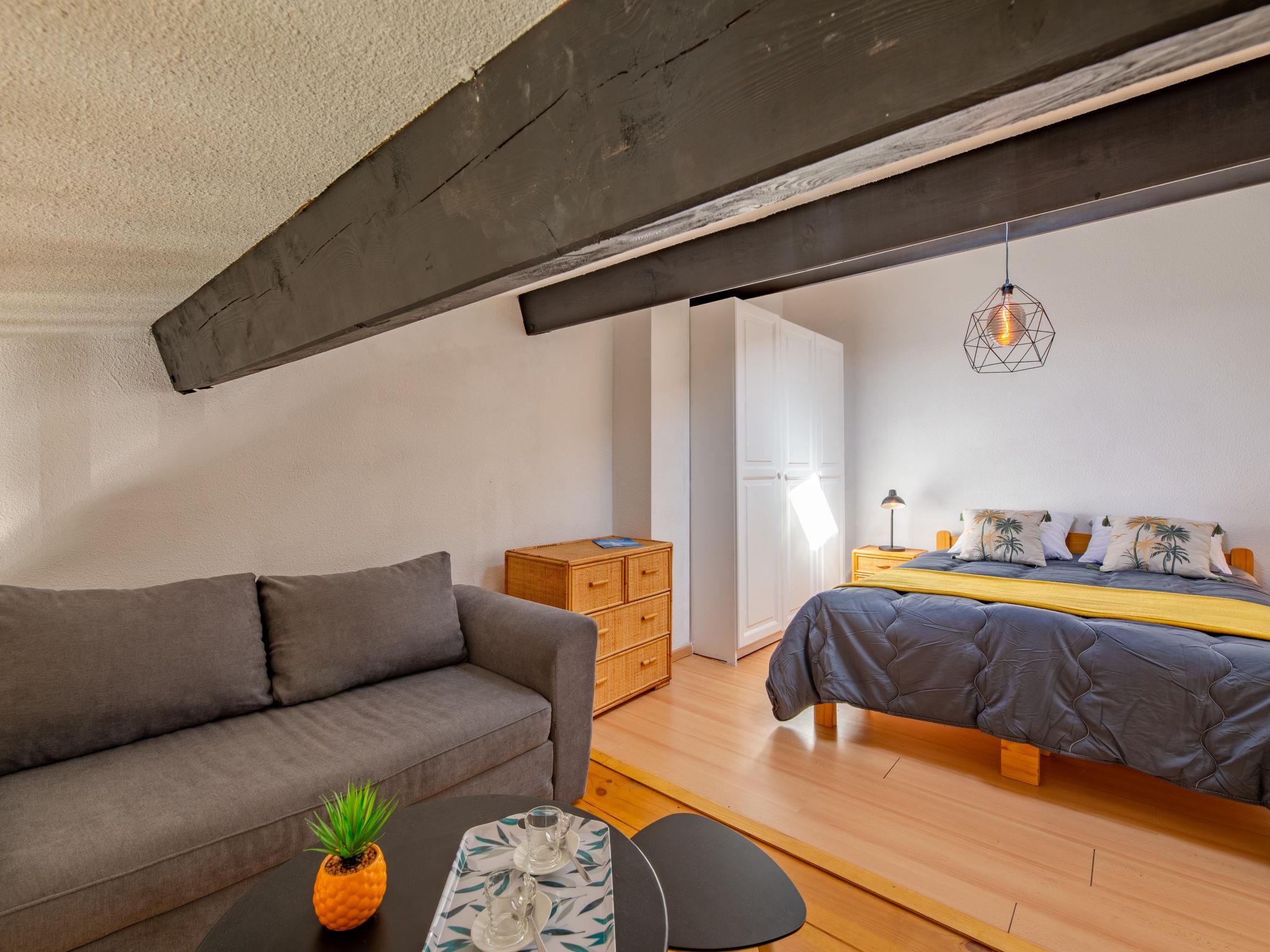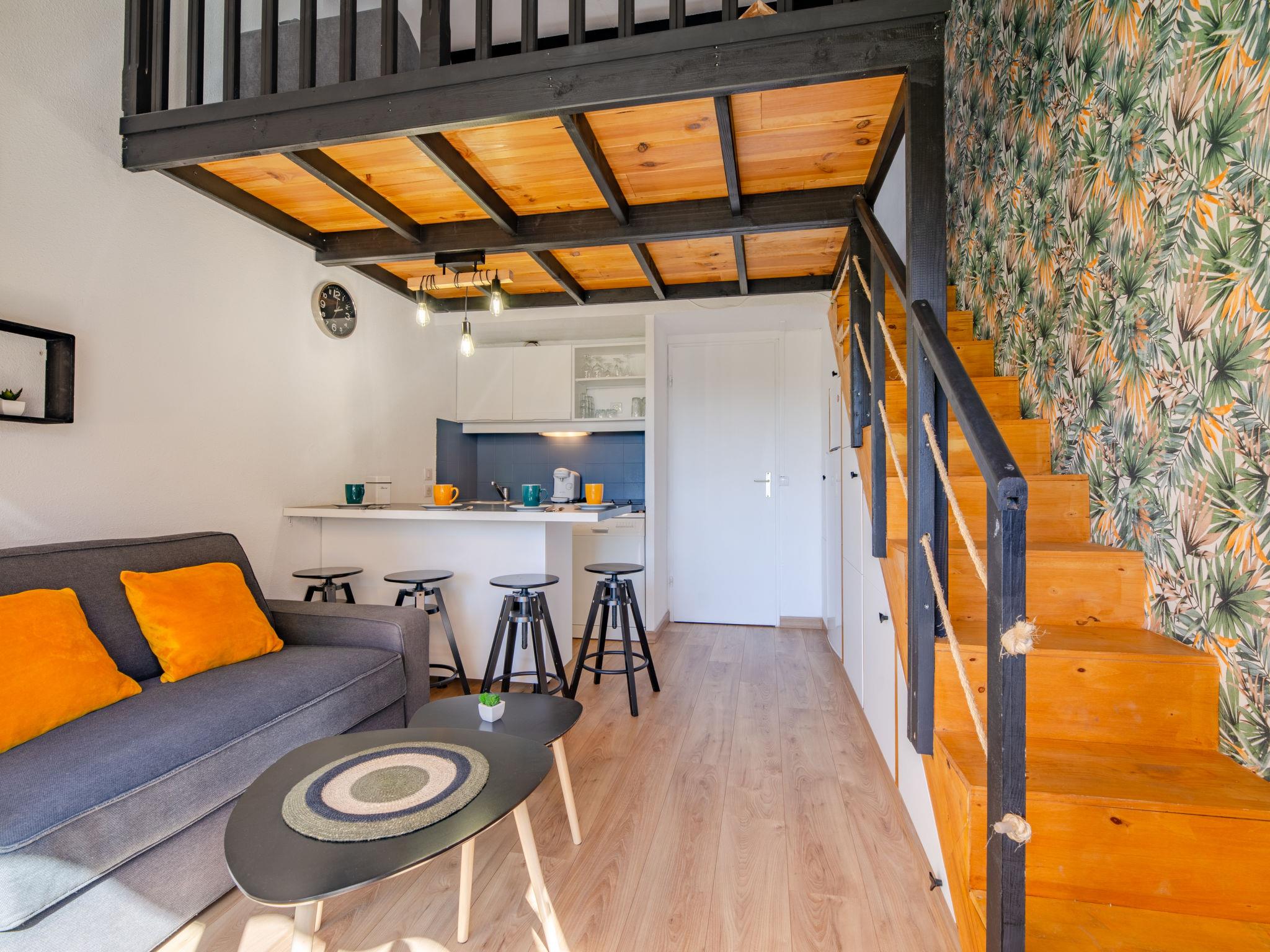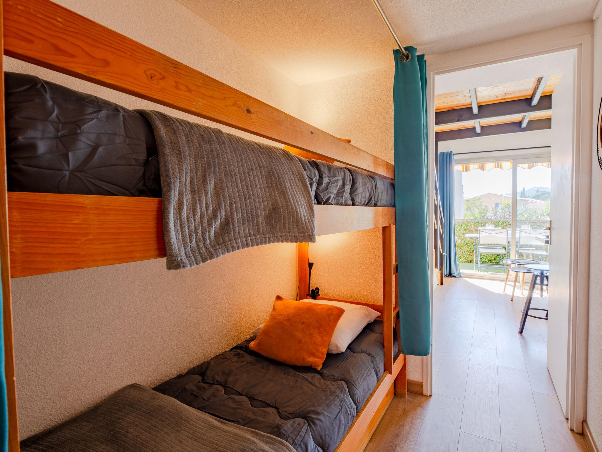 2-room studio 28 m2 on 2 levels on 1st floor, west facing position. Simple and comfortable furnishings: living/dining room with TV (flat screen). Exit to the balcony. Entrance hall with 1 x 2 bunk beds (70 cm, length 190 cm). Small, open kitchen (dishwasher, 2 induction hot plates, toaster, kettle, microwave, freezer, electric coffee machine). Bath/WC. Air-conditioning, forced-air heating. Upper floor: 1 open room with sloping ceilings with 1 french bed (140 cm, length 190 cm). Small balcony 8 m2, west facing position. Balcony furniture. View of the garden. Facilities: washing machine, iron, hair dryer. Internet (WiFi, free). Parking space n 120 (fenced). Please note: non-smokers only. Smoke alarm, no lift. Offer by a private individual according to Art. 155, IV of CGI. 83107002563JB