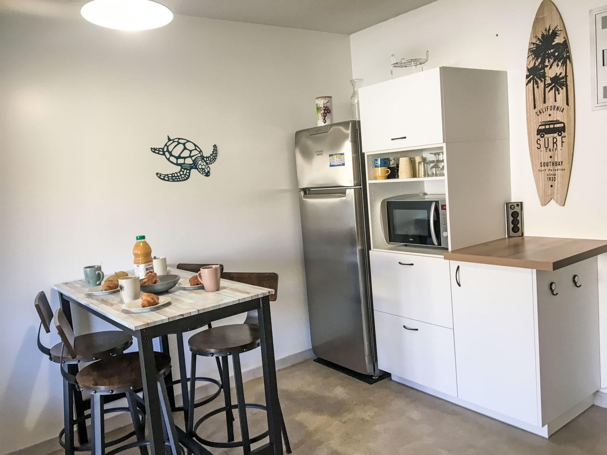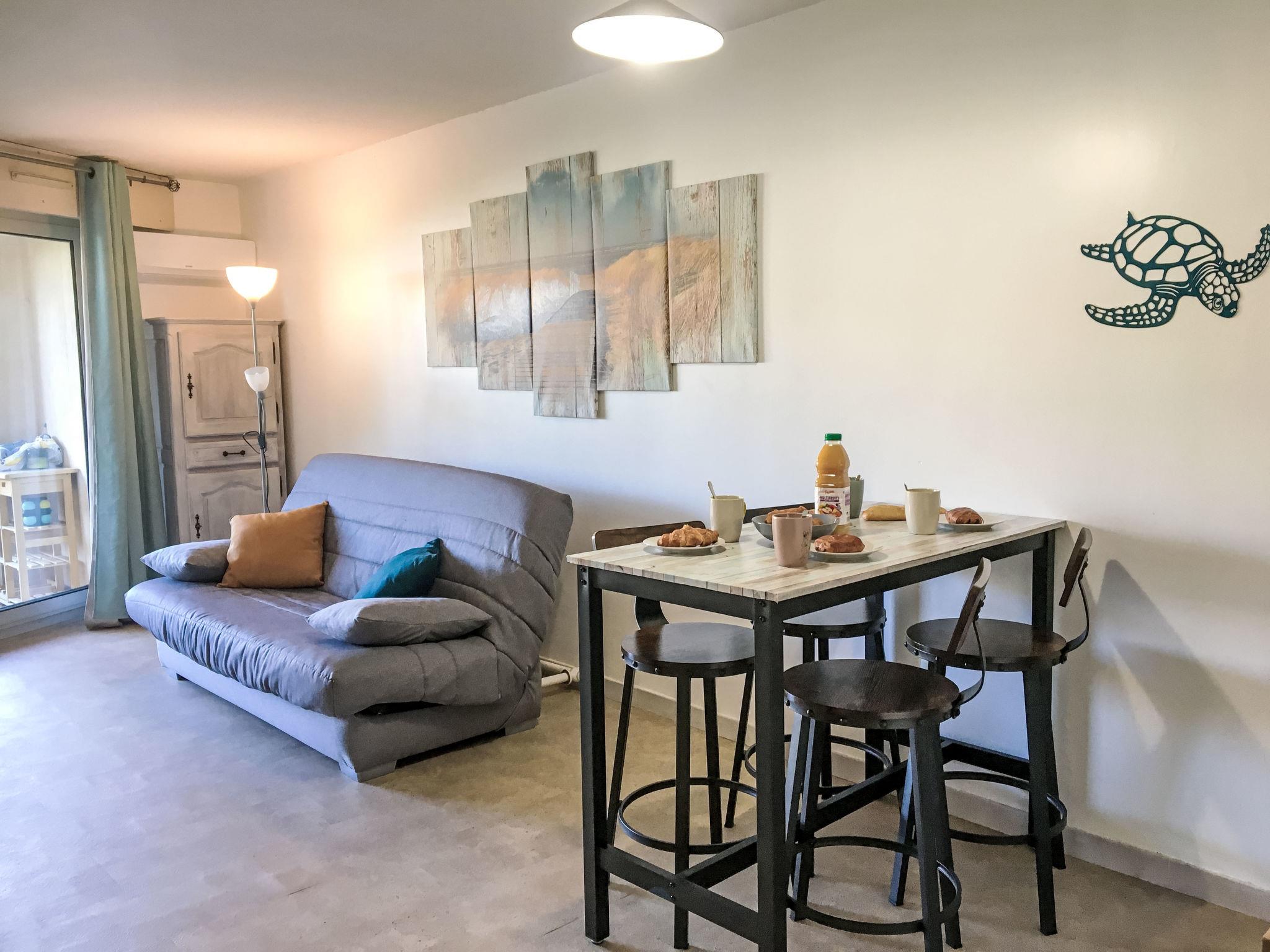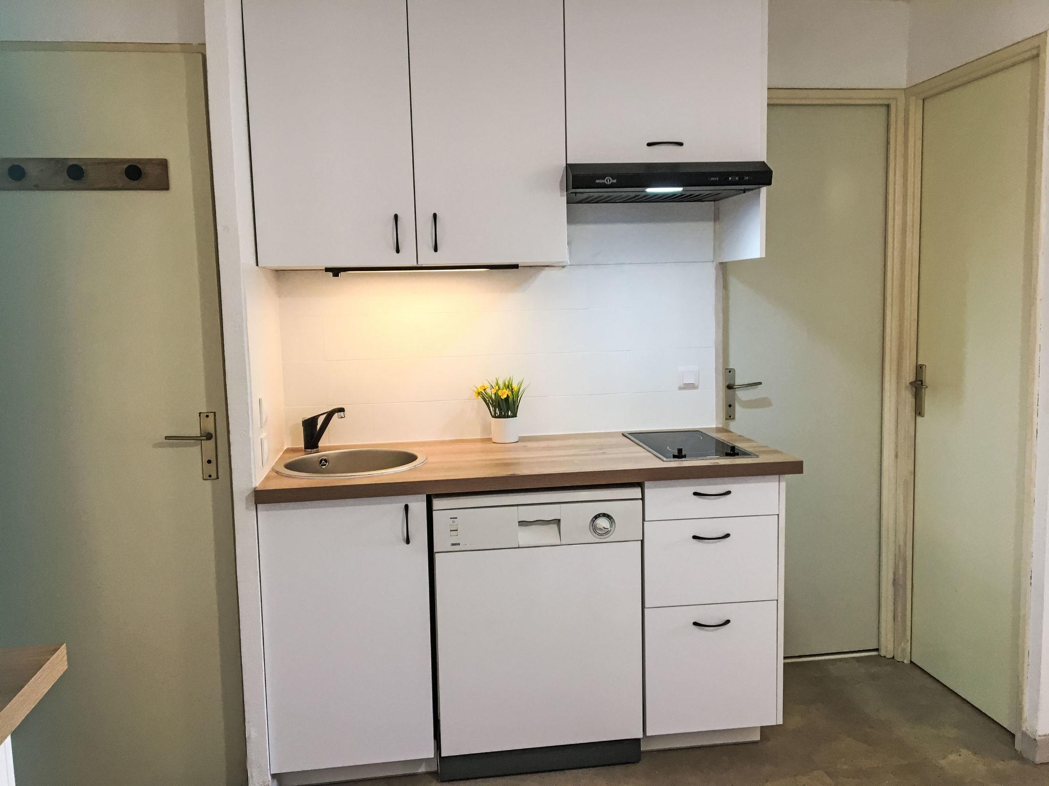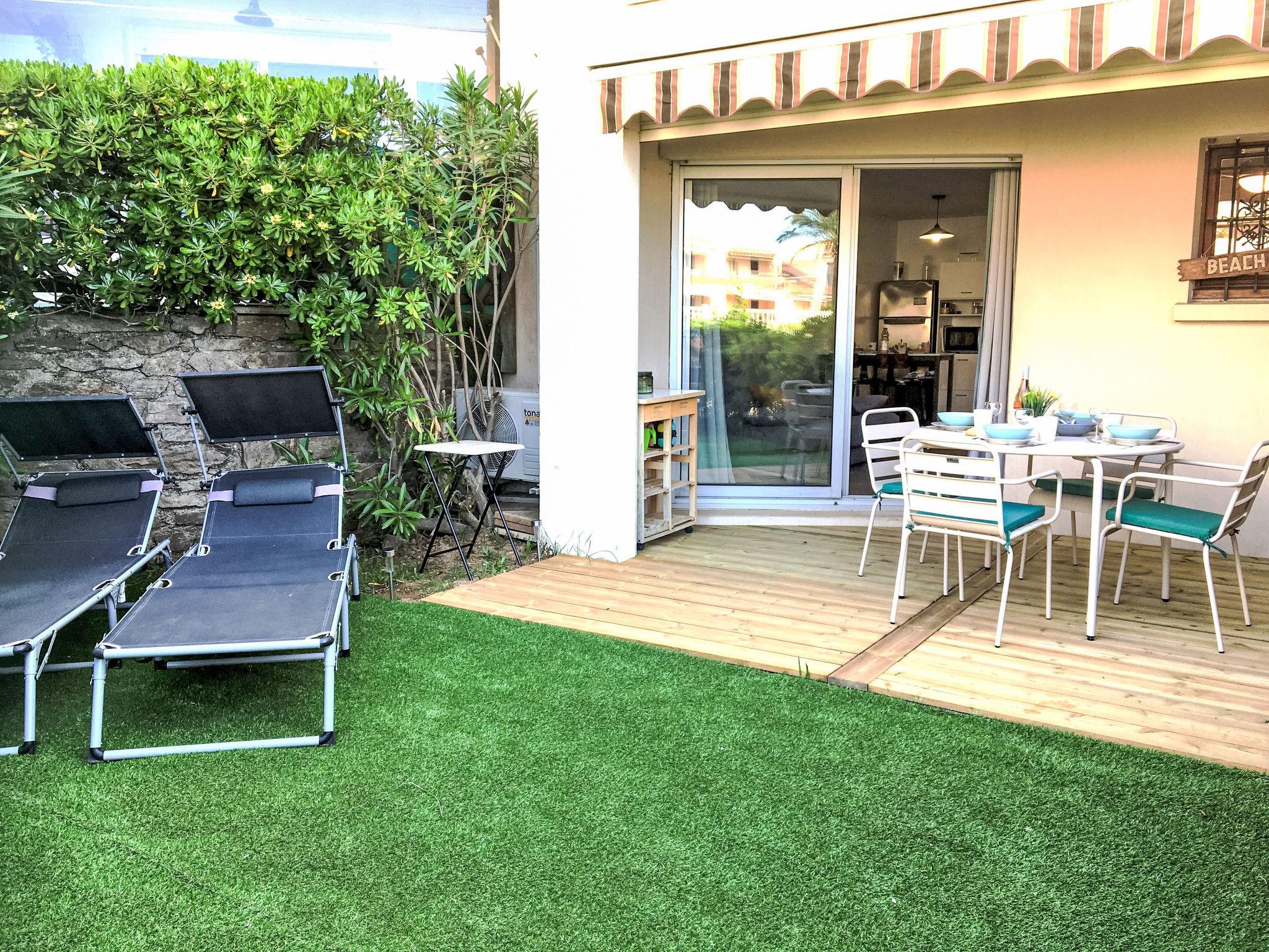2-room apartment 30 m2, on the ground floor. Renovated in 2024, simple and comfortable furnishings: living/dining room with 1 double sofabed (140 cm, length 190 cm), dining table and TV (flat screen), air conditioning. Exit to the terrace, to the patio. 1 small room with 1 french bed (140 cm, length 190 cm). Kitchenette (dishwasher, 2 ceramic glass hob hotplates, toaster, kettle, electric coffee machine, combination microwave). Shower, sep. WC. Electric heating. Terrace 10 m2, roofed, west facing position, patio 15 m2. Terrace furniture. View of the garden. Facilities: washing machine. Internet (WiFi, free). Parking space n G5. Please note: non-smokers only. Maximum 1 pet/ dog allowed. Smoke alarm. 83107000341GG