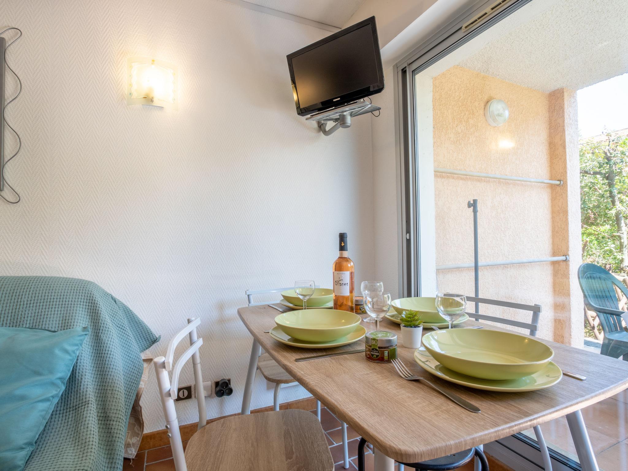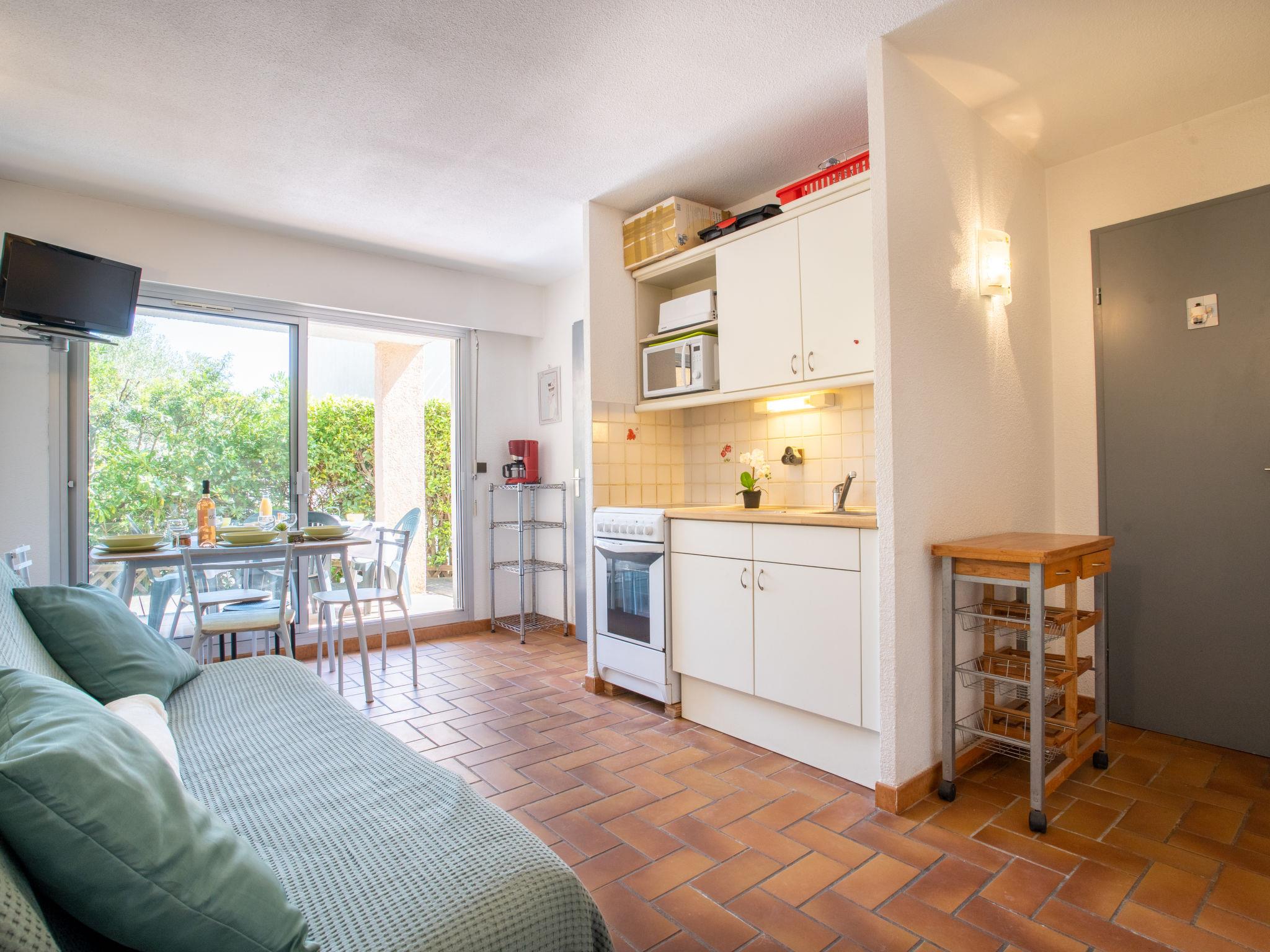 2-room apartment 25 m2, on the ground floor, south-east facing position. Simple furnishings: living/dining room with panoramic window with 1 double sofabed (1 x 160 cm, length 190 cm), TV and fan. Exit to the terrace. 1 room with 1 french bed (1 x 140 cm), fan. Kitchenette (oven, 4 induction hot plates, toaster, microwave, freezer, electric coffee machine, Capsules for coffee machine (SENSEO) extra). Shower/WC. Heating. Terrace, south facing position. Terrace furniture. Facilities: washing machine, iron. Internet (WiFi, extra). Parking space n 386. Please note: maximum 1 pet/ dog allowed. TV only FR. Smoke alarm. 83107000367W7