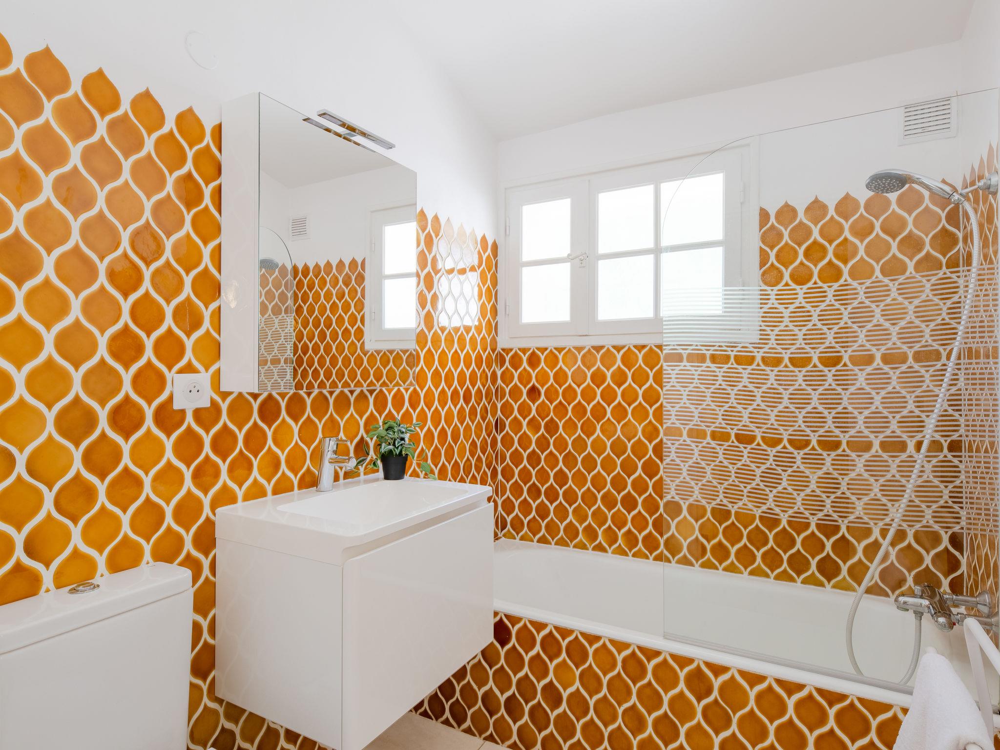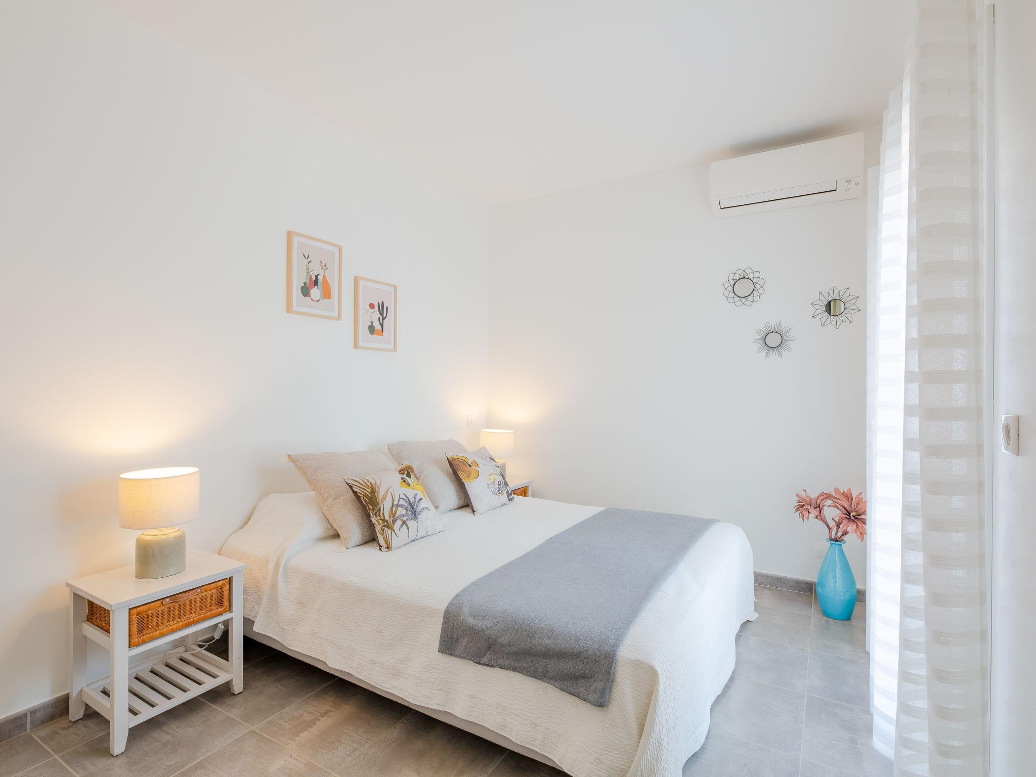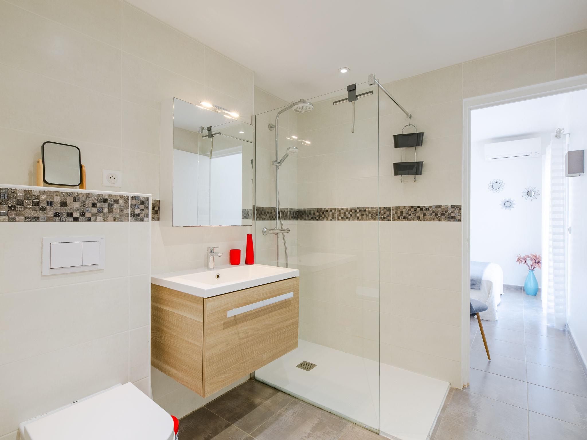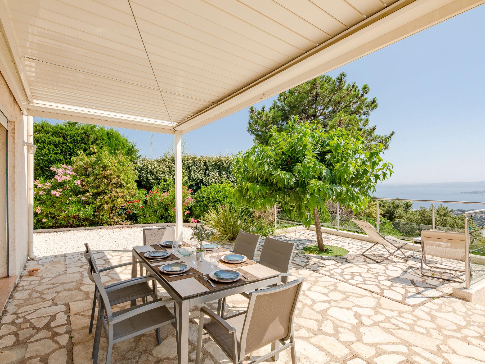 4-room villa 110 m2 on 2 levels. Comfortable and beautiful furnishings: entrance hall. 1 room with 1 french bed (160 cm, length 200 cm), bath/WC and air conditioning. 1 room with 2 beds (90 cm, length 190 cm), shower/WC. On the lower ground floor: living/dining room with panoramic window with open-hearth fireplace (only for decoration), TV (flat screen), air conditioning. Exit to the terrace. 1 room with 1 french bed (160 cm, length 200 cm), shower/WC and air conditioning. Exit to the garden. Kitchen (oven, dishwasher, 3 induction hot plates, toaster, kettle, microwave, electric coffee machine) with dining table. Electric heating. Terrace 220 m2, south facing position and west facing position. Terrace furniture, deck chairs (6). Very beautiful view of the sea. Facilities: washing machine, baby cot for up to 2 year olds. Internet (WiFi, free). Please note: non-smokers only. Maximum 1 pet/ dog allowed. Smoke alarm. On the ground floor, the access to the bedroom is through the laundry or from outside. 83107000673JO