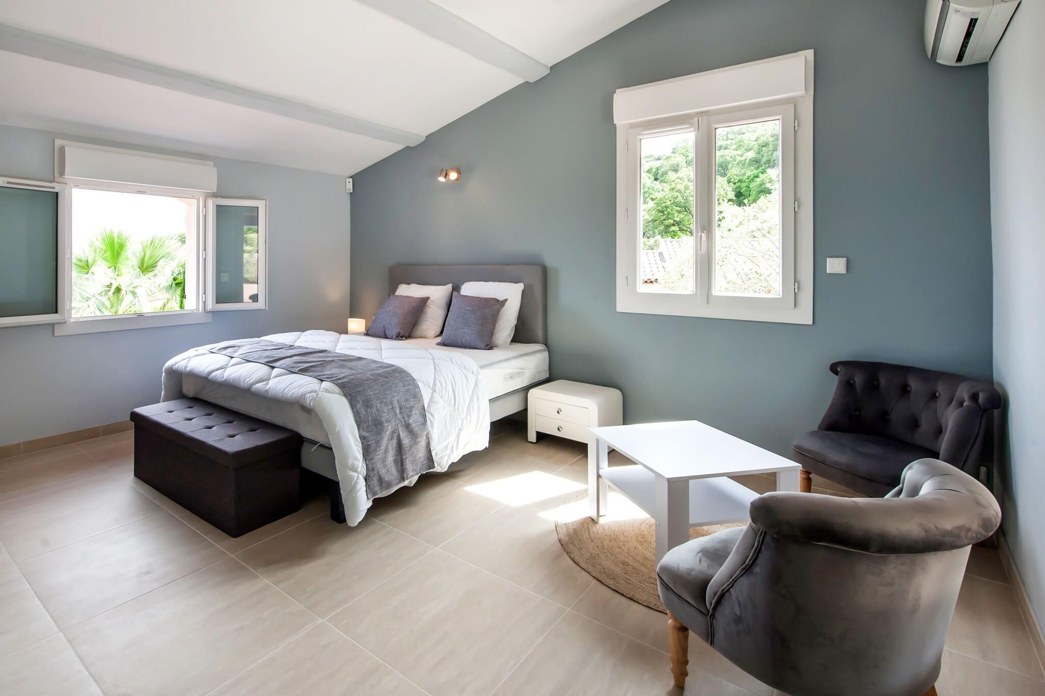 Enjoy a peaceful stay in this beautiful and spacious villa in Les Issambres that was specially designed for large families. This recently renovated luxury home has a sauna and a heated pool (March 15 to October 15), secured with controlled access by parents and an outdoor shower. The terrace is equipped with a summer kitchen with refrigerator and plancha and is furnished for family meals with a magnificent view of the sea. Inside, there is a sauna with separate shower and toilet, a gym with yoga mats, treadmills and air bikes, a lounge with TV, books, board games and a pool table. The children can have fun with the swing and the slide in the garden but also in the mezzanine equipped with games, books and toys. For the babies you have at your disposal dishes, a baby bed (movable by the janitor in the room you wish, thank you to ask him in advance), a high chair, a baby playpen (90*90), a changing table, a potty, a toilet reducer and a stroller with a lying position for the toddlers The house is fully air-conditioned (except for the basement where the sauna and the fitness room are located); The five bedrooms are equipped with high quality bedding; The four parental suites, each with its own bathroom, allow you to enjoy a splendid view of the sea. On the first floor one of them has direct access to the pool and on the first floor one of them has its own terrace. There are two beaches nearby and you can do all your shopping at the supermarket located 2.5 km away. At 3.5 km you will find the center of Saint Aygulf with horse riding possibilities. The lake of Etang de Villepey is 5 km away and the city center of Les Issambres is 6 km away. Roquebrune sur Argens, where you can play golf, is 9 km away. You can park up to 4 cars for free. Our discreet but available concierge lives on the property and will be happy to help you. Do not hesitate to ask him, he knows the area very well.