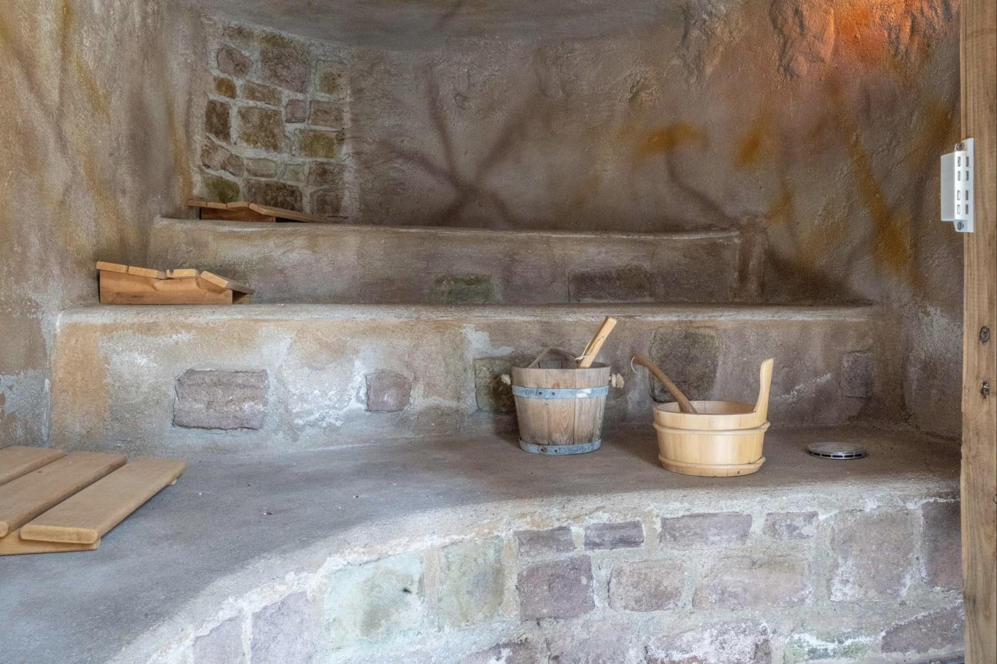Ground floor: (hallway, Bedroom with bathroom(bunk bed, TV(cable), air conditioning), Bedroom with bathroom(double bed(180 x 200 cm), TV(cable), air conditioning), Bedroom with bathroom(2x small double bed(120 x 200 cm), TV(cable), air conditioning), Bedroom with bathroom(double bed(160 x 200 cm), TV(cable), air conditioning), storage(tumble dryer, washing machine), carport, 2x single folding bed(90 x 200 cm), 2x single sofa bed(90 x 200 cm), garden(fenced, > 1000 m2), garden furniture, BBQ(charcoal), 2x children's bed, high chair) On the 1st floor: (Living room(stove, terrace), dining room(TV(satellite)), open kitchen(cooker(5 ring stoves, induction), 2x coffee machine(cups, filter), oven, grill, microwave, dishwasher, fridge(american)), bedroom, toilet) sauna(reachable from the outside), Bubble bath(reachable from the outside), terrace, swimming pool(private, heated, fenced, water alarm, 11 x 6 m.)
