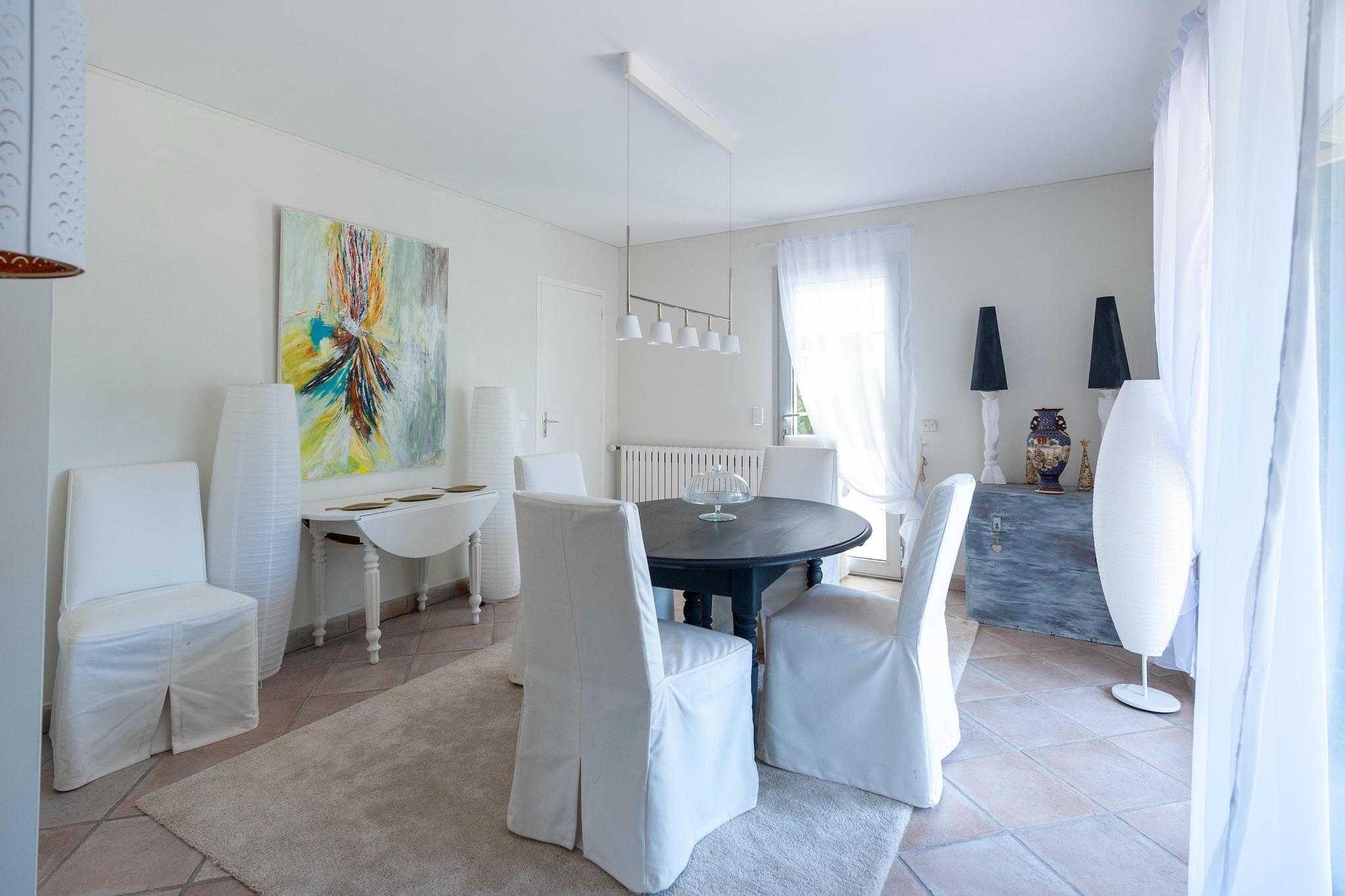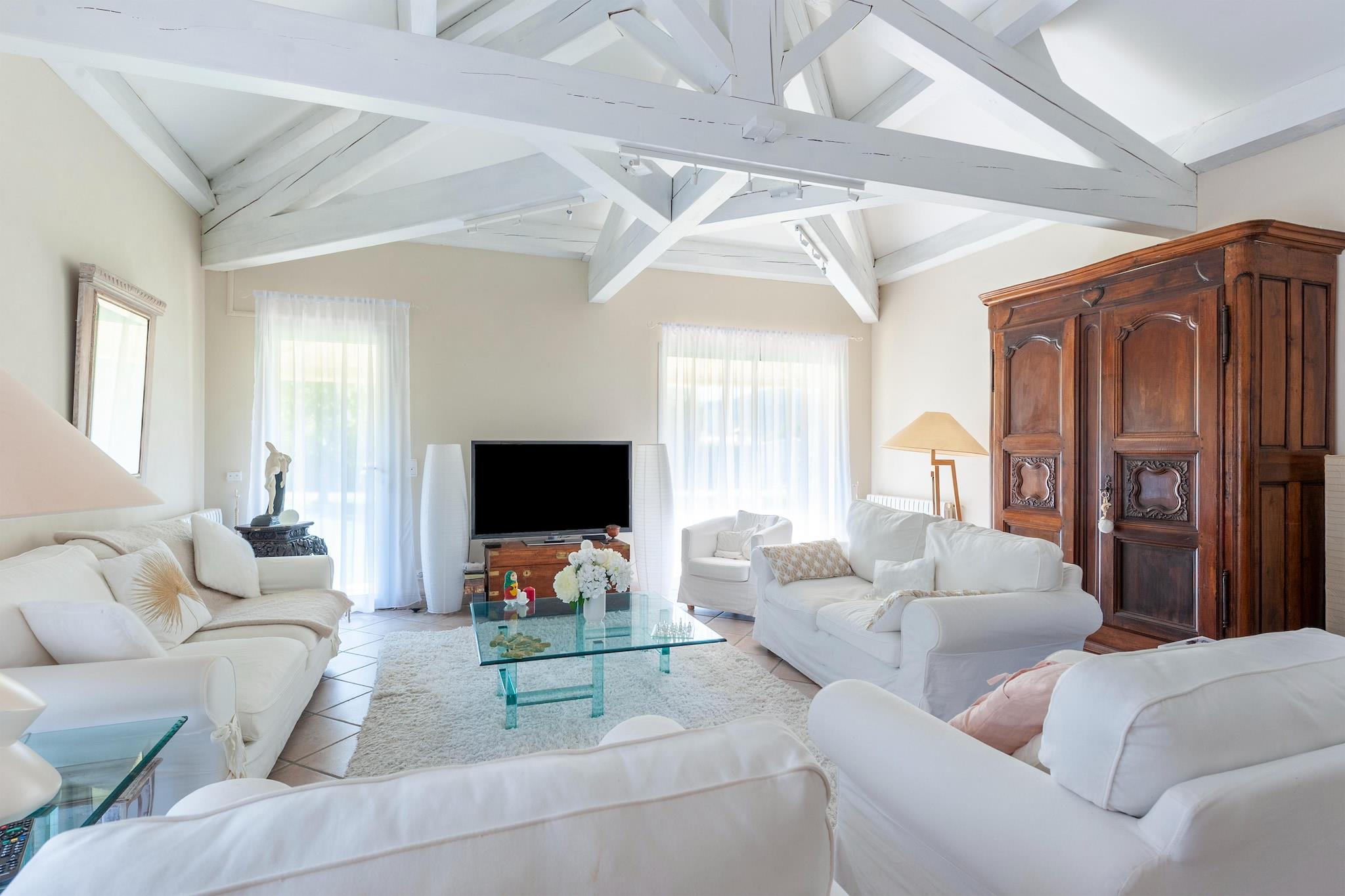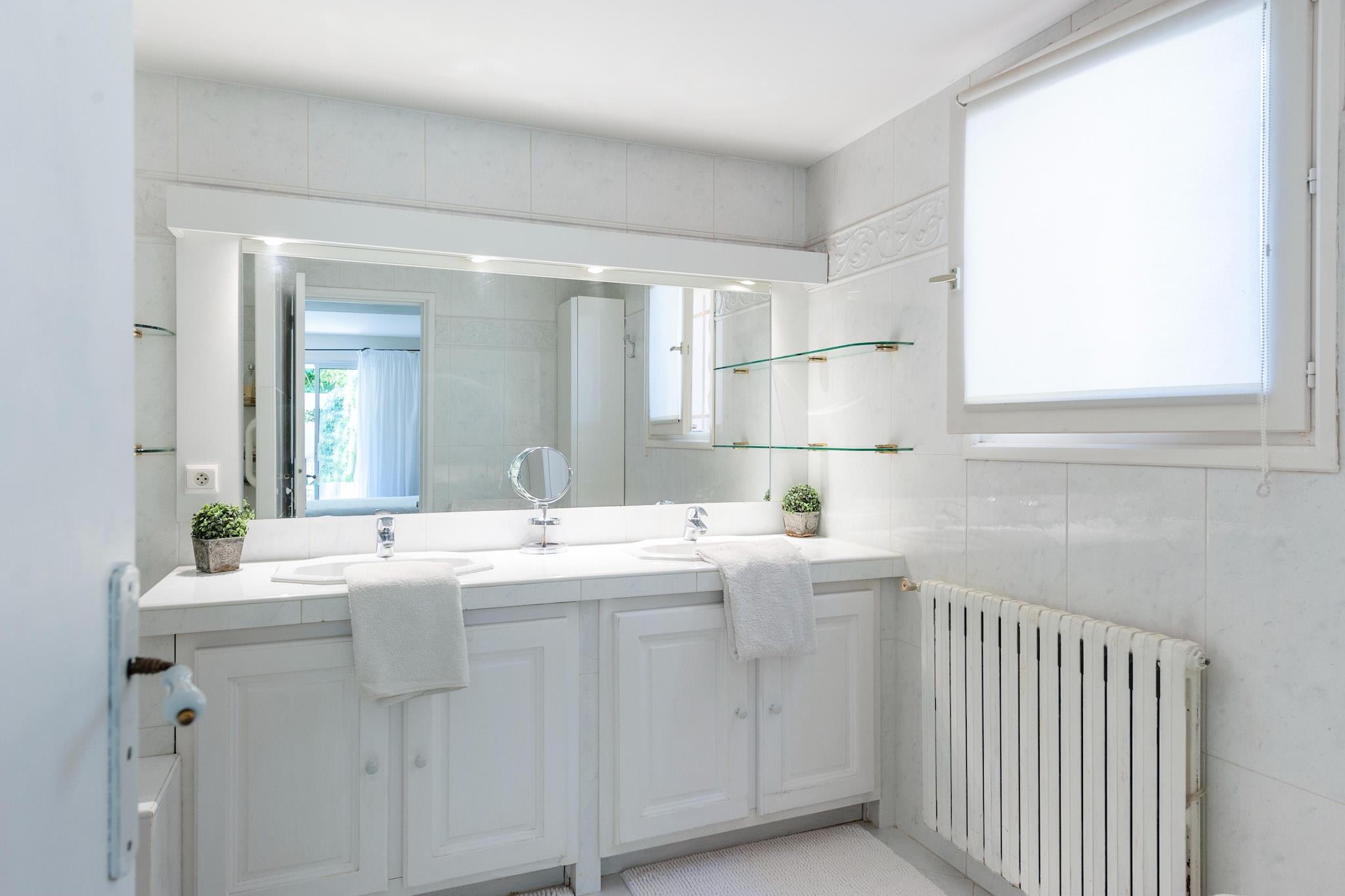 Ground floor: (Living room(TV, seating area), dining room(dining table(6 persons)), Kitchen(electric kettle, toaster, hood, coffee machine(espresso, filter), oven, microwave, dishwasher, fridge-freezer), Bedroom with bathroom(double bed(160 x 200 cm), TV, shower, washbasin, toilet), Bedroom with bathroom(double bed(160 x 200 cm), TV, bathtub with shower, washbasin, toilet), toilet, hall) On the 1st floor: (bedroom(double bed(200 x 160 cm), TV), bathroom(bath tub, washbasin), toilet, Landing) garden doors, garden furniture, sun loungers, BBQ(gas), parking, lounge set