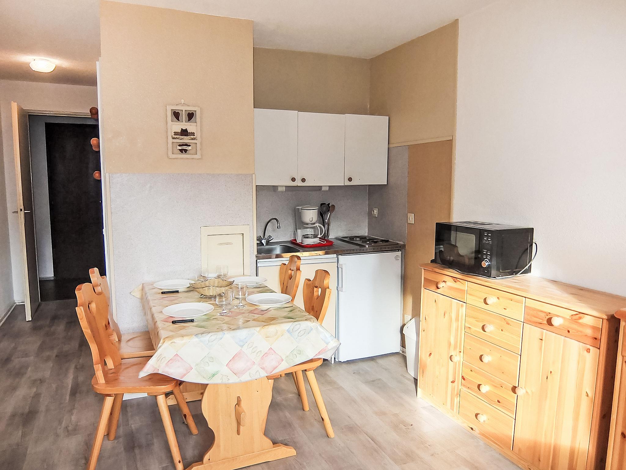 "Asters 804 Bâtiment C5", 1-room apartment 24 m2 on 3rd floor. Living/dining room with 1 double sofabed (160 cm, length 190 cm), TV (flat screen). Sleeping alcove with 1 x 2 bunk beds (70 cm, length 190 cm). Kitchenette (2 hot plates, kettle, microwave, electric coffee machine). Bath/WC. Electric heating. Balcony, south facing position. Facilities: Internet (WiFi, extra). Please note: maximum 1 pet/ dog allowed. Smoke alarm. Building C5. Apartment is on entrance level. Instead of an enclosed bedroom, some sleeping areas are located in an open-plan area (gallery, alcove, etc.). 73257007961WF