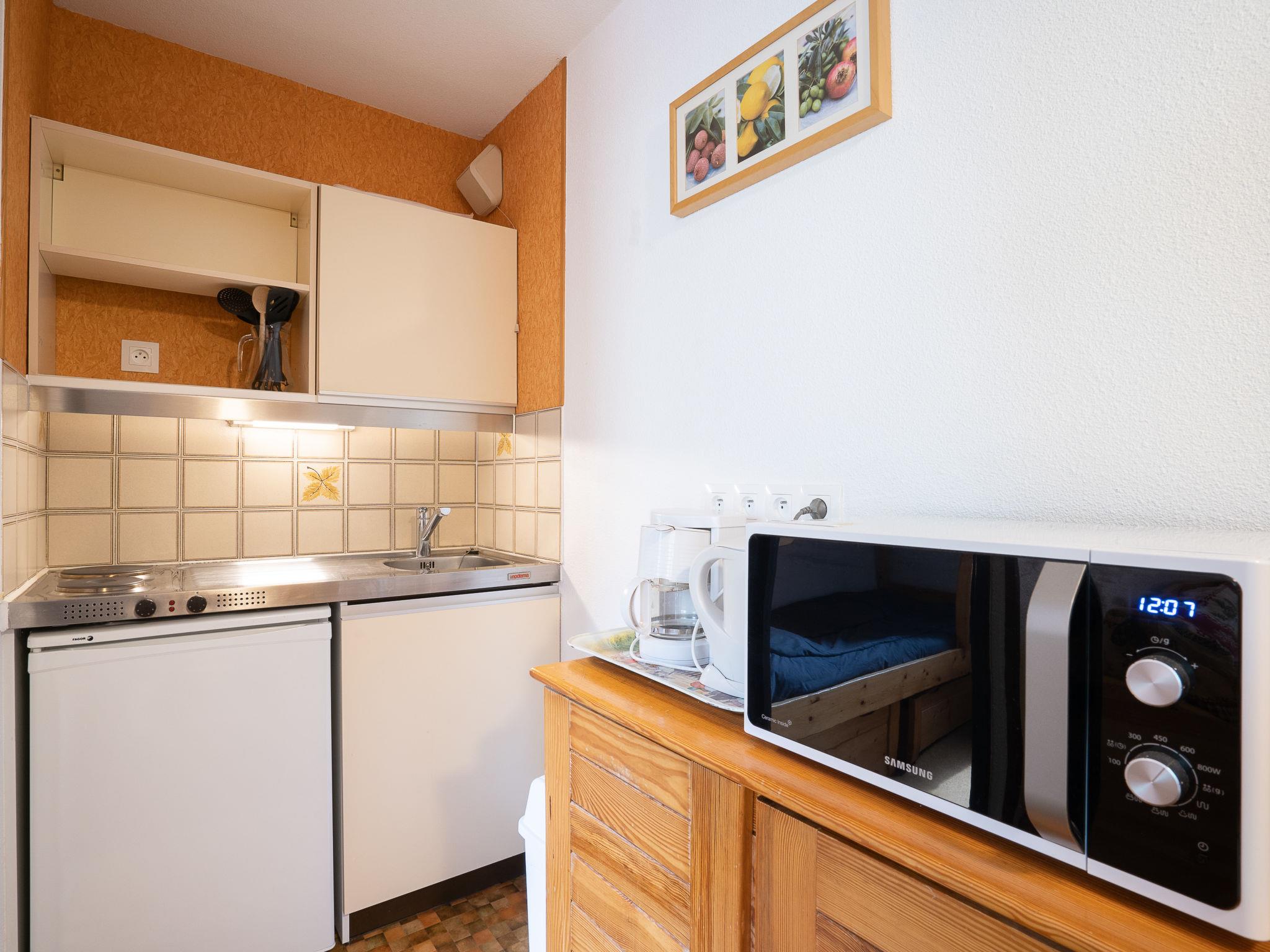 "Astragale 412 A", 1-room apartment 24 m2 on 1st floor. Beautiful furnishings: living/dining room with 1 pull-out bed (2 pers. 2 x 80 cm, length 190 cm), TV (flat screen). Sleeping alcove with 1 x 2 bunk beds (80 cm, length 190 cm). Kitchenette (2 hot plates, kettle, microwave, electric coffee machine). Bath/WC. Electric heating. Balcony, west facing position. Beautiful view of the mountains and the ski run. Facilities: Internet (WiFi, extra). Please note: smoke alarm. Instead of an enclosed bedroom, some sleeping areas are located in an open-plan area (gallery, alcove, etc.). 73257004493WF